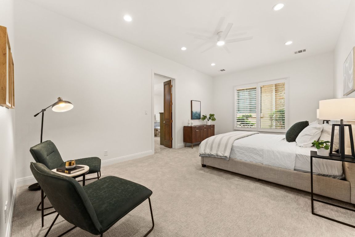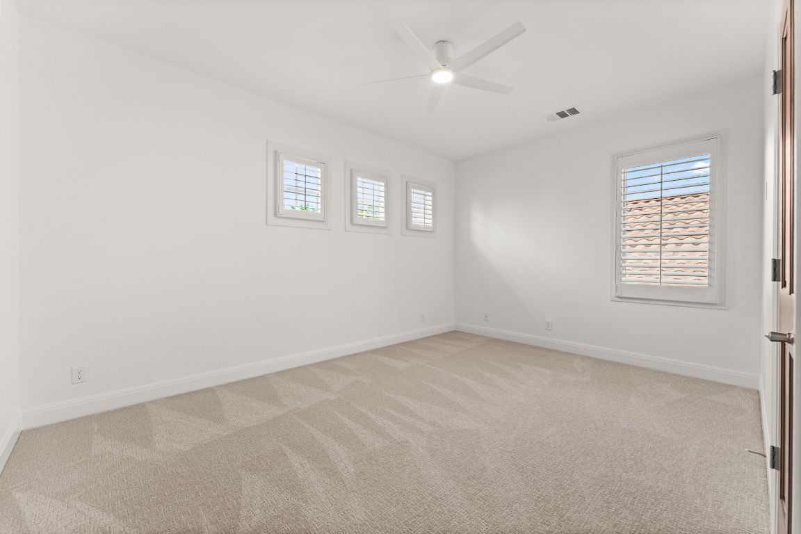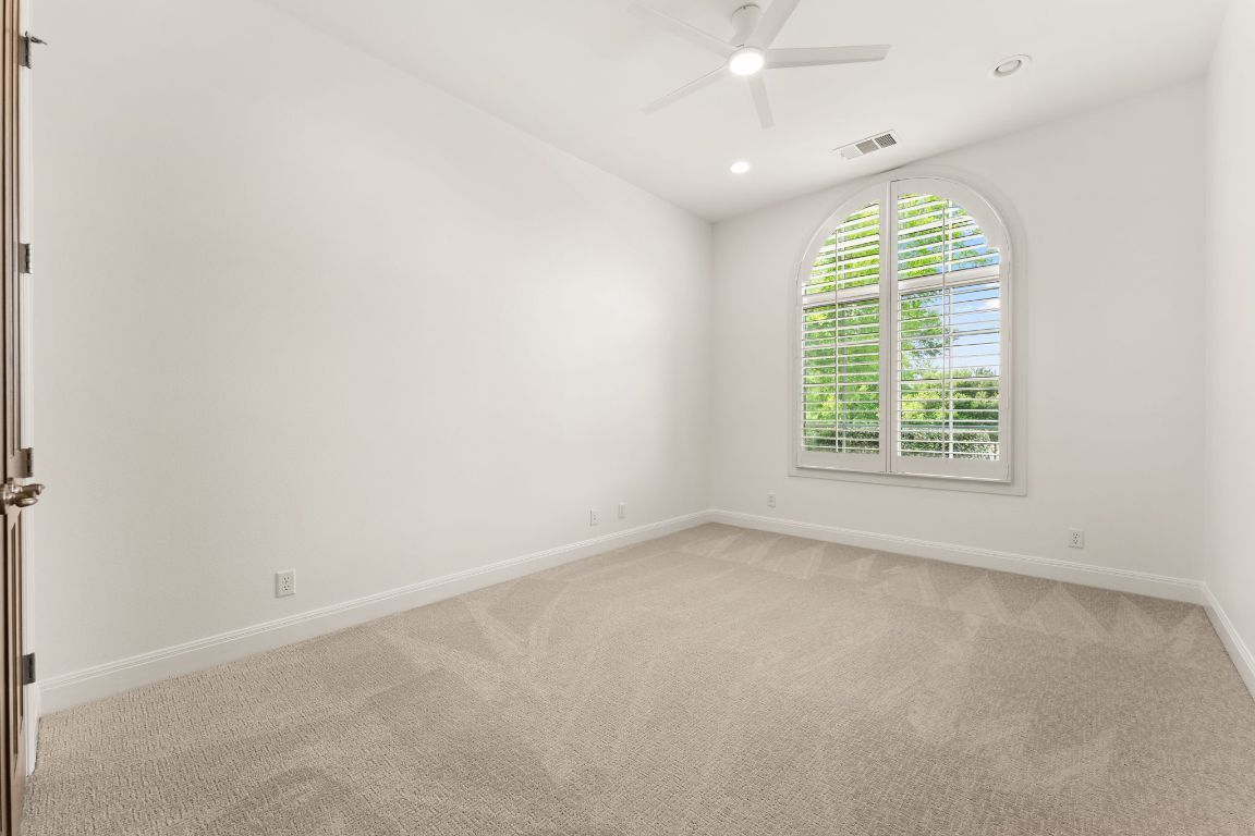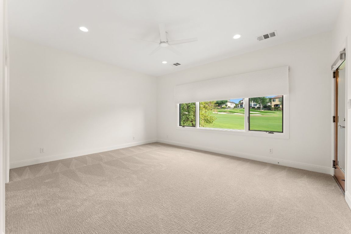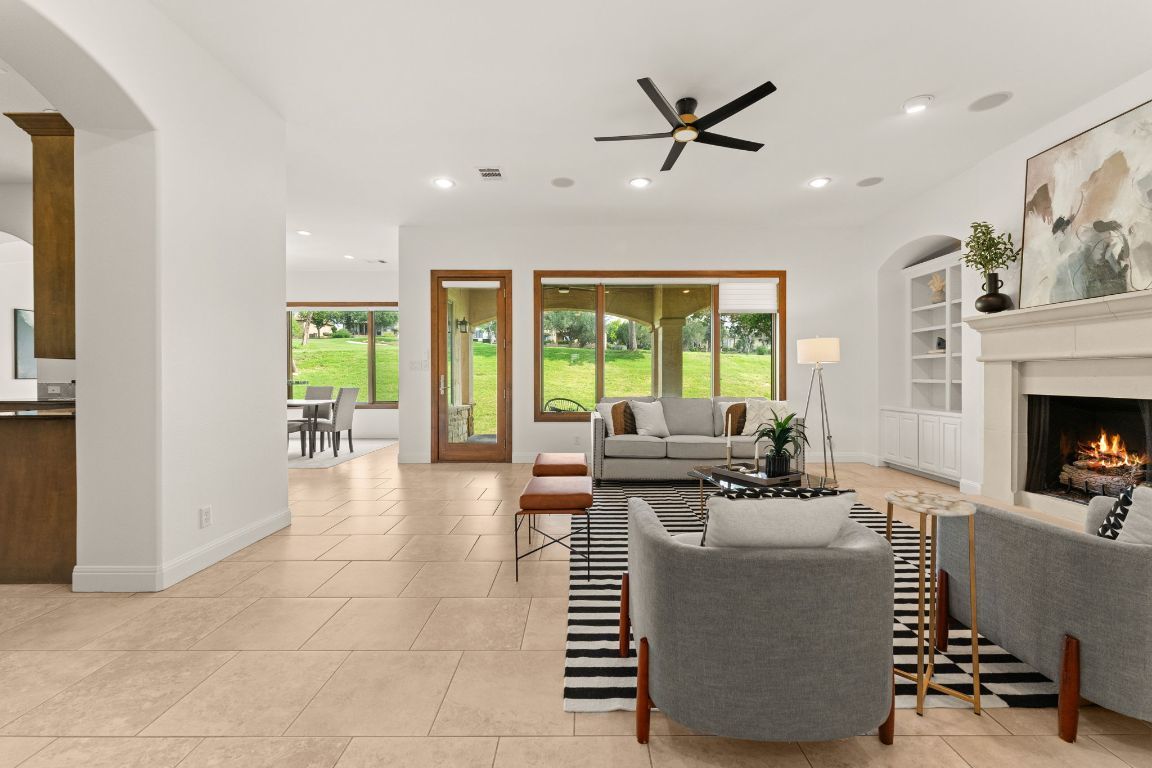 Gorgeous golf course views, two covered patios, and thoughtful updates throughout define this beautifully maintained home in the gated community of Flintrock Falls. Located on a quiet cul-de-sac overlooking the 13th fairway of a Jack Nicklaus-designed course, this property offers privacy, flexibility, and a lock-and-leave lifestyle with yard maintenance included in the HOA. The main level features a spacious primary suite with two large walk-in closets, a jetted tub, separate shower, and dual vanities, plus an additional downstairs bedroom with a full bath nearby—perfect for guests or a home office. Upstairs includes three more bedrooms, two full baths, a spacious second living area, and an enclosed sunroom with panoramic golf course views. Recent upgrades include all new interior paint, brand new hvac system upstairs, new carpet, and updated light fixtures and ceiling fans throughout. The kitchen offers granite countertops, stainless appliances, and ample cabinetry with open flow to the living and dining areas. Wood-framed windows along the back of the home bring in natural light and provide beautiful golf course views. Outdoor living includes two covered patios ideal for relaxing or entertaining. Additional highlights: tile roof, generous storage, beautiful landscaping, and access to four premier golf courses and Elevation Athletic Club. Close to dining, shopping, Baylor Scott & White, and Lakeway amenities. POA Assessments Due for the Flintrock Community: $112.50/month Additional Assessments due to The Villas: $300/month *Minimum of a social membership is required at The Country Club - starting cost: $143 (plus tax)/month.