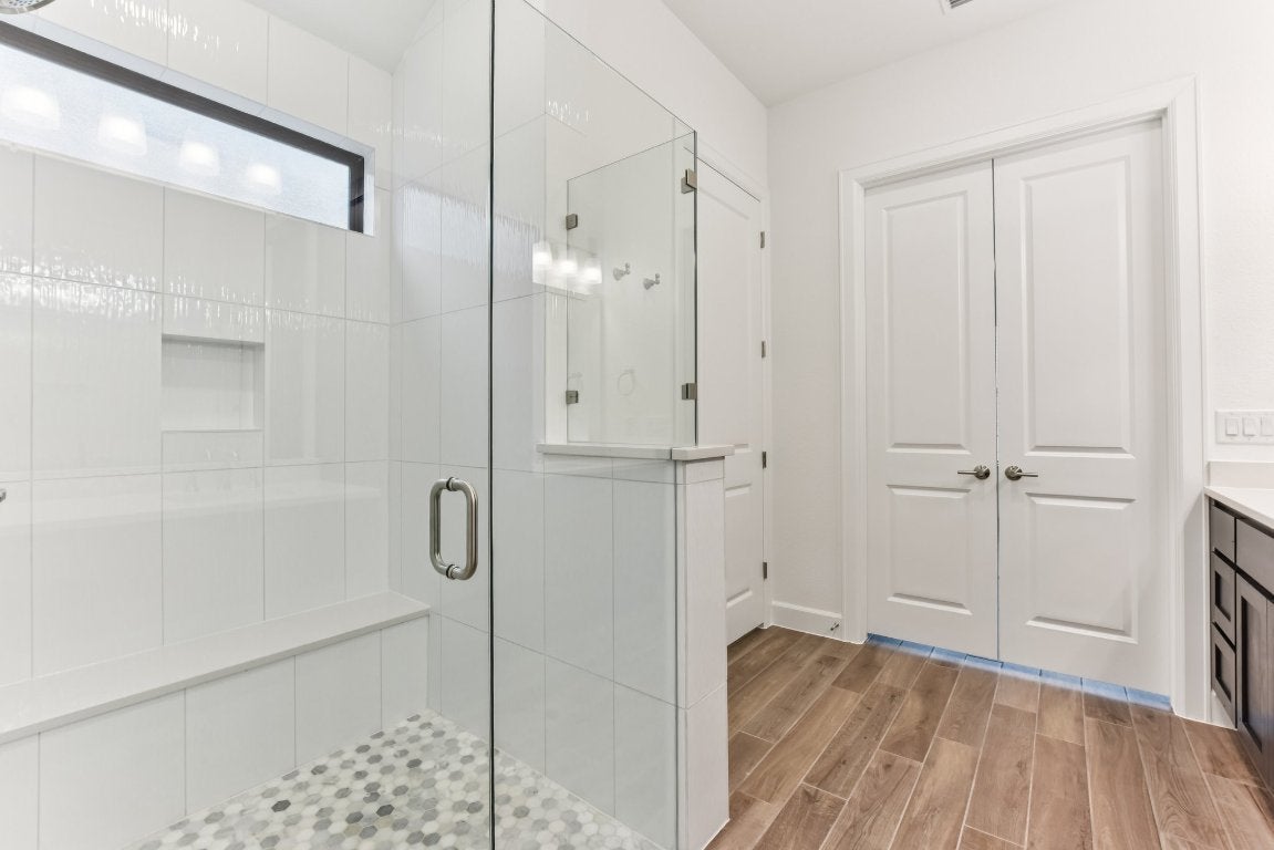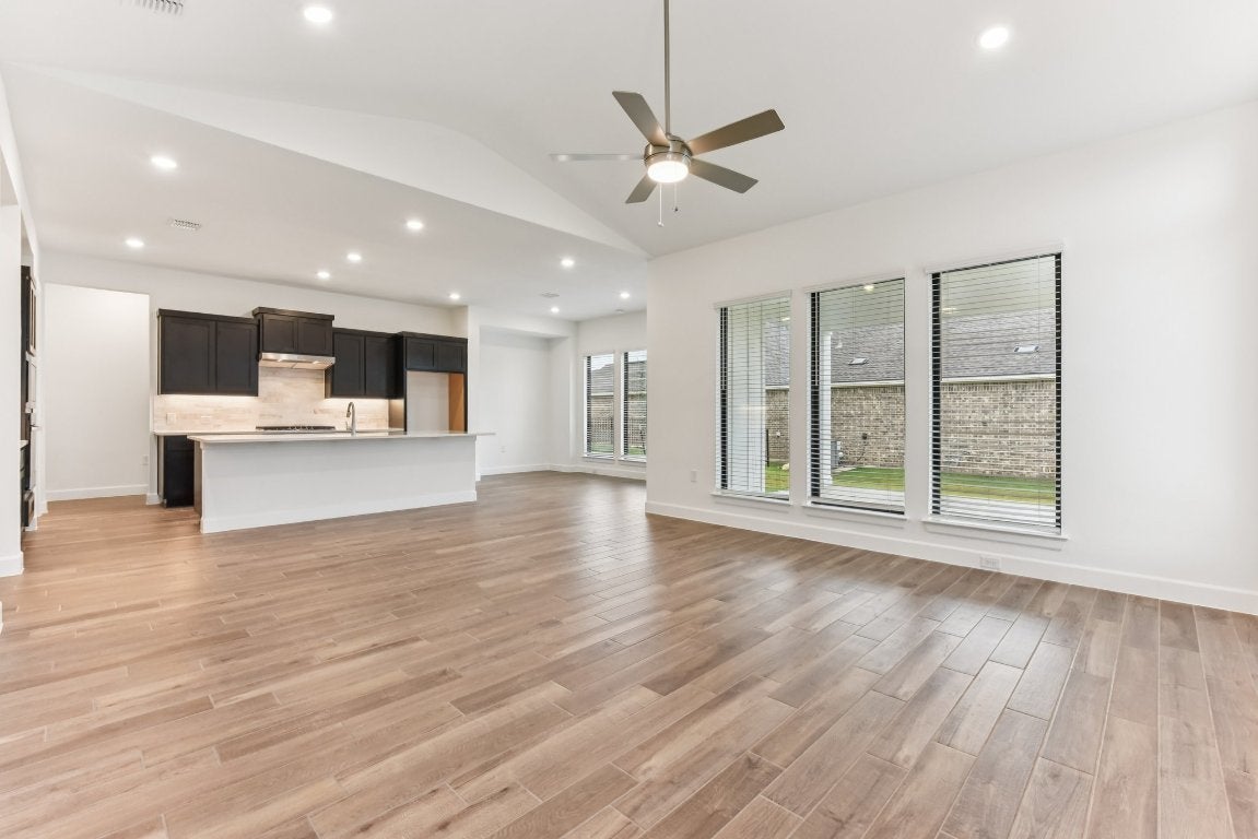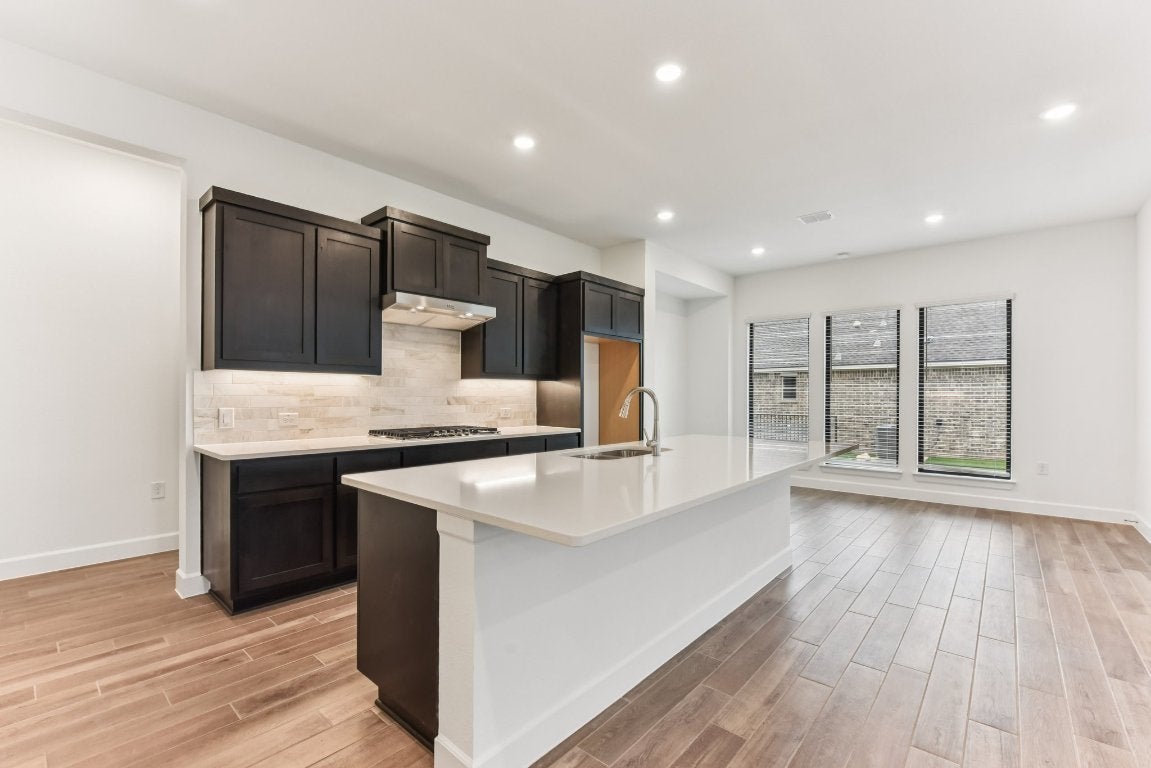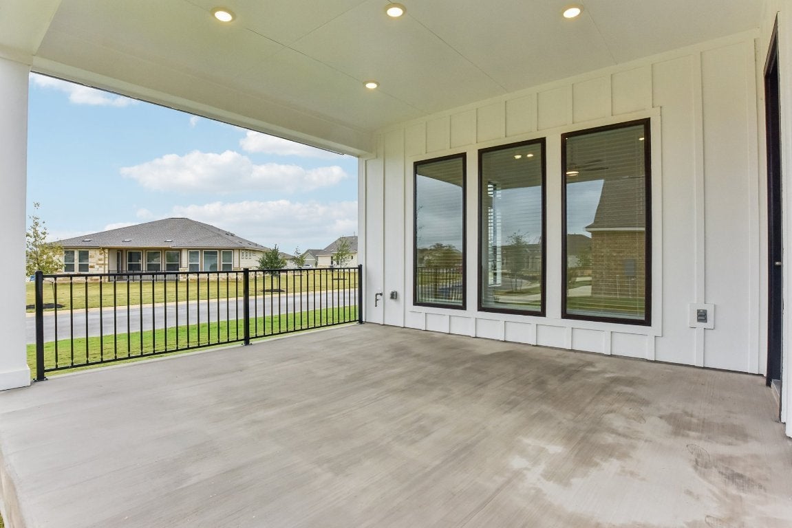 Auburn plan with upgraded kitchen, quartz countertops, tile flooring, tray ceilings in entry and master, optional study with double doors, optional half bath, optional cabinets in utility room with sink, upgraded bronze framed windows, 4' garage extension, enlarged covered patio
