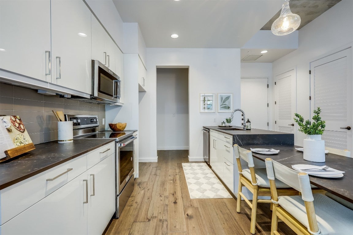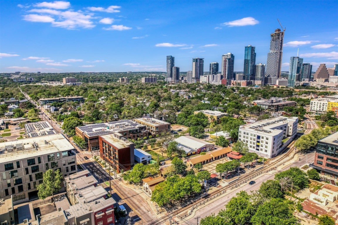 Tucked into the architect-designed Foundry Residences, this incredible unit offers more than just a place to live. It’s part of a low-key, high-design community of only 17 homes, with a focus on quality construction, clean lines, and thoughtful modern touches that make everyday living feel anything but ordinary. Inside, you’ll find bold 11-foot floor-to-ceiling windows that stretch across the living space and pull in the dreamiest natural light. Exposed concrete ceilings, industrial-style accents and refined finishes tell a story of style, substance, and serious attention to detail. The kitchen is refreshingly designed, featuring white cabinetry, a built-in dining ledge, and premium stainless appliances. The bedroom opens directly onto a spacious private terrace that overlooks the courtyard, giving you a quiet corner of the city to call your own. The bathroom feels like a boutique hotel, complete with a dual vanity, a soaking tub/shower, and built-in cubbies for towels, candles, or whatever else you want within arm’s reach. There’s also a laundry closet in the unit! Enjoy an assigned parking space in the gated garage (wired for an EV charger!), along with 24 hour security and access to the community fitness center. Foundry sits in the center of East Austin’s most electric zone—right in the Plaza Saltillo District, where old-school Eastside character mixes with new-school energy. Grab mezcal cocktails down the block, check out a pop-up art show, load up on fresh produce at Whole Foods or head a few blocks west and you’re already downtown. The train stops nearby, too! If you're into design-forward spaces, walkable neighborhoods, and a home that still feels comfortable, this one’s worth a serious look.