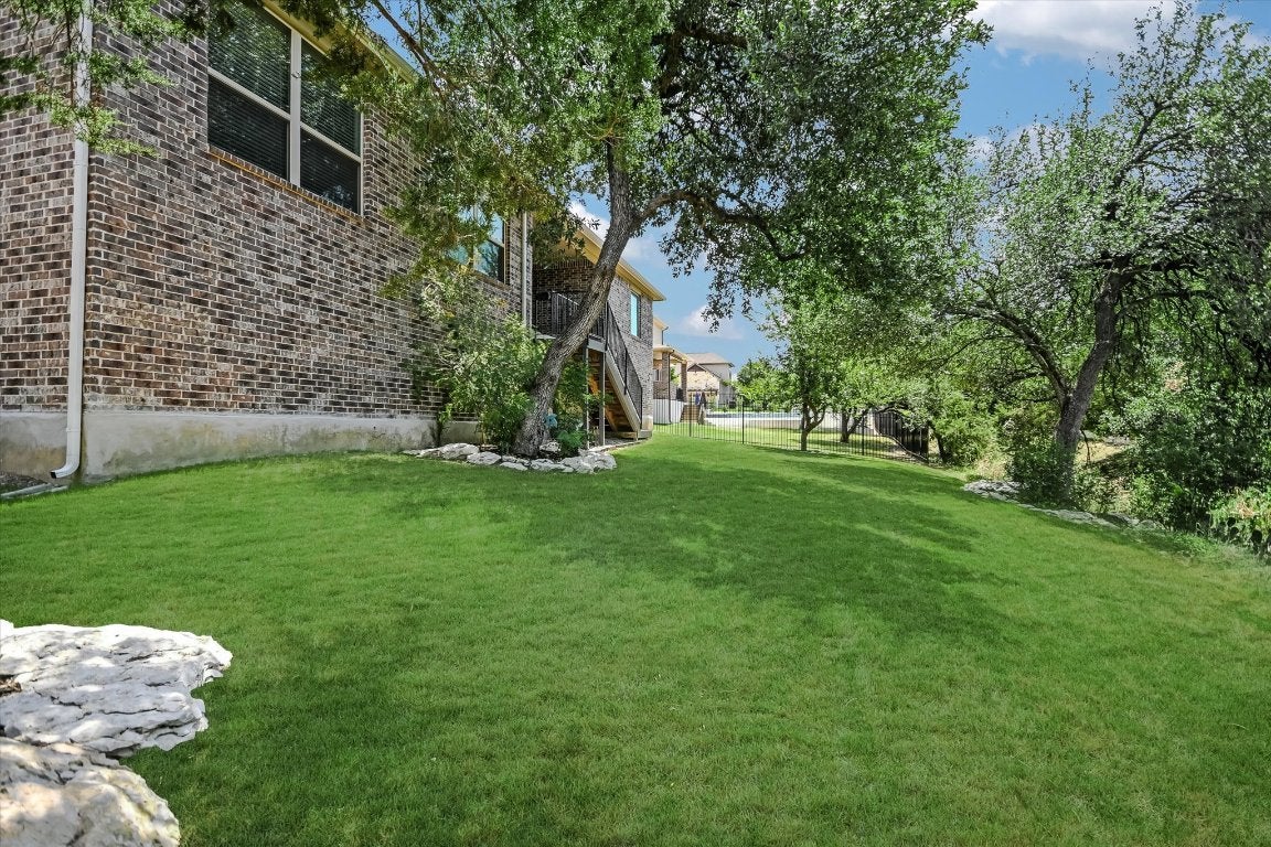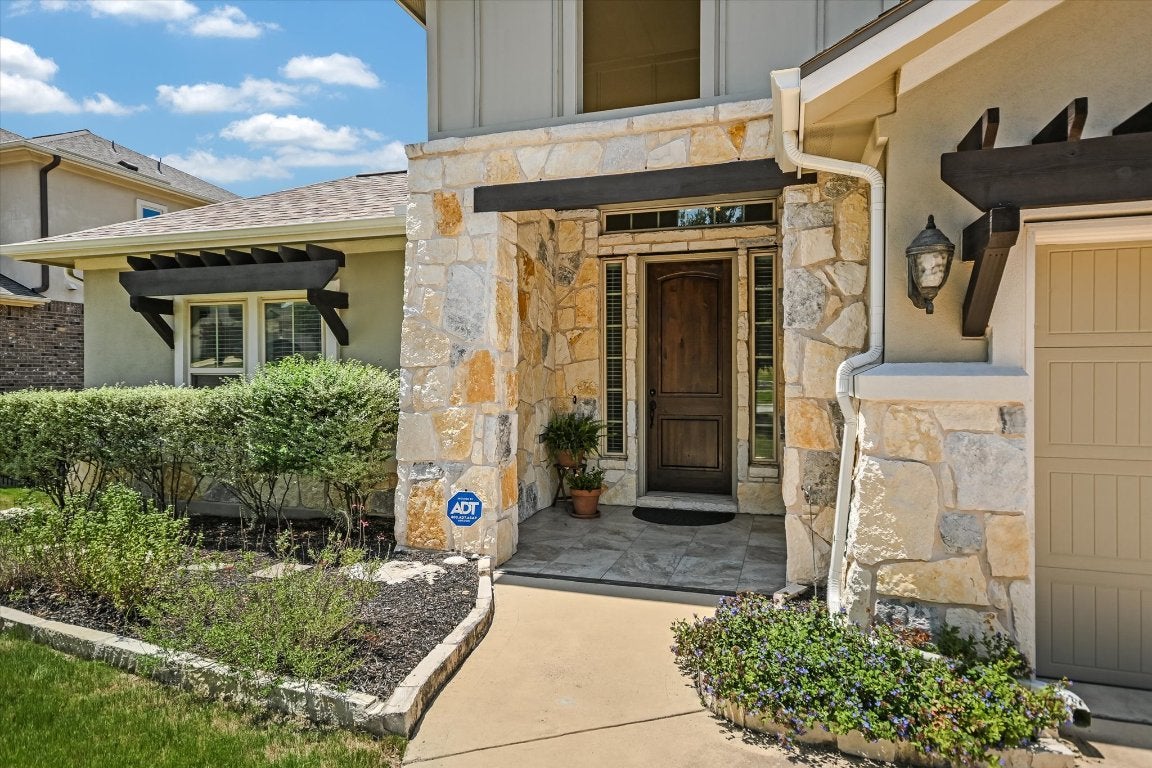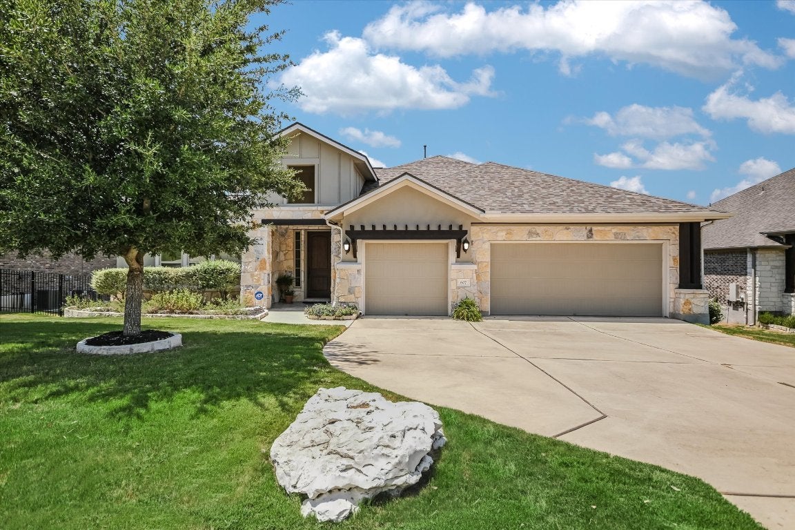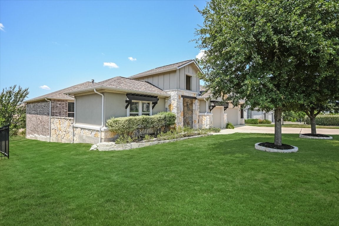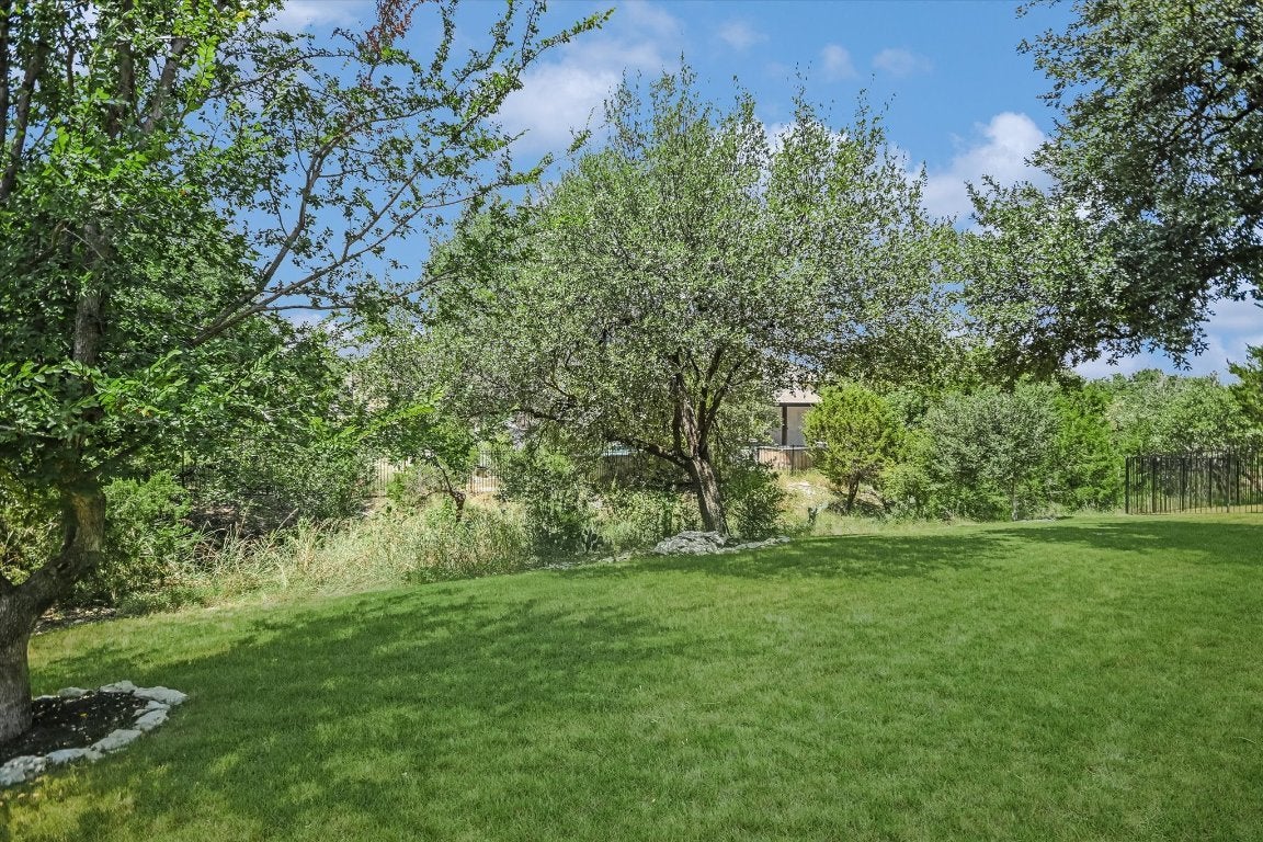 Beautiful, well-maintained 3 bedroom/3 bath plus study & 3-car garage set on lovely large lot and nestled in exclusive gated community of Abrantes in Cedar Park. Spacious open floorplan with gorgeous architectural details in this single story, East-facing home built in 2018. Private backyard with trees and "greenspace". Large covered front porch, covered patio in back, and unique courtyard on side give plenty of areas to enjoy the outside. Front porch opens to dramatic entry. French doors open to spacious study at entry. The open floor plan continues to formal dining area which is adjacent to patio doors opening to large courtyard area. The inviting living room with fireplace is open to the island kitchen and breakfast room. The large kitchen features beautiful granite countertops, tile backsplash, an abundance of painted cabinets, stainless steel appliances including double ovens, a walk-in pantry, and under cabinet lighting. The adjacent spacious breakfast room opens to the outdoor patio and second living area (multiuse--could be made into media room or used as playroom, etc.). The MIL layout features an inviting primary suite which includes an ensuite bath with dual vanities, an oversized walk-in shower, a garden tub, and two large walk-in closets. The secondary bedrooms are located on the opposite side of the home and include one bedroom w/ensuite bath and walk-in closet and another bedroom adjacent to bath w/large walk-in shower. The spacious laundry room with built-ins leads to a huge 3-car garage with floor w/polyaspartic finish. Wood-looking tile floors are throughout much of the home with tile included on porches and patio/courtyard. Many extras include alarm system, ceiling speakers, dust free air purification system, added insulation and flooring above garage, and more. Convenient location with easy access to major roadways and a variety of dining & shopping options. Near schools and wonderful parks!