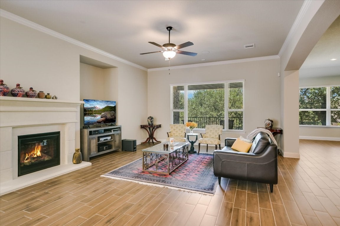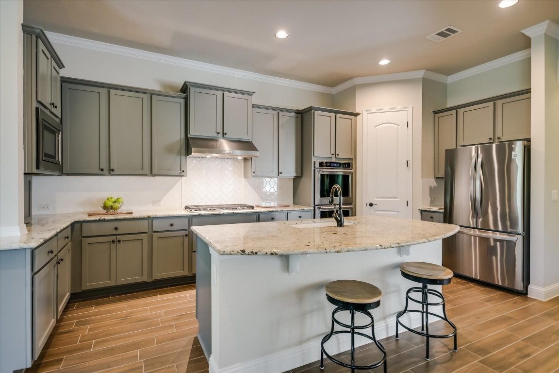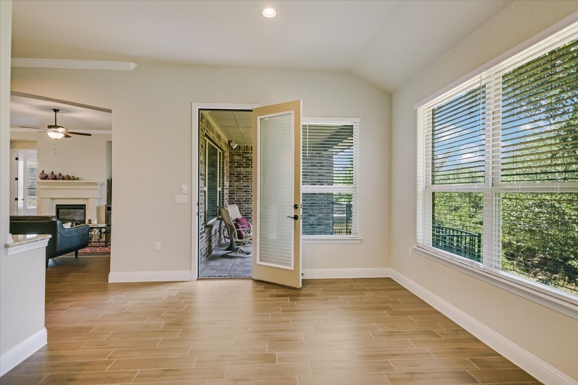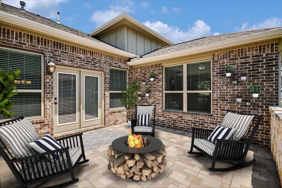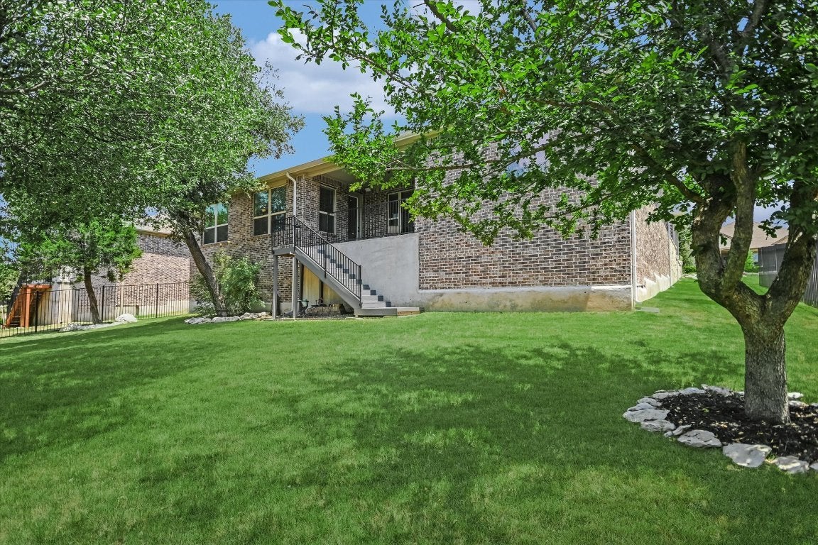 Beautiful, well-maintained 3 bedroom/3 bath plus study & 3-car garage set on lovely large lot and nestled in exclusive gated community of Abrantes in Cedar Park. Spacious open floorplan with gorgeous architectural details in this single story, East-facing home built in 2018. Private backyard with trees and "greenspace". Large covered front porch, covered patio in back, and unique courtyard on side give plenty of areas to enjoy the outside. Front porch opens to dramatic entry. French doors open to spacious study at entry. The open floor plan continues to formal dining area which is adjacent to patio doors opening to large courtyard area. The inviting living room with fireplace is open to the island kitchen and breakfast room. The large kitchen features beautiful granite countertops, tile backsplash, an abundance of painted cabinets, stainless steel appliances including double ovens, a walk-in pantry, and under cabinet lighting. The adjacent spacious breakfast room opens to the outdoor patio and second living area (multiuse--could be made into media room or used as playroom, etc.). The MIL layout features an inviting primary suite which includes an ensuite bath with dual vanities, an oversized walk-in shower, a garden tub, and two large walk-in closets. The secondary bedrooms are located on the opposite side of the home and include one bedroom w/ensuite bath and walk-in closet and another bedroom adjacent to bath w/large walk-in shower. The spacious laundry room with built-ins leads to a huge 3-car garage with floor w/polyaspartic finish. Wood-looking tile floors are throughout much of the home with tile included on porches and patio/courtyard. Many extras include alarm system, ceiling speakers, dust free air purification system, added insulation and flooring above garage, and more. Convenient location with easy access to major roadways and a variety of dining & shopping options. Near schools and wonderful parks!