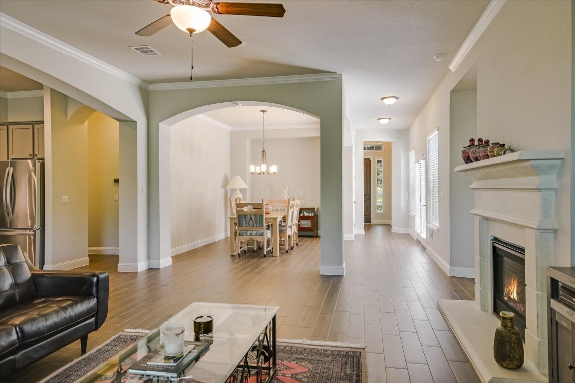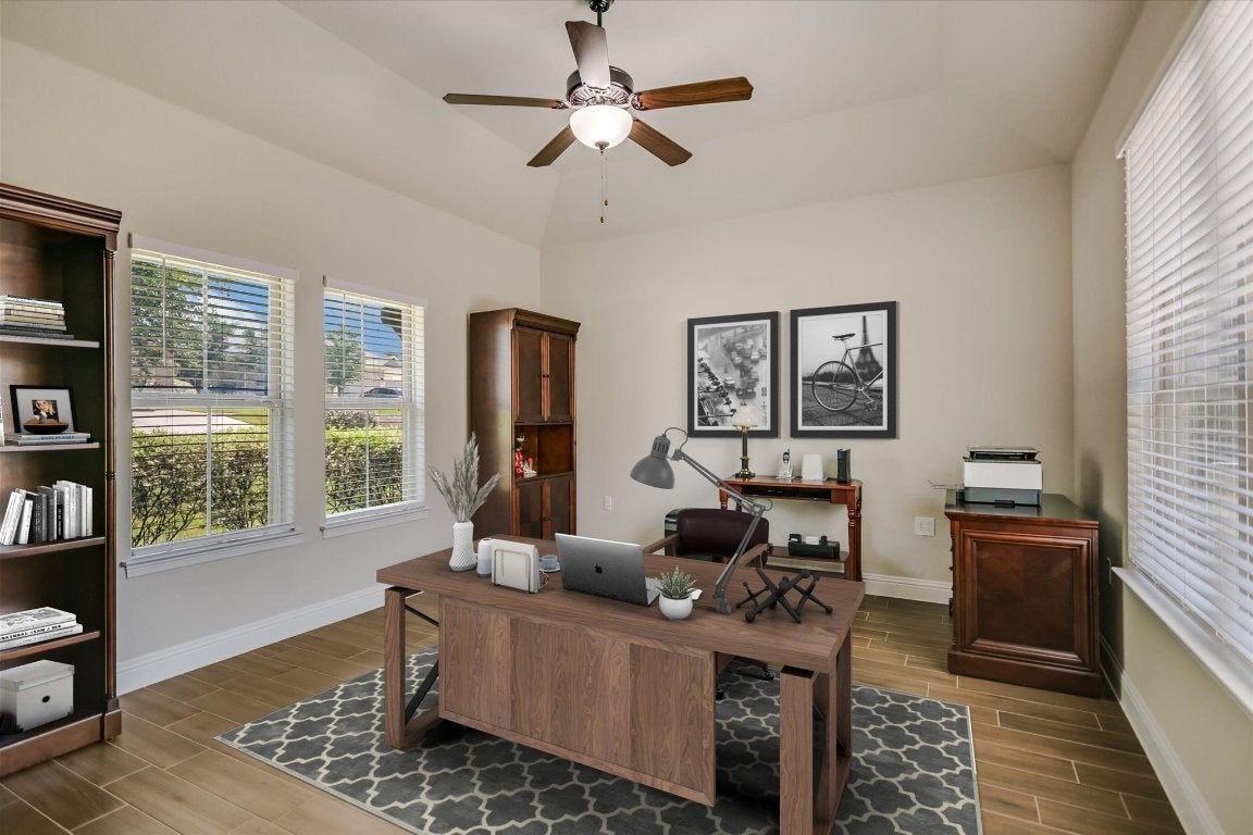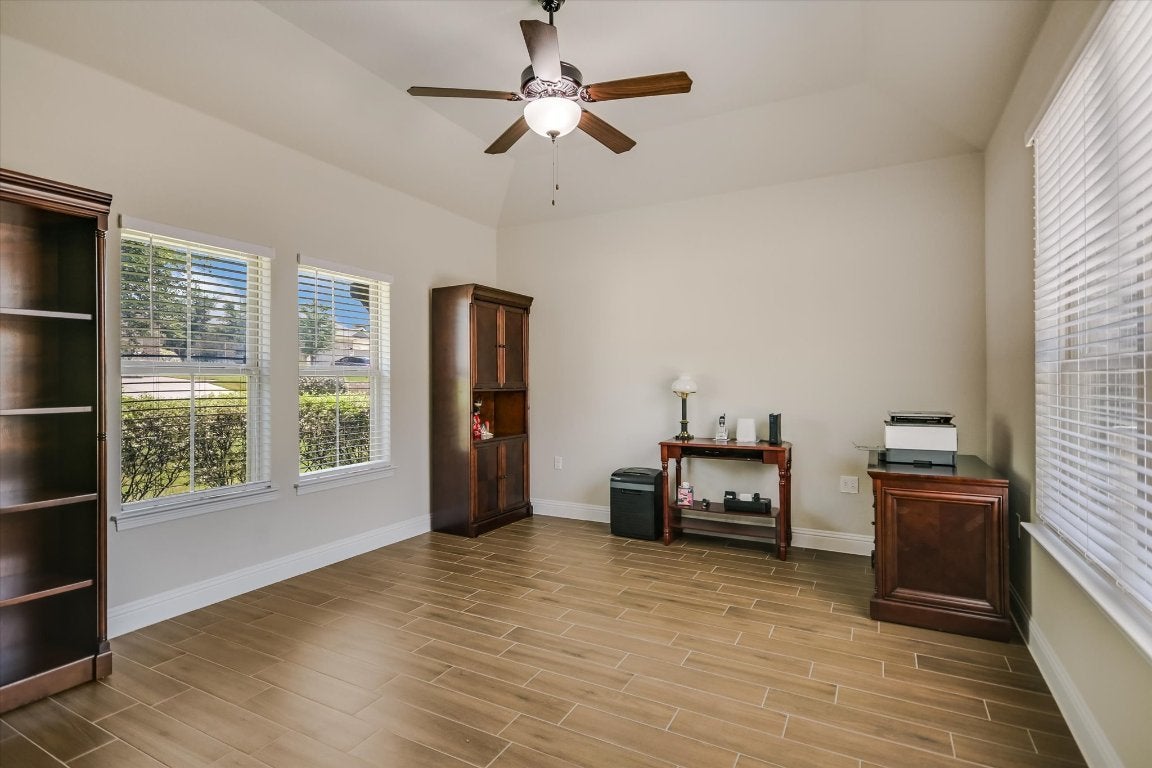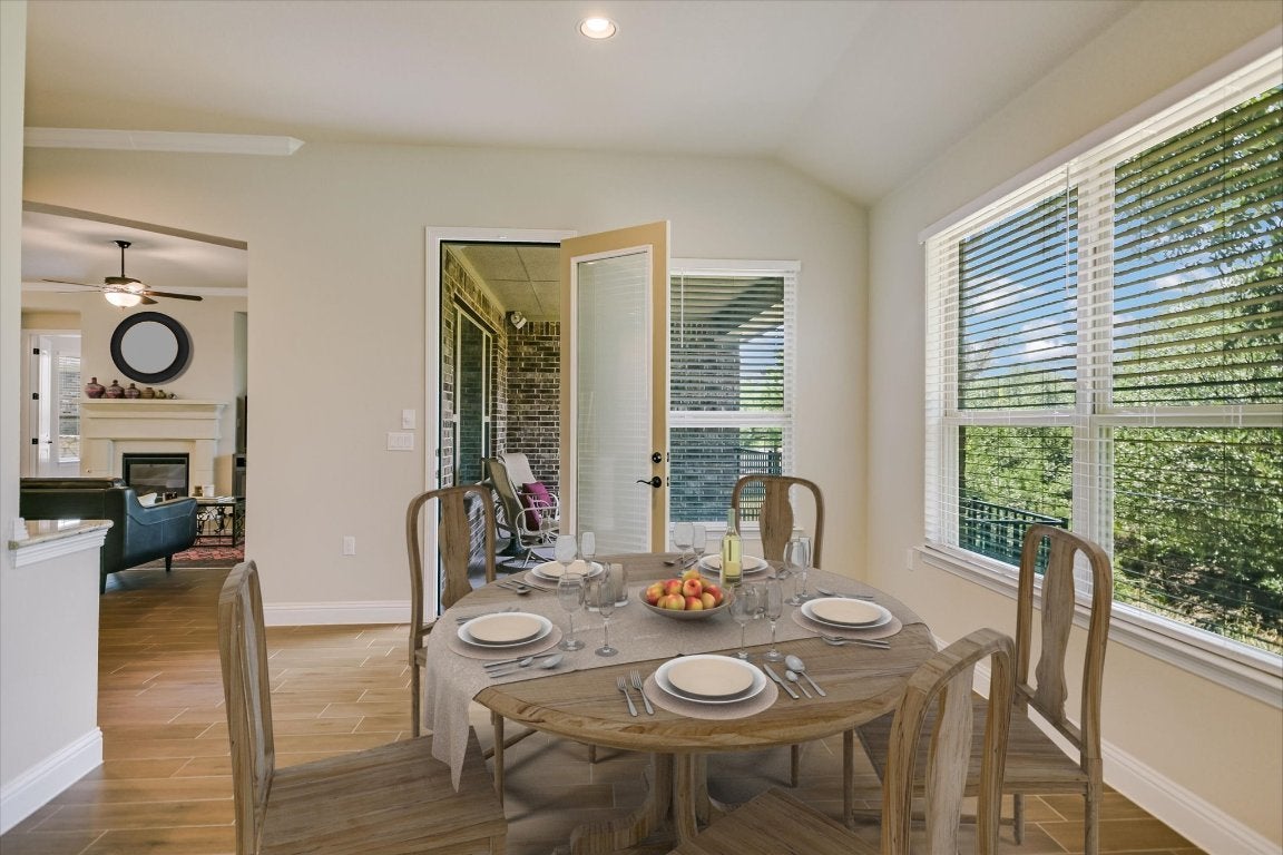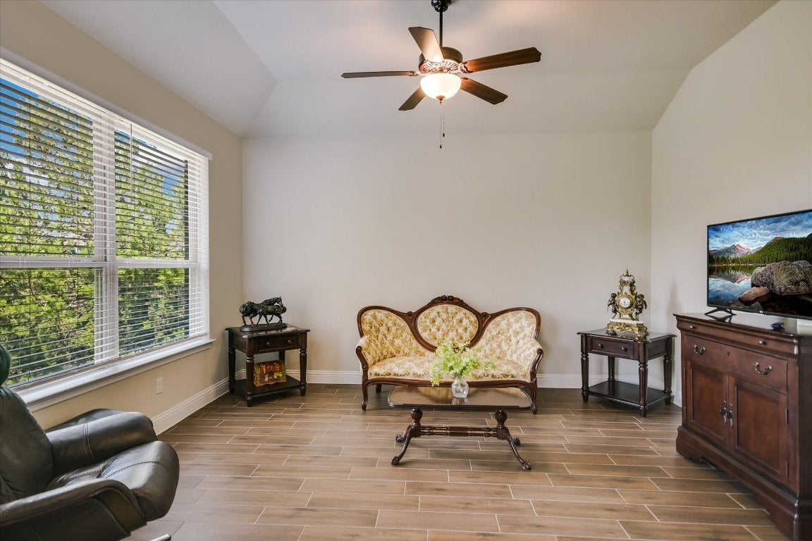 Beautiful, well-maintained 3 bedroom/3 bath plus study & 3-car garage set on lovely large lot and nestled in exclusive gated community of Abrantes in Cedar Park. Spacious open floorplan with gorgeous architectural details in this single story, East-facing home built in 2018. Private backyard with trees and "greenspace". Large covered front porch, covered patio in back, and unique courtyard on side give plenty of areas to enjoy the outside. Front porch opens to dramatic entry. French doors open to spacious study at entry. The open floor plan continues to formal dining area which is adjacent to patio doors opening to large courtyard area. The inviting living room with fireplace is open to the island kitchen and breakfast room. The large kitchen features beautiful granite countertops, tile backsplash, an abundance of painted cabinets, stainless steel appliances including double ovens, a walk-in pantry, and under cabinet lighting. The adjacent spacious breakfast room opens to the outdoor patio and second living area (multiuse--could be made into media room or used as playroom, etc.). The MIL layout features an inviting primary suite which includes an ensuite bath with dual vanities, an oversized walk-in shower, a garden tub, and two large walk-in closets. The secondary bedrooms are located on the opposite side of the home and include one bedroom w/ensuite bath and walk-in closet and another bedroom adjacent to bath w/large walk-in shower. The spacious laundry room with built-ins leads to a huge 3-car garage with floor w/polyaspartic finish. Wood-looking tile floors are throughout much of the home with tile included on porches and patio/courtyard. Many extras include alarm system, ceiling speakers, dust free air purification system, added insulation and flooring above garage, and more. Convenient location with easy access to major roadways and a variety of dining & shopping options. Near schools and wonderful parks!