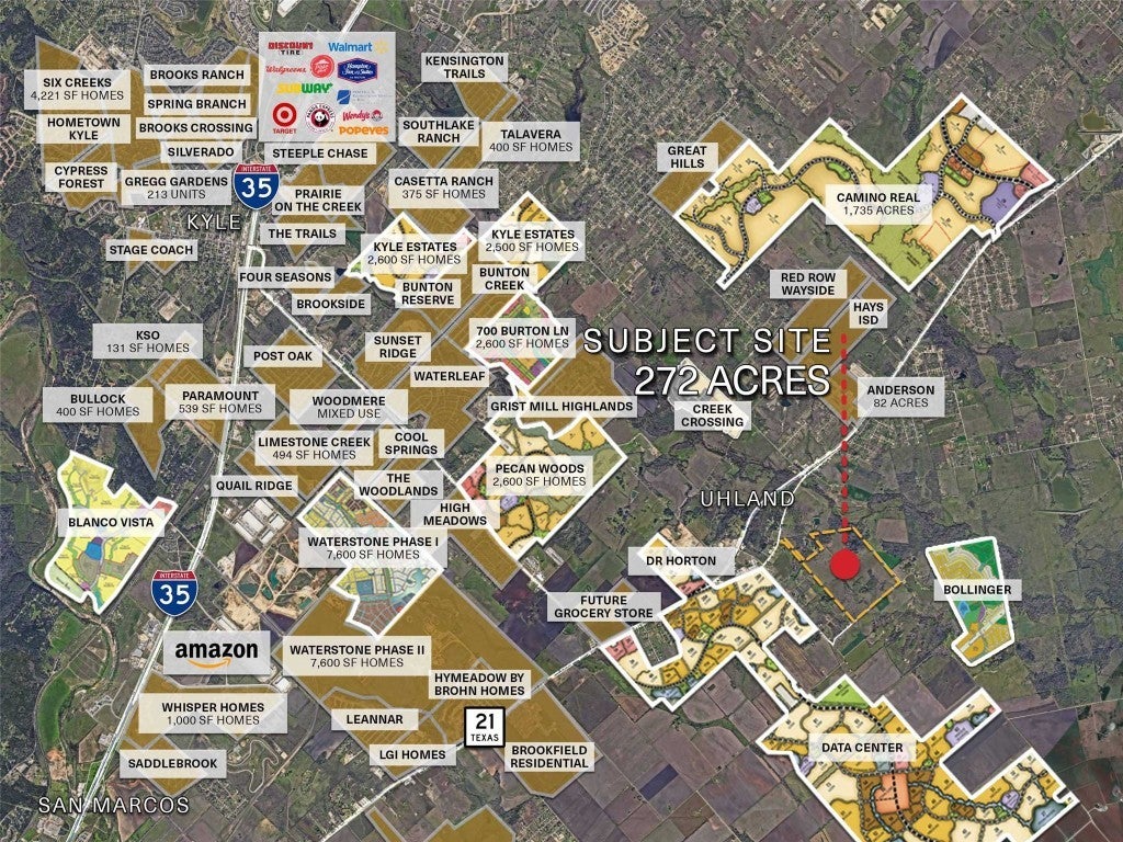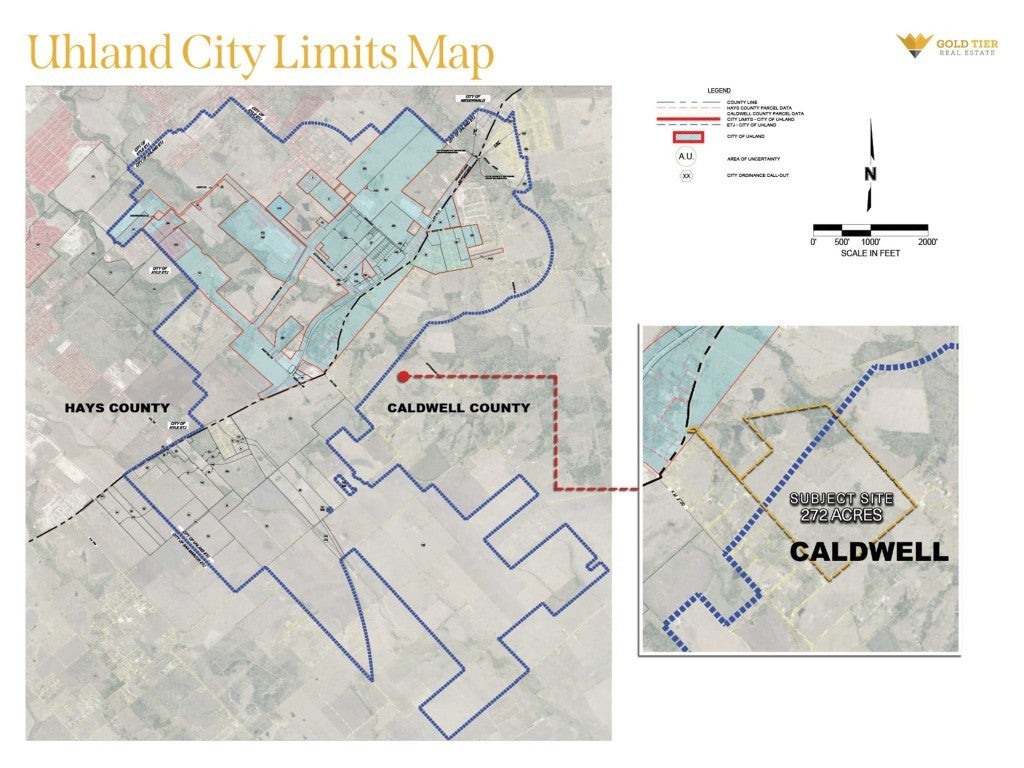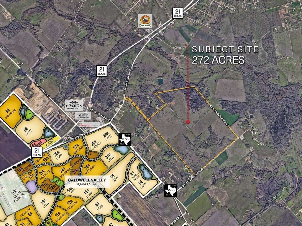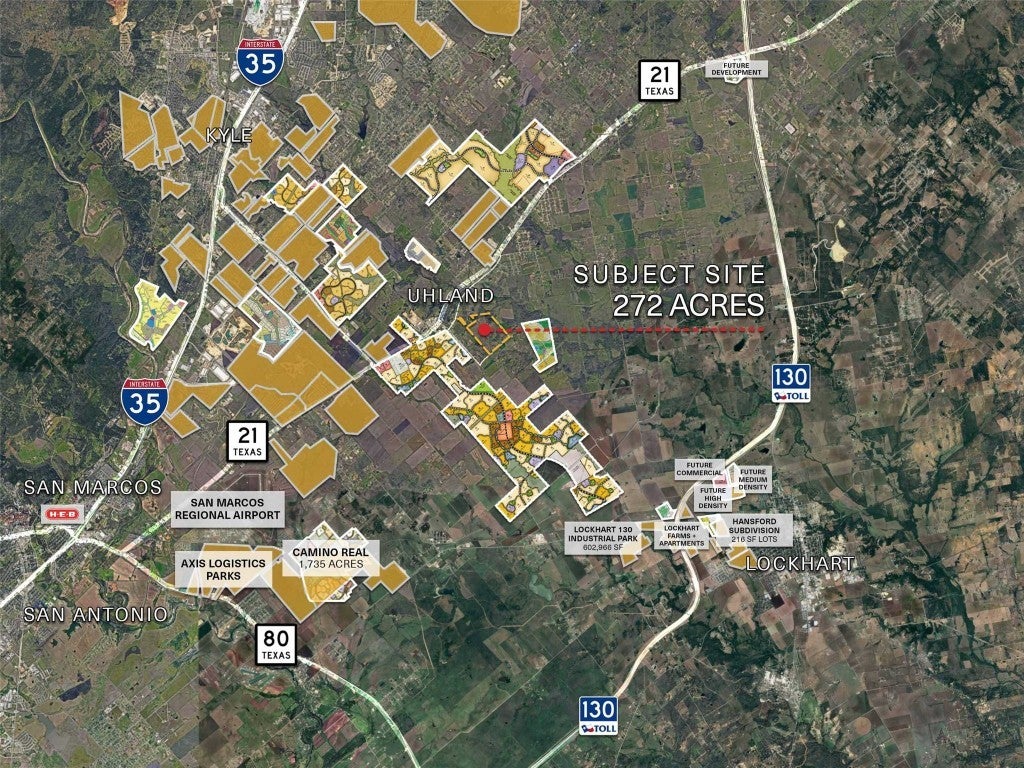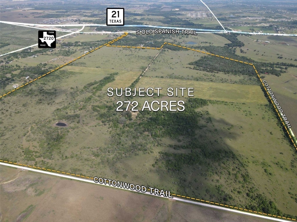Gold Tier Real Estate is proud to present 272 acres in Uhland, Texas. Situated along the rapidly expanding Highway 21 corridor, this property is strategically located between the thriving cities of Kyle, San Marcos, Austin, and Lockhart. The area is experiencing significant growth, with national homebuilders securing over 3,000 residential lots in the immediate vicinity. The site offers access to two water lines (16” and 4”) and three-phase power. A developer will need to figure out a wastewater solution. The site has a significant amount of frontage on Cottonwood Trail and a small secondary access on S Old Spanish Trail. With a path towards utilities, the site is ideal for residential, industrial or mixed-use development.