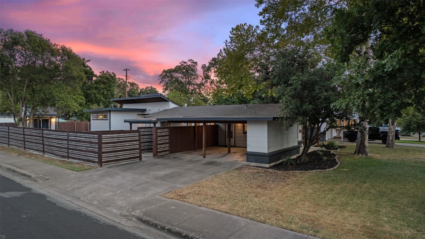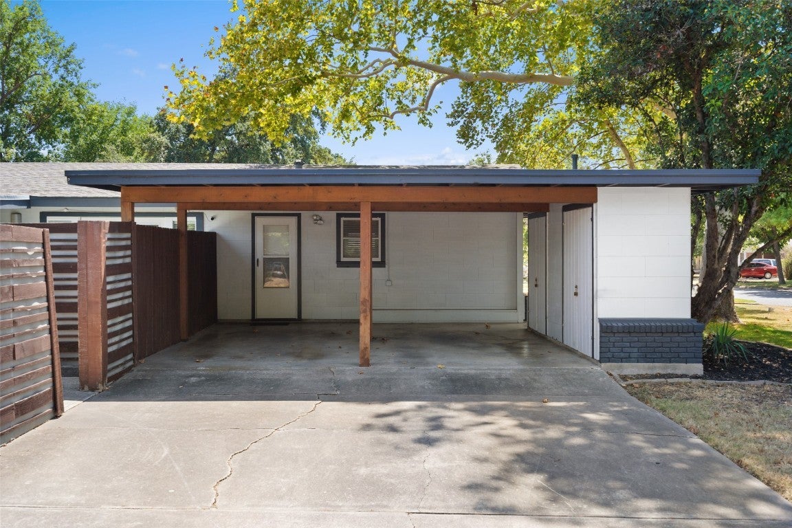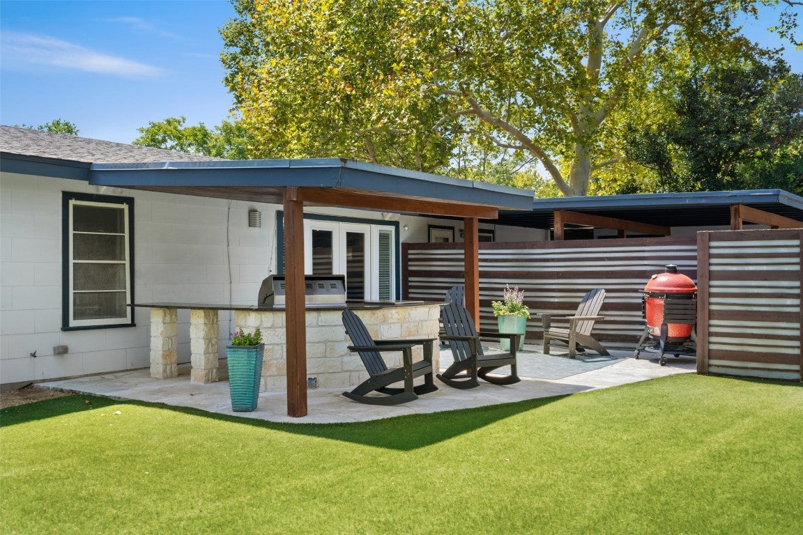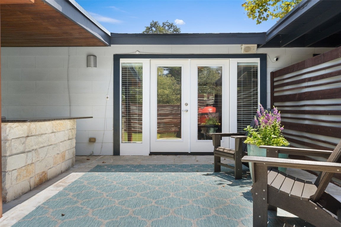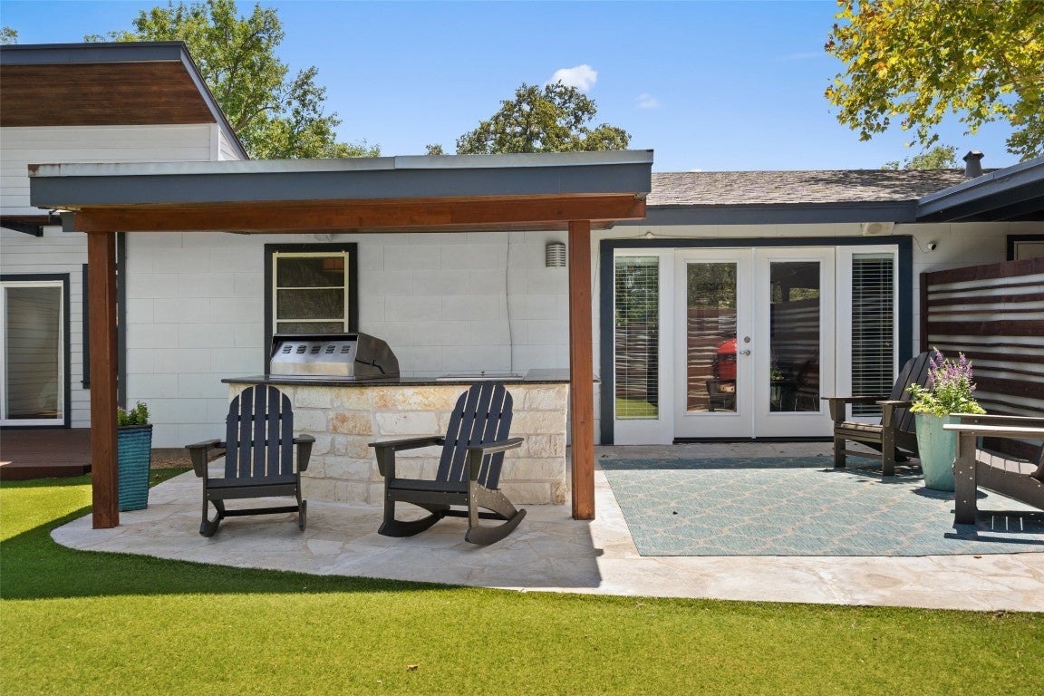 New 30 year roof installed Nov 2025! Nestled on a corner lot w/towering trees in the heart of Crestview, this home seamlessly blends clean modern lines w/authentic details in a prime location. The home features a light & bright open living space w/a generous living room, polished concrete floors, granite island kitchen w/stainless appliances, modern hexagonal backsplash and gas range. The dining room affords plenty of room for hosting and is anchored by an architectural accent wall. French doors lead to the incredible flagstone patio, where a covered outdoor kitchen houses a built-in grill, granite counters and stainless ice basin for refreshments. The yard has low maintenance turf and is great for outdoor play and also includes a bonus studio that is perfect for an office, hobby room, storage or play space. The 2-car covered carport, a rarity in Crestview, can easily be converted into a garage. The spa-like primary bath offers dual vanities, high ceilings, modern fixtures and a huge walk-in frameless shower w/dual rain shower heads and built-in benches. The real showstopper, however, is the magazine worthy walk-in closet complete w/full height built-in storage, glass accent doors, designer wallpaper and a crystal chandelier. 2 guest bedrooms and bathrooms feature original American Oak flooring which complement the clawfoot tub and other vintage bath details that pay homage to the home’s history. Venture out and enjoy the superb location by visiting over 15 restaurants within walking distance. Play ball at Northwest District park, take a bike ride w/the UT Cycling Team on their weekly Friday fun ride, Austin FC Soccer games, the “Shoal Creek Shootout” or go shopping at the Domain less than 10 mins away. Enjoy fine dining at Bartlett’s around the corner, Japanese omakase at Dip Dip Tatsu-Ya, a smoothie at Juiceland or go back in time with a visit to Top Notch Burgers, made famous by the movie Dazed and Confused.