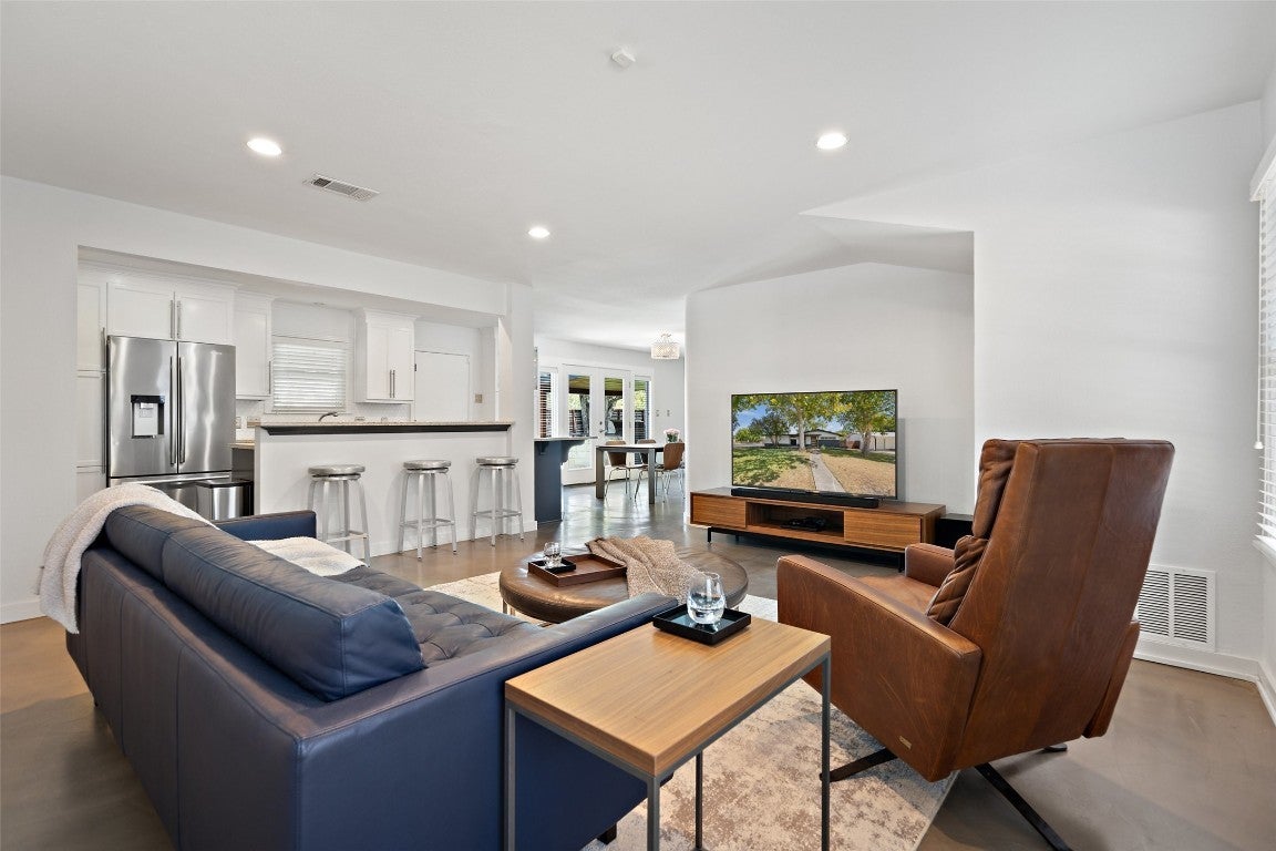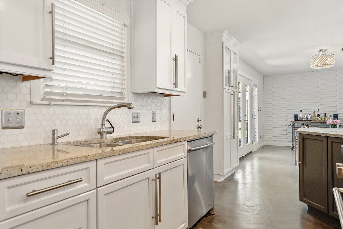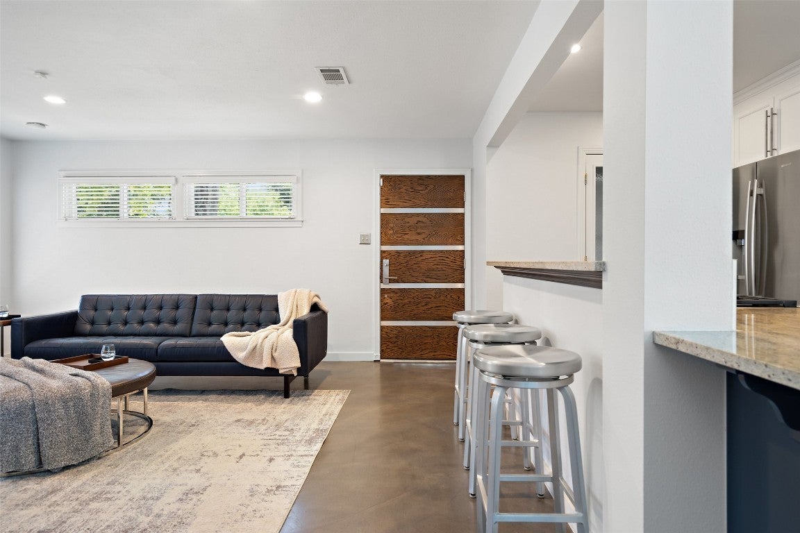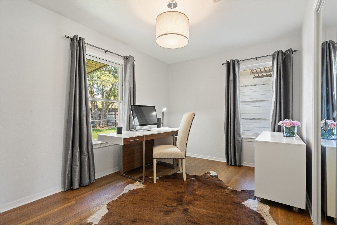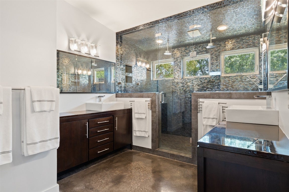 New 30 year roof installed Nov 2025! Nestled on a corner lot w/towering trees in the heart of Crestview, this home seamlessly blends clean modern lines w/authentic details in a prime location. The home features a light & bright open living space w/a generous living room, polished concrete floors, granite island kitchen w/stainless appliances, modern hexagonal backsplash and gas range. The dining room affords plenty of room for hosting and is anchored by an architectural accent wall. French doors lead to the incredible flagstone patio, where a covered outdoor kitchen houses a built-in grill, granite counters and stainless ice basin for refreshments. The yard has low maintenance turf and is great for outdoor play and also includes a bonus studio that is perfect for an office, hobby room, storage or play space. The 2-car covered carport, a rarity in Crestview, can easily be converted into a garage. The spa-like primary bath offers dual vanities, high ceilings, modern fixtures and a huge walk-in frameless shower w/dual rain shower heads and built-in benches. The real showstopper, however, is the magazine worthy walk-in closet complete w/full height built-in storage, glass accent doors, designer wallpaper and a crystal chandelier. 2 guest bedrooms and bathrooms feature original American Oak flooring which complement the clawfoot tub and other vintage bath details that pay homage to the home’s history. Venture out and enjoy the superb location by visiting over 15 restaurants within walking distance. Play ball at Northwest District park, take a bike ride w/the UT Cycling Team on their weekly Friday fun ride, Austin FC Soccer games, the “Shoal Creek Shootout” or go shopping at the Domain less than 10 mins away. Enjoy fine dining at Bartlett’s around the corner, Japanese omakase at Dip Dip Tatsu-Ya, a smoothie at Juiceland or go back in time with a visit to Top Notch Burgers, made famous by the movie Dazed and Confused.