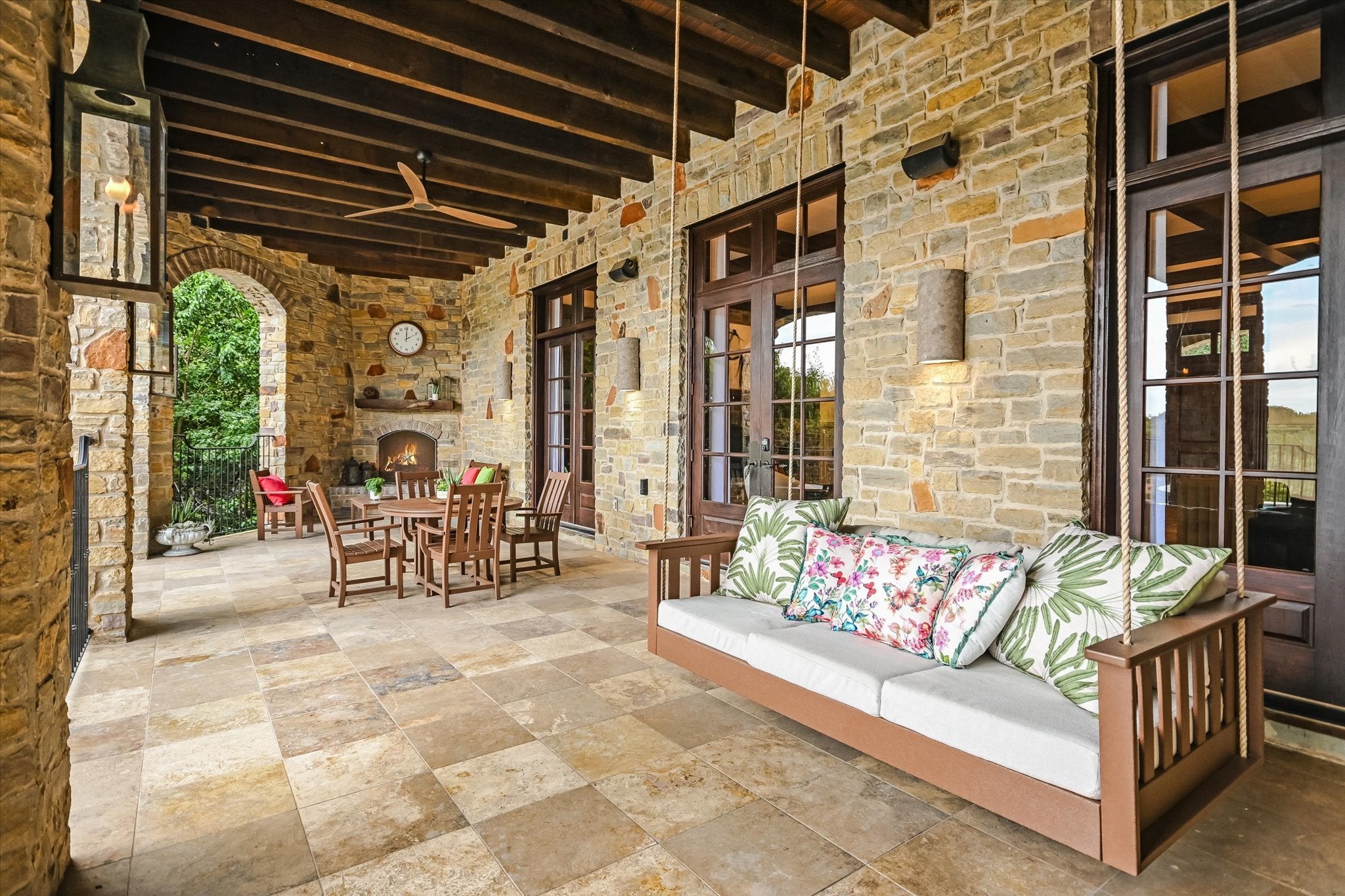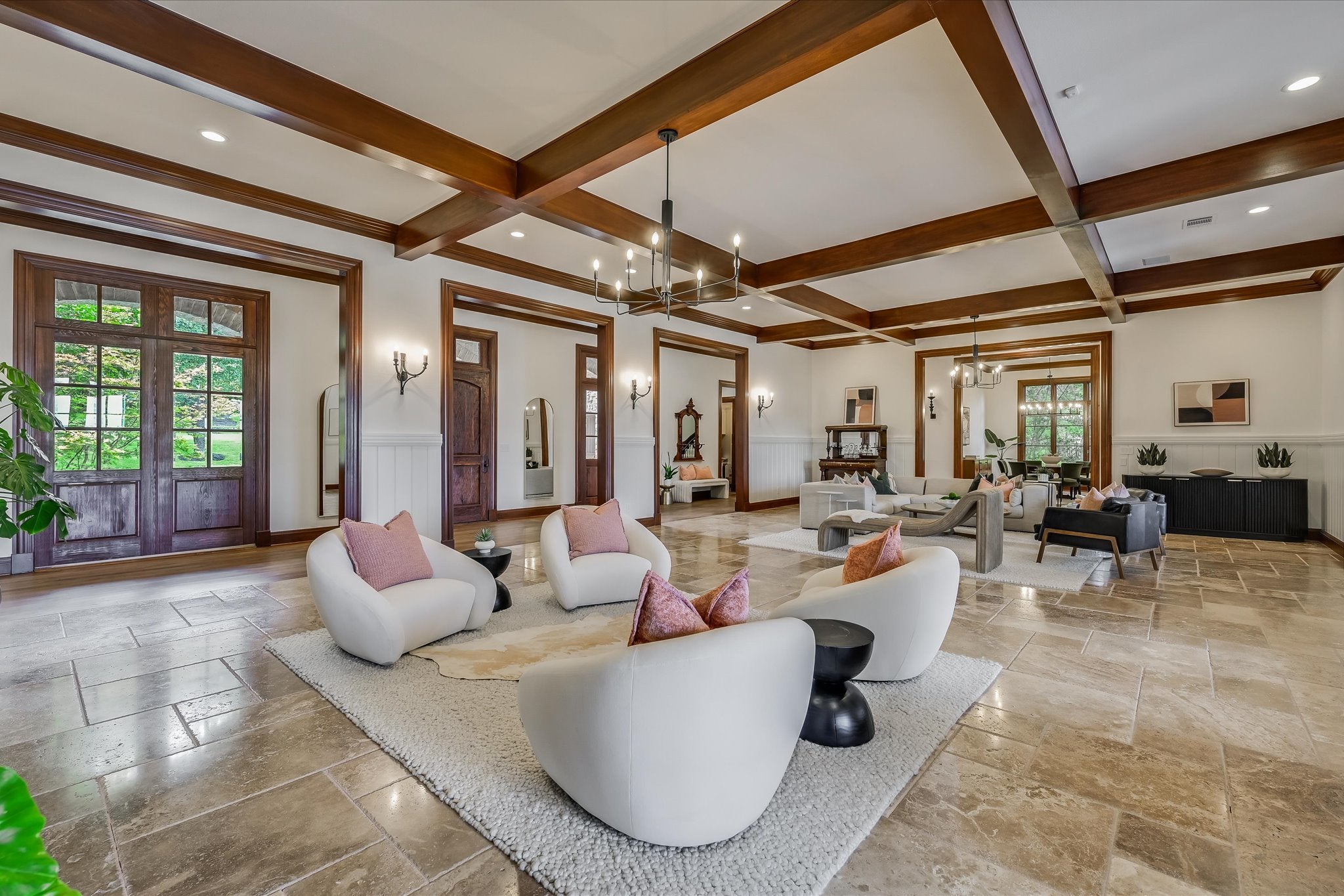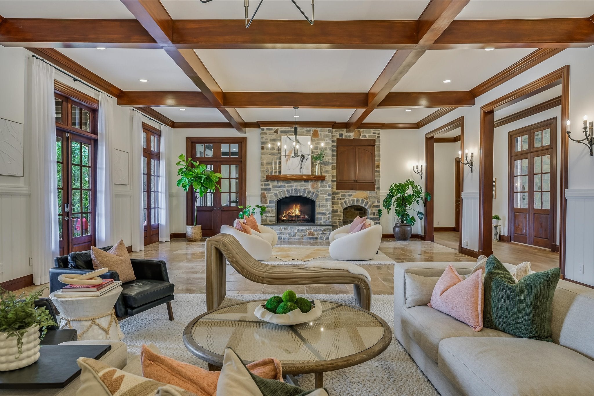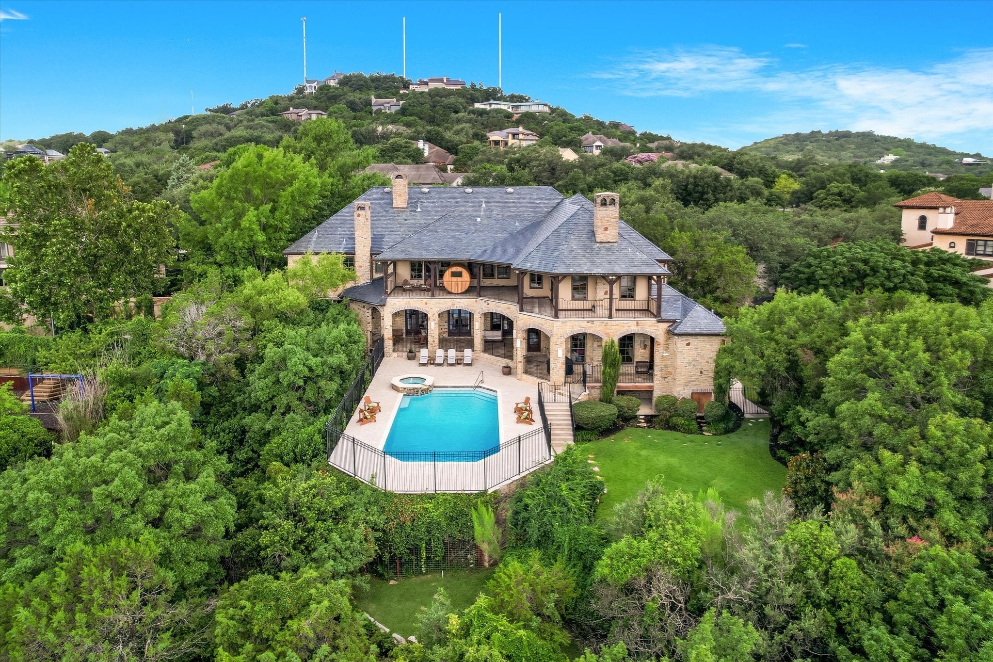 Welcome to this stunning estate tucked in one of Austin's most coveted private neighborhoods. Set on lot backing to a greenbelt, this classic home blends rich woodwork, timeless stone finishes, & transitional charm – offering endless flexibility for both grand entertaining and cozy everyday living. The great room invites you in with soaring coffered ceilings w/exposed wood beams, large gas fireplace overlooking the outdoor patio, pool, and spa. Stone floors and masterful hardwood accents carry throughout the home, creating warmth and sophistication at every turn. The chef’s kitchen is truly expansive, with 2 islands, dual dishwashers, 2wine fridges, 2 sinks, a 6-burner rangetop, butler’s pantry, & abundant cabinetry – designed for effortless entertaining. A spiral staircase just off the kitchen leads to a dramatic 1500 bottle wine cellar and tasting room with ample space for dining and bottle storage. The main level also features a private guest suite, den, a large formal dining room, and a breakfast room that opens directly to the pool area. Upstairs, the primary suite is a true retreat – featuring a fireplace, large dual closets, a spa-like bathroom with soaking tub, and dual vanities. Step out onto the private balcony for serene views of the backyard oasis and your custom built 6 person sauna. The expansive view includes the UT tower and Mount Bonnell. Each additional bedroom includes its own bathroom and walk-in closet. A media room (optional 6th bedroom) w/ full bath, dual offices, a playroom with built-in desks, and an additional flex space accommodate every lifestyle. The home has been recently upgraded with lighting updates, Sonos, water filtration, HVACS, security system, and a cedar sauna. Outdoors, enjoy a view of the greenbelt from your private, fully equipped outdoor living space, including a resort style pool/spa, covered patio, and dining area. All information deemed reliable but not guaranteed. Buyer to confirm all information.