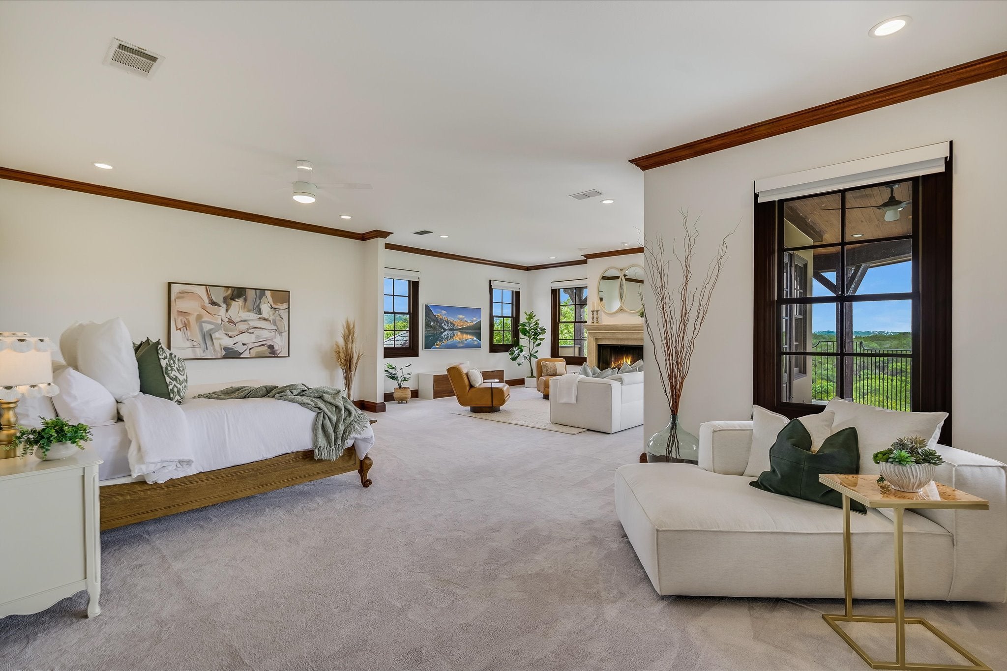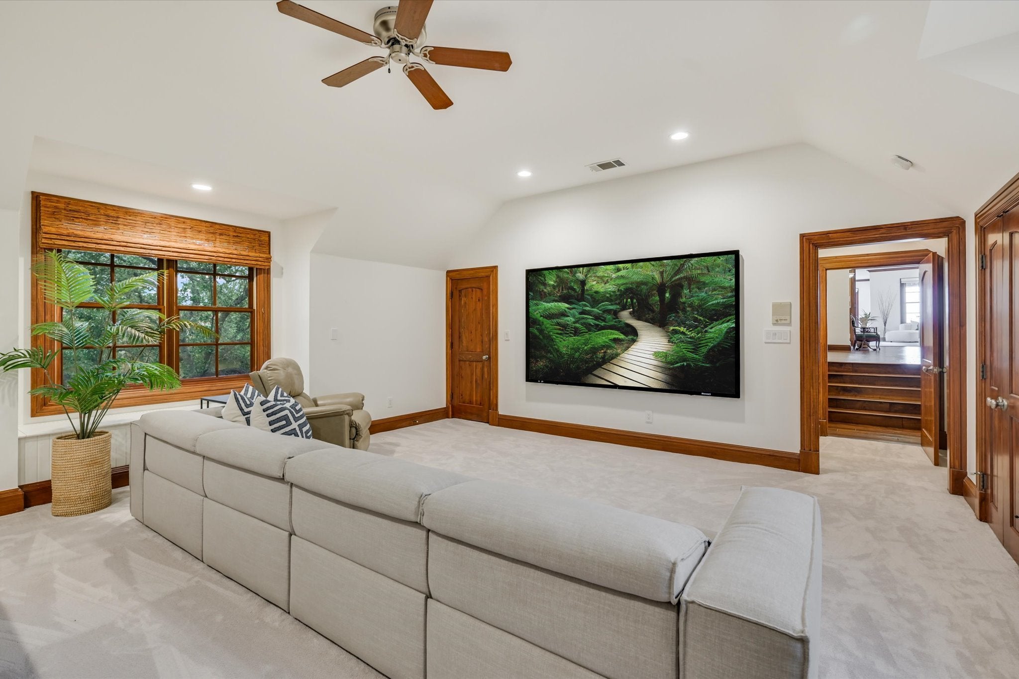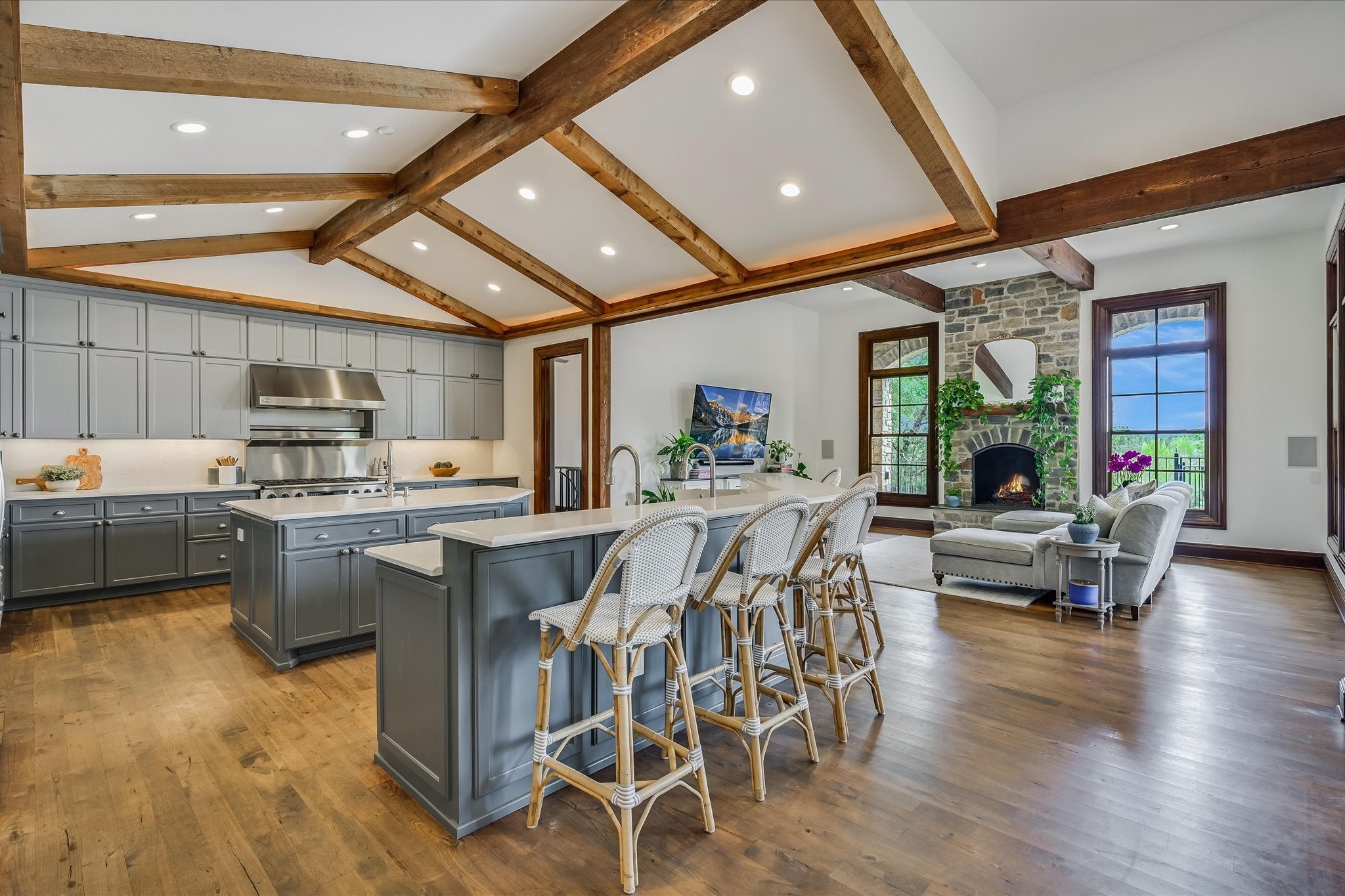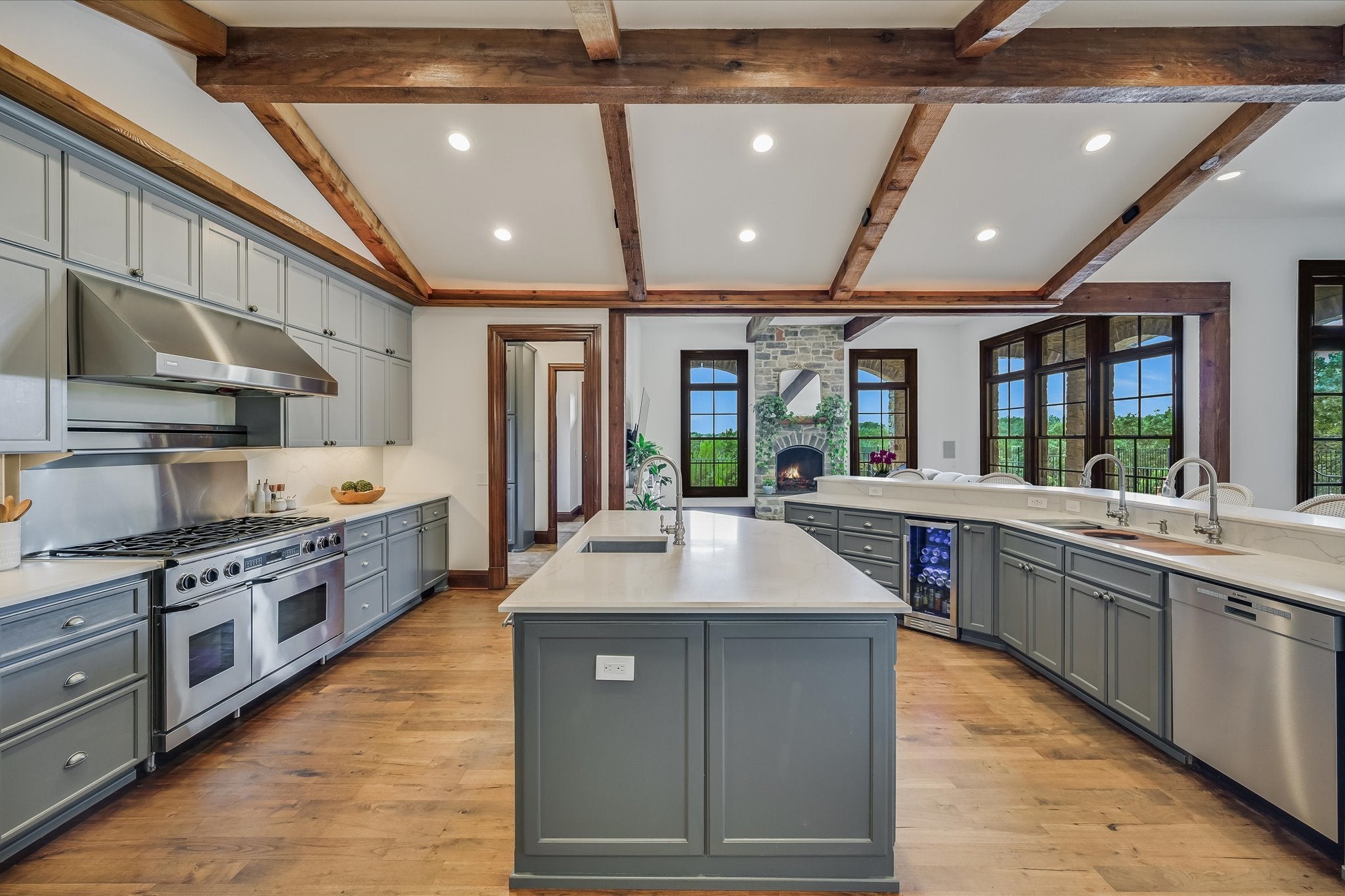 Welcome to this stunning estate tucked in one of Austin's most coveted private neighborhoods. Set on lot backing to a greenbelt, this classic home blends rich woodwork, timeless stone finishes, & transitional charm – offering endless flexibility for both grand entertaining and cozy everyday living. The great room invites you in with soaring coffered ceilings w/exposed wood beams, large gas fireplace overlooking the outdoor patio, pool, and spa. Stone floors and masterful hardwood accents carry throughout the home, creating warmth and sophistication at every turn. The chef’s kitchen is truly expansive, with 2 islands, dual dishwashers, 2wine fridges, 2 sinks, a 6-burner rangetop, butler’s pantry, & abundant cabinetry – designed for effortless entertaining. A spiral staircase just off the kitchen leads to a dramatic 1500 bottle wine cellar and tasting room with ample space for dining and bottle storage. The main level also features a private guest suite, den, a large formal dining room, and a breakfast room that opens directly to the pool area. Upstairs, the primary suite is a true retreat – featuring a fireplace, large dual closets, a spa-like bathroom with soaking tub, and dual vanities. Step out onto the private balcony for serene views of the backyard oasis and your custom built 6 person sauna. The expansive view includes the UT tower and Mount Bonnell. Each additional bedroom includes its own bathroom and walk-in closet. A media room (optional 6th bedroom) w/ full bath, dual offices, a playroom with built-in desks, and an additional flex space accommodate every lifestyle. The home has been recently upgraded with lighting updates, Sonos, water filtration, HVACS, security system, and a cedar sauna. Outdoors, enjoy a view of the greenbelt from your private, fully equipped outdoor living space, including a resort style pool/spa, covered patio, and dining area. All information deemed reliable but not guaranteed. Buyer to confirm all information.