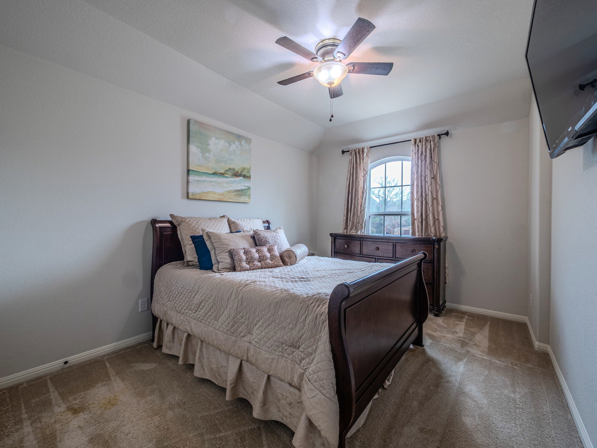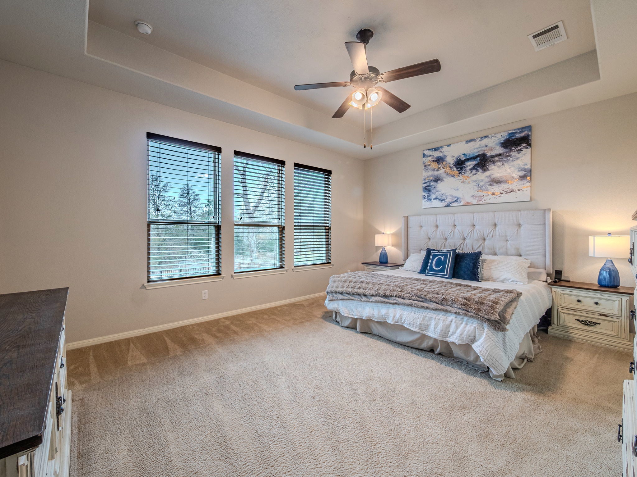 Situated on 3.681 wooded acres in a quiet gated cul-de-sac community, this spacious home offers the best of country living with convenient access to Austin approximately 30 minutes away. A circular drive welcomes you home, leading to a 3-car garage and providing ample parking for guests. Inside, the open floor plan is filled with natural light and features high ceilings in the main living area, anchored by a beautiful stone fireplace that creates a warm, inviting focal point. The kitchen is designed for gathering, with granite countertops, stainless steel appliances, 42” cabinetry, and a dedicated coffee/butler’s pantry all open to the great room and dining area. Step outside to the oversized deck, perfect for entertaining or simply enjoying peaceful views of the surrounding trees. The primary suite offers high ceilings and generous space for relaxation. Downstairs also includes a dedicated office ideal for working from home or creating a quiet study space. Upstairs, you’ll find expansive secondary living space that can easily serve as a game room, media room, or even a second office, providing flexibility to fit your lifestyle. Guest bedrooms and baths feature tile and granite finishes, and the home includes irrigation and partial fencing for added convenience. With acreage, privacy, and versatile living areas all within a secure gated neighborhood this property offers space to live, work, and unwind while staying close to Austin’s amenities.