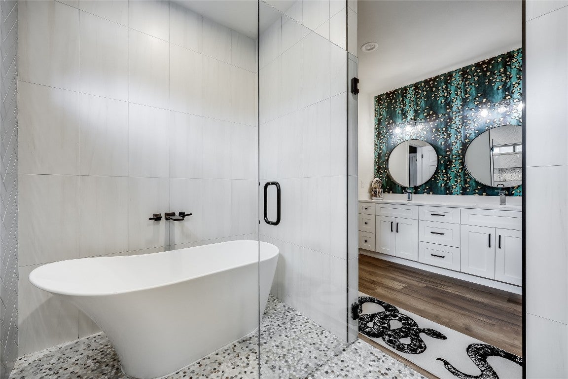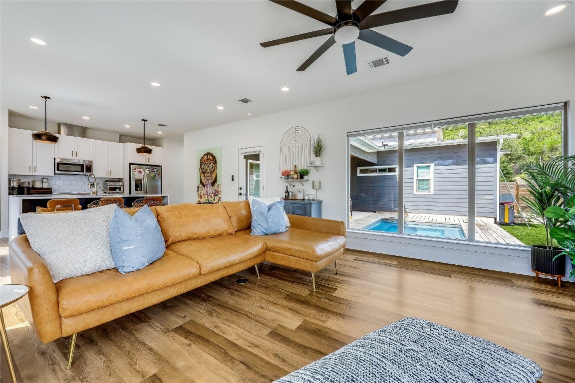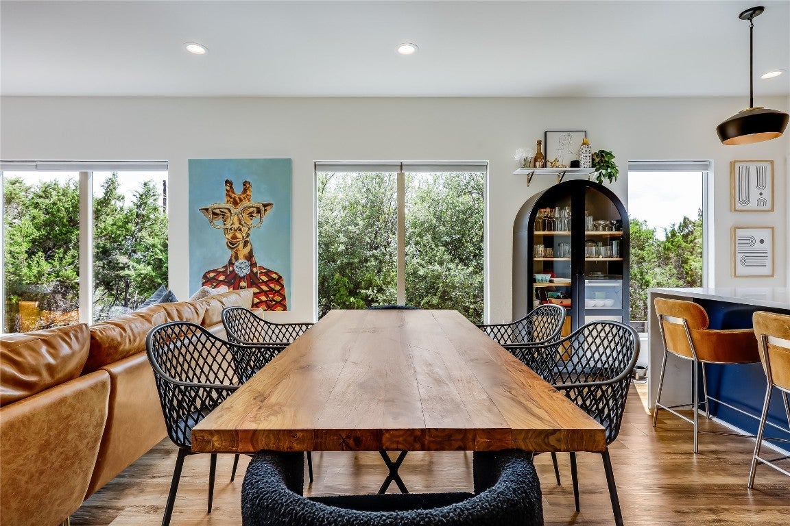 STRs Permitted! Discover your own private oasis in this stunning custom mid-century modern home, where privacy, serenity, and style converge. Perfect as a full-time residence, weekend getaway, or income-producing short-term rental, this architectural gem offers clean modern lines, artisan masonry with native Texas Lueders stone, and thoughtful luxury throughout. Step inside to an open, airy living space where floor-to-ceiling windows frame picturesque views of the sleek cocktail pool, expansive deck, and surrounding natural beauty. The light-filled great room seamlessly connects the living area, dining space, and chef’s kitchen, creating a welcoming environment for relaxing or entertaining. The gourmet kitchen features premium Bosch stainless steel appliances, an oversized island with bar seating, chic pendant lighting, and a custom farm sink with integrated workstation. Milky white quartz countertops, geometric tile backsplash, and designer hardware add sophisticated flair. Wire-brushed blonde oak flooring and a soothing color palette enhance the home's spa-like ambiance. The primary suite is a tranquil retreat with private access to the pool and patio, showcasing a luxurious spa bath with a freestanding porcelain tub, oversized walk-in shower, quartz-topped double vanity, and expansive walk-in closet with custom shelving. Two guest bedrooms and a full bath are located in a separate wing, offering peace and privacy—perfect for guests or use as a home office or gym. Each guest room enjoys views of mature live oaks. This rare offering combines modern elegance, indoor-outdoor living, and investment potential in one exquisite package.