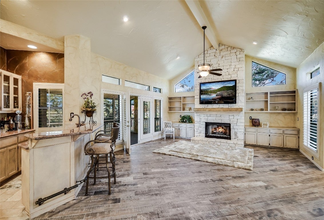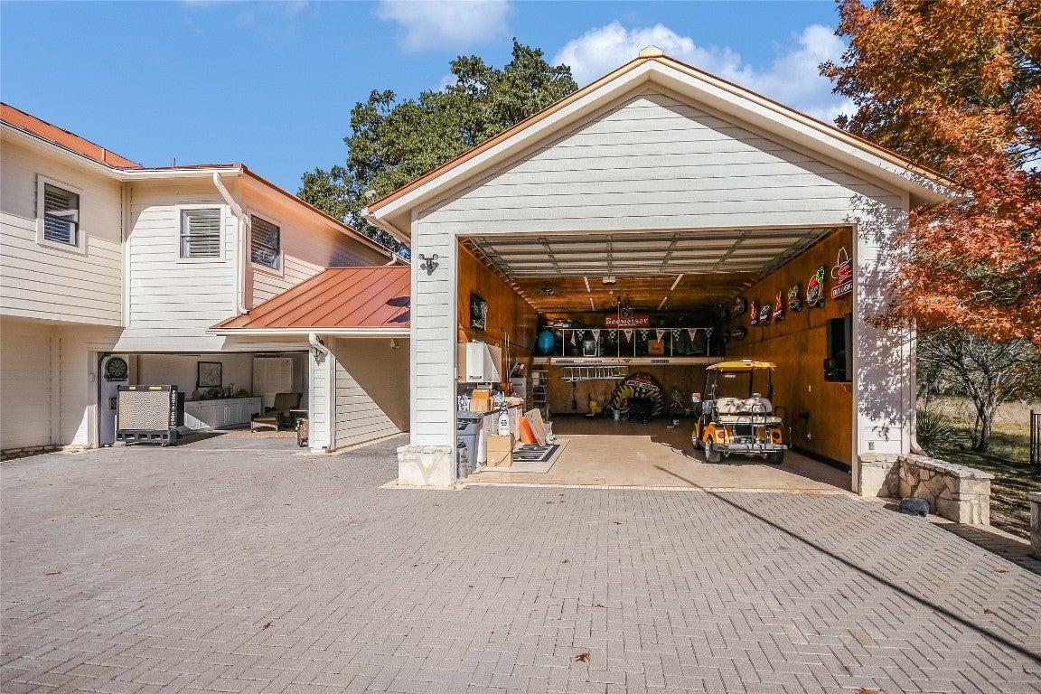 Situated on two lots totaling .80 acres, 333 Quail Run Ct offers lakeside living & recreational convenience that’s hard to beat. The property is surrounded by natural beauty, outdoor activities, & premier amenities. A primary highlight of the home is the generously sized screened-in porch, located off the living room & tucked under a canopy of trees—a peaceful retreat to enjoy Hill Country breezes year-round. The open-concept living with fireplace, dining area with built-in buffet, & spacious kitchen are perfect for family living. Additionally, a wet bar alcove, cleverly tucked into the corner, allows for ease of entertaining. The split-level home features 3 bedrooms and 3.5 baths. The main-level bedroom serves as a primary suite, with features including a fireplace & private balcony. The primary bath has a double vanity, soaking tub, & separate walk-in shower. Two additional bedrooms downstairs provide privacy & comfort, each with private en-suite baths & large closets. Two garages are each tailored for different needs. One is currently set up as an outdoor recreation room/party area offering flexible space for hobbies & entertaining, but could also function as a traditional 2 car garage. The oversized second garage, measuring approximately 37 feet deep with overhead storage in back, is ideal for outdoor enthusiasts with its high ceiling, oversized door, & extended depth. This garage is perfect for boats, large vehicles, & all your lake toys! Ridge Harbor enhances the lake lifestyle with amenities including two private boat launches, a marina, community pool, tennis courts, plus a small play area for the children. Proximity to Muleshoe Bend Park, The Grelle, & Krause Springs provides hiking, camping, & mountain biking right at your doorstep. Spicewood’s serene Hill Country atmosphere, nearby private airstrip (88R), golf courses, & easy access to Austin for urban amenities, make 333 Quail Run Ct a prime location for both recreation & convenience.