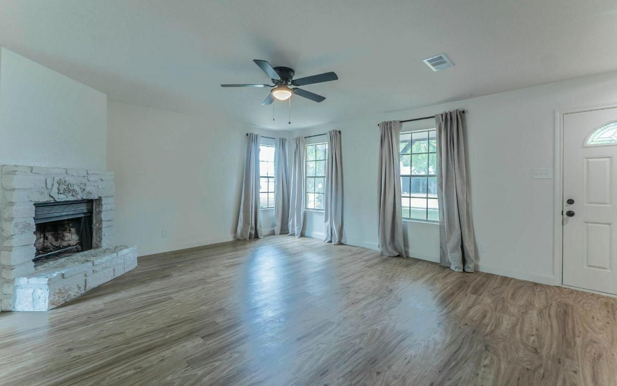 Convenient and accessible location in the desirable Round Rock ISD! Just one street over from Somerset Park and playground—an easy walk for recreation and fun. This charming, newly renovated one-story home offers an efficient and functional floor plan with fresh paint and new flooring throughout. Spacious living room features vaulted, beamed ceilings, a cozy fireplace, and double doors that open to a covered patio. Open-concept layout flows into the dining area and kitchen, which includes a stainless steel gourmet vent hood. The large primary suite also showcases vaulted ceilings and an XL en-suite bath with double vanities. Two secondary bedrooms are located on the opposite side of the home for added privacy, and the hall bath has been updated with a brand-new tub. Private backyard includes a covered patio, separate covered gazebo, full privacy fence, and a powered storage shed—perfect for a workshop or hobby space. Two-car garage. No HOA. Well-maintained and move-in ready!