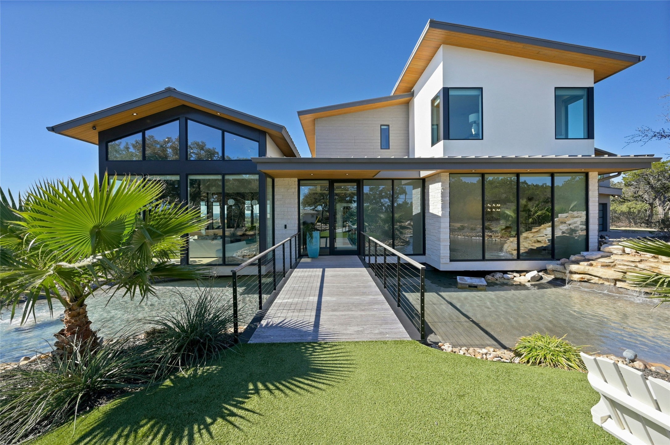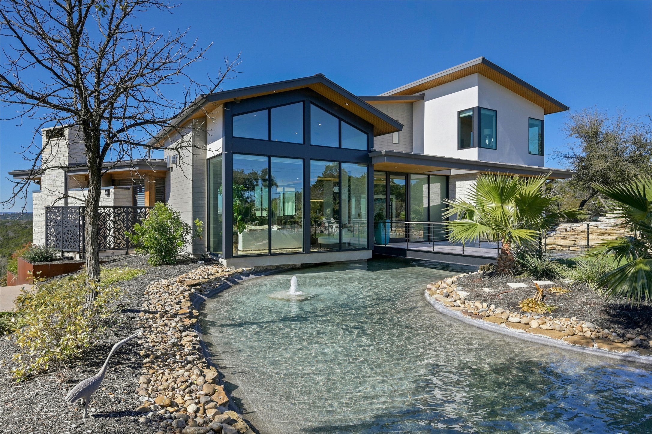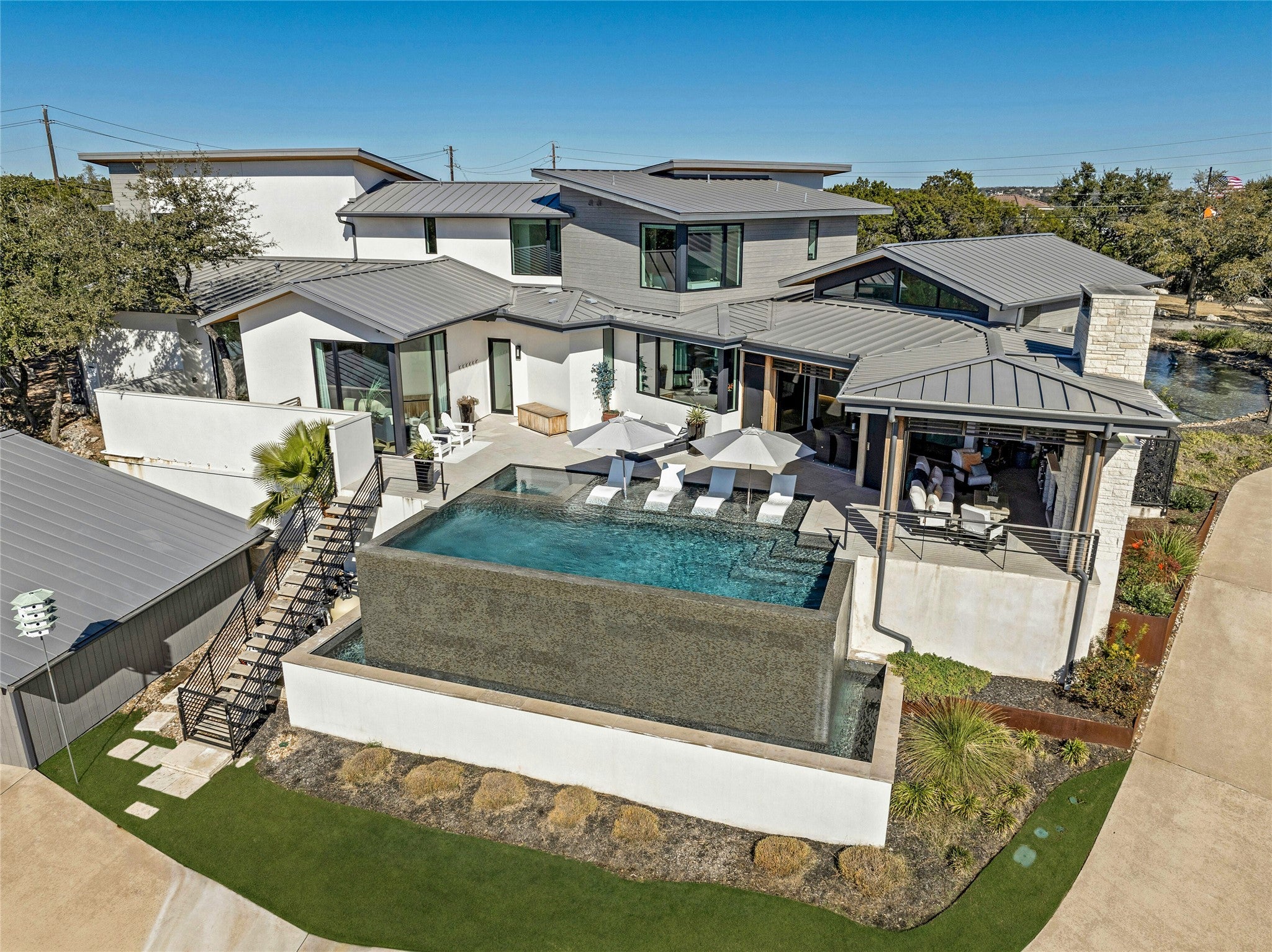 8209 Two Coves Drive is a recently constructed contemporary builder’s personal home with extensive upgrades. Perched atop the rolling hills just off City Park Road, it seamlessly blends striking architectural elements with the natural beauty of the Texas Hill Country. Plus, with a 2025 tax rate of just 1.55% (buyer to verify), this estate represents a rare opportunity to own a state-of-the-art home in a coveted location with some of the lowest property taxes in Austin. A privately gated driveway winds through the lush landscape, leading to a dramatic front entry defined by an expansive mote and waterfall. A modern bridge guides visitors over the tranquil waters toward the residence, setting the stage for the home's contemporary yet serene ambiance. Every detail of the front yard has been meticulously designed with low-maintenance plantings, allowing the home to harmonize effortlessly with its surroundings. This 4-bedroom, 4-bathroom residence, with two additional powder rooms, offers luxurious living spaces, including a dedicated office overlooking the treetop views maximizes natural light and flow. The resort-style amenities continue outside, where ample covered patios, an outdoor kitchen, a waterfall-edge pool, and a hot tub provide the ultimate setting for entertaining against the backdrop of epic Texas sunsets. Beyond the main residence, the property extends its offerings with a casita that currently serves as an office, plus an impressive, detached flex space, complete with a golf simulator and gym, making it an oasis for both relaxation and recreation. Tax and assessed values are estimates for illustration purposes only. All figures should be independently verified.