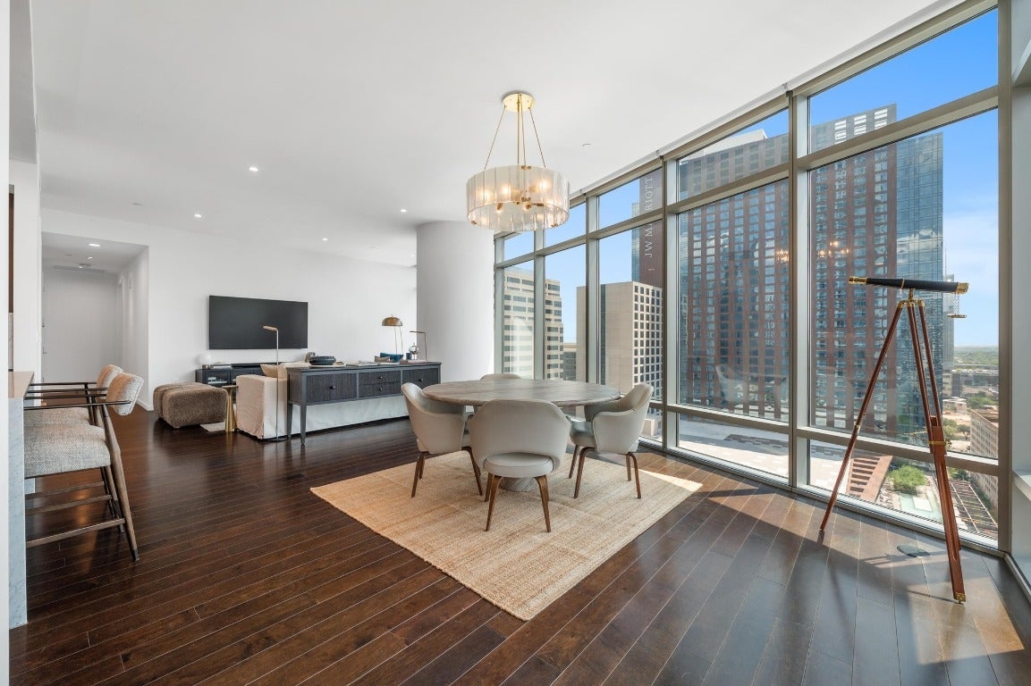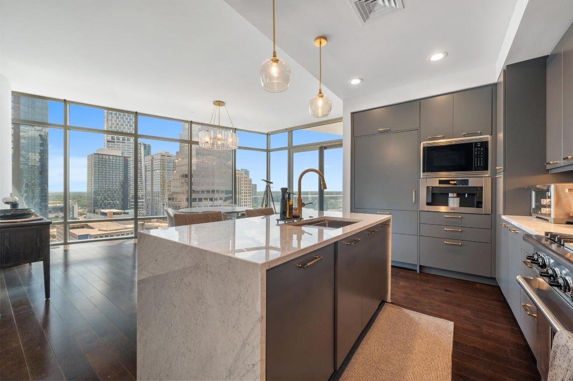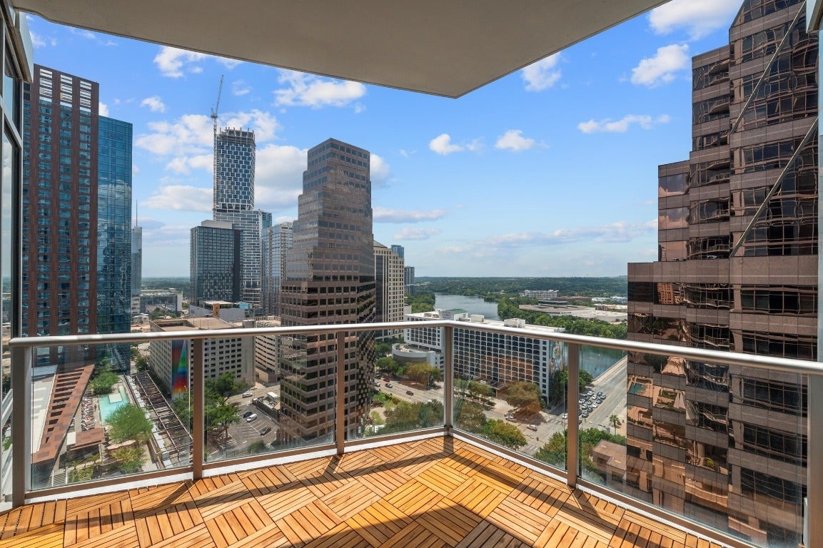 Situated in the southeast corner of The Austonian’s 19th floor with picturesque views of Lake Austin, this recently remodeled residence provides luxury downtown living at its finest. This 2-bedroom, 2.5-bathroom condo features floor-to-ceiling windows that invite impeccable city and water views into the open-concept living room, kitchen, and dining area. The immaculate kitchen is outfitted with stunning modern cabinetry complemented by gorgeous stone countertops and stainless-steel appliances, including an under-counter wine fridge. Enjoy the covered, corner balcony offering a spectacular view of Lake Austin to start and end your day. The primary bedroom has an additional wall of windows to wake up with a lake view. Retreat to the expansive primary bathroom with dual sinks, a soaking tub, a walk-in shower, and a walk-in closet with custom storage. The secondary bedroom has a gorgeous en-suite with beautiful tile throughout. A study/flex space off the entryway provides ample storage with custom built-ins that could function as an office, as well as a smartly appointed built-in Murphy bed for guests. The residence also features a spacious powder room with a pop of stylish wallpaper and a coveted in-unit laundry room. A climate-controlled storage unit on the 9th floor and 2 reserved parking spots convey with the sale. Furniture could also be included for a full price offer. The Austonian, downtown's premier building, boasts 40,000 SF of amenities, including valet parking, a 56th-floor fitness center, pool deck, BBQ areas, a spa room, guest suites, dog park and grooming area, and 24-hour concierge service reserved for owners only. Perfectly located in downtown Austin, The Austonian provides quick access to the Capitol, restaurants, parks, and entertainment. Live in luxury at the heart of Austin in The Austonian. Tax and assessed values are estimates for illustration purposes only. All figures should be independently verified.