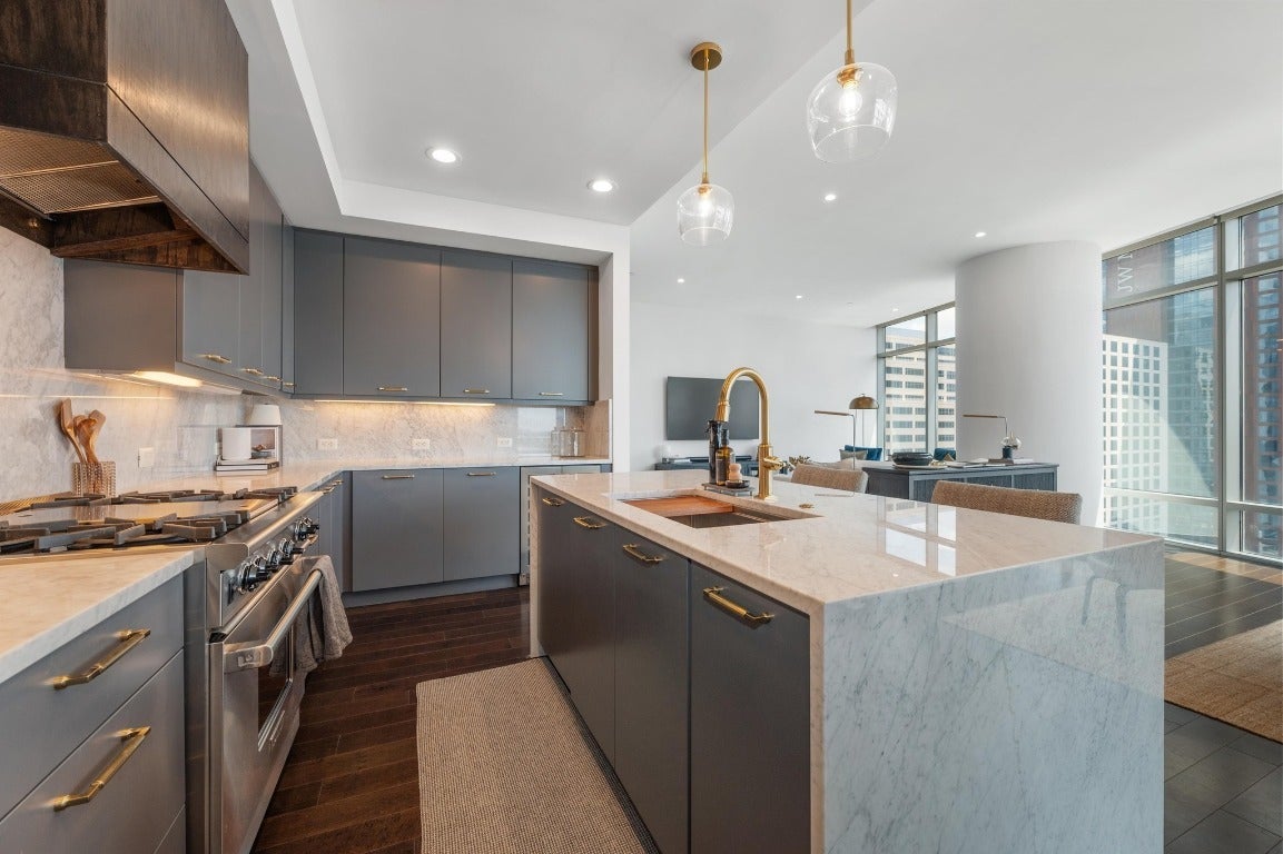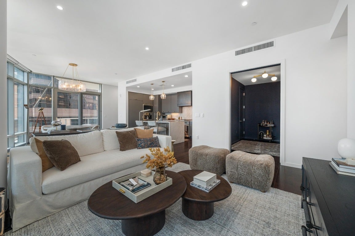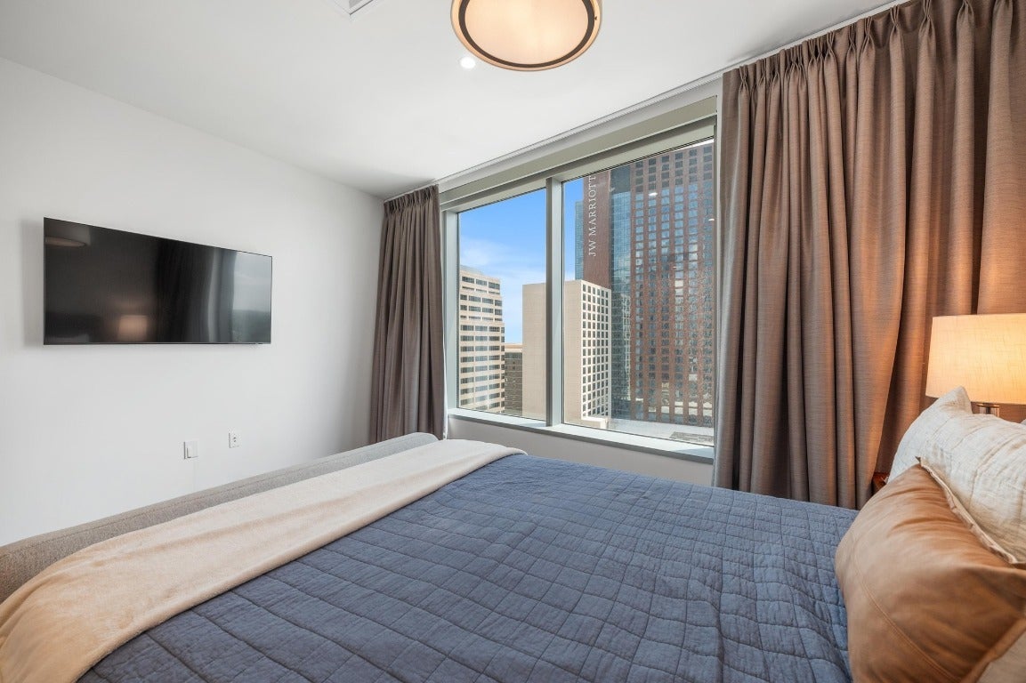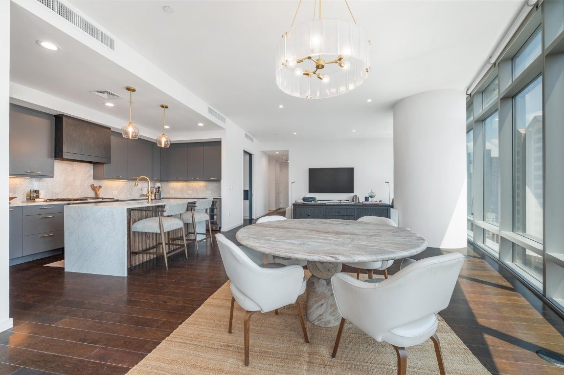 Situated in the southeast corner of The Austonian’s 19th floor with picturesque views of Lake Austin, this recently remodeled residence provides luxury downtown living at its finest. This 2-bedroom, 2.5-bathroom condo features floor-to-ceiling windows that invite impeccable city and water views into the open-concept living room, kitchen, and dining area. The immaculate kitchen is outfitted with stunning modern cabinetry complemented by gorgeous stone countertops and stainless-steel appliances, including an under-counter wine fridge. Enjoy the covered, corner balcony offering a spectacular view of Lake Austin to start and end your day. The primary bedroom has an additional wall of windows to wake up with a lake view. Retreat to the expansive primary bathroom with dual sinks, a soaking tub, a walk-in shower, and a walk-in closet with custom storage. The secondary bedroom has a gorgeous en-suite with beautiful tile throughout. A study/flex space off the entryway provides ample storage with custom built-ins that could function as an office, as well as a smartly appointed built-in Murphy bed for guests. The residence also features a spacious powder room with a pop of stylish wallpaper and a coveted in-unit laundry room. A climate-controlled storage unit on the 9th floor and 2 reserved parking spots convey with the sale. Furniture could also be included for a full price offer. The Austonian, downtown's premier building, boasts 40,000 SF of amenities, including valet parking, a 56th-floor fitness center, pool deck, BBQ areas, a spa room, guest suites, dog park and grooming area, and 24-hour concierge service reserved for owners only. Perfectly located in downtown Austin, The Austonian provides quick access to the Capitol, restaurants, parks, and entertainment. Live in luxury at the heart of Austin in The Austonian. Tax and assessed values are estimates for illustration purposes only. All figures should be independently verified.