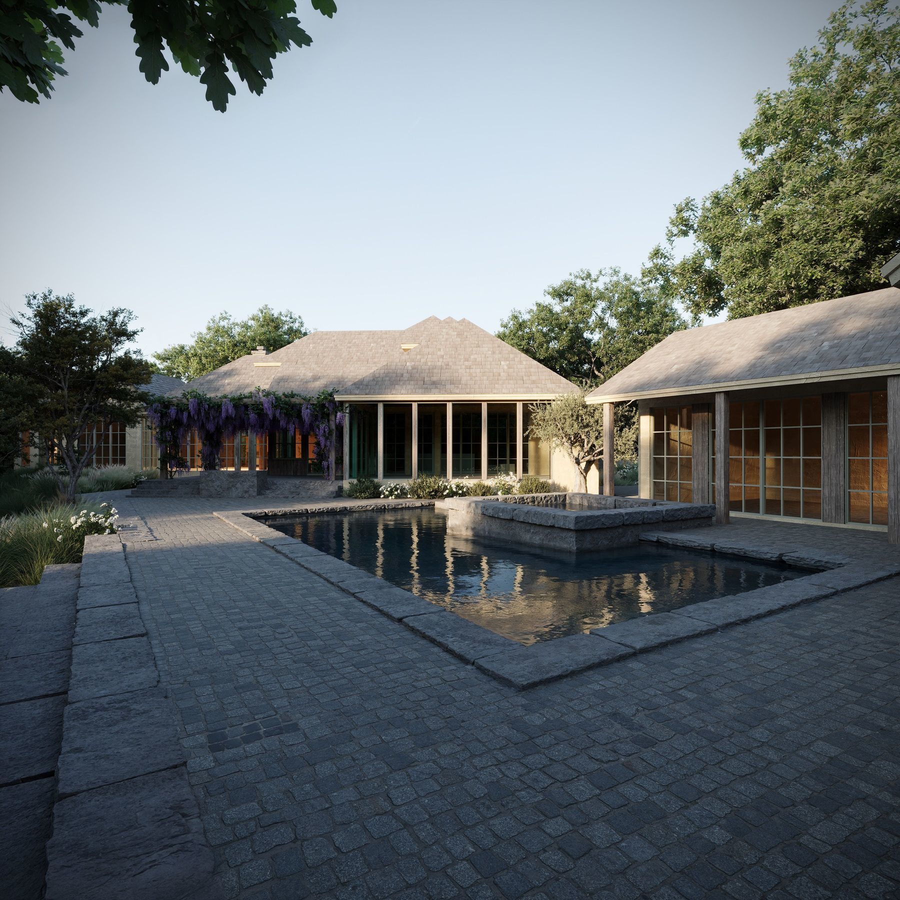 EXTRAORDINARY WESTLAKE HILLS ESTATE - RARE OPPORTUNITY Nestled on 2 pristine acres in coveted Westlake Hills, this secluded estate presents a unique opportunity to own both a masterfully completed guest house and a main residence with unlimited potential. Accessed via a private cul-de-sac and set on a flat, wooded lot with tranquil creek, this property offers unparalleled privacy just minutes from downtown Austin. The immaculately renovated guest house, designed by renowned architect Paul Lamb with interiors by celebrated designer Elizabeth Stanley, serves as an inspirational blueprint for the main residence transformation. Complete architectural plans by this distinguished team are included, offering the rare chance to extend this exquisite design aesthetic throughout the property. The main residence, while awaiting your vision, currently features beautiful wood flooring, custom tile work, wood-beamed vaulted ceilings, and a striking stone fireplace. The gourmet kitchen boasts a professional-grade Wolf range, dual dishwashers, massive island, premium Caesarstone countertops, and a breakfast bar opening to a spacious great room. A lovely screened-in porch provides year-round indoor/outdoor living. Resort-style amenities abound with a stunning pool, adjacent fire pit, fully lit tennis court with integrated speakers, dedicated gym space, and specialized exercise pool with cold plunge—creating a comprehensive wellness retreat within your own estate. Within walking distance to both elementary and high schools, this unique property presents a compelling opportunity to create a cohesive architectural masterpiece or enjoy as-is. An extraordinary canvas awaiting your vision in one of Austin's most prestigious neighborhoods.