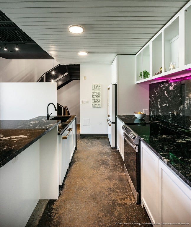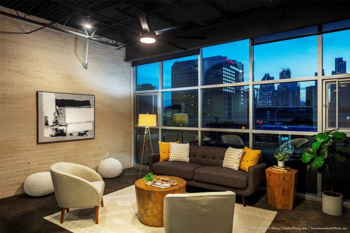 UNIT 106 is a 3-story townhouse style home with dual entrances. Floor-to-ceiling window wall frames striking downtown view from its living area and second level bedroom. Watch the sun sets behind the skyline from the spacious private rooftop deck. Two bedroom suites. 3 dedicated parking spots!!! An attached private 2-car garage (646 SF) w/ split ac unit + dedicated alley parking space. Sixth & Brushy is an architectural presence at the gateway to the vibrant East Sixth Street corridor. Designed by The Lawrence Group, it is one of the original mixed-use developments in East Austin. Characterized by its glass+aluminum curtain wall, the building is comprised of 16 loft-style+ 2 town-house residences, and 6 ground-level creative office/retail spaces. Located in one of the most walkable neighborhoods in Austin, Sixth & Brushy is one block to I-35 & Plaza Saltillo (Whole Foods & Target). Some of our nearby faves include: Brew & Brew, Hopdoddy, Fukumoto, Buenos Aires Cafe, Ramen Tatsuya, Domo Alley Gato, NADC Burger, Pasta|Bar, Il Brutto, Cosmic Saltillo, Suerte, Uptown Sports Club. [Walkability Score: 95/100]