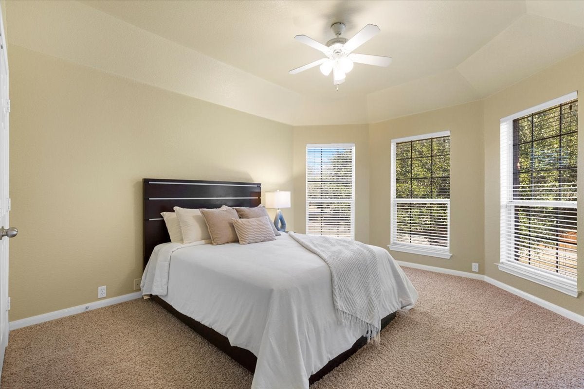 Nestled in the scenic Bella Vista community, this beautifully maintained home sits on a truly rare lot with no rear neighbors, backing directly to a community park, hiking trail, and tranquil creek. Surrounded by rolling hills and mature greenery, the setting offers a level of privacy and natural beauty that is increasingly hard to find. The main-level balcony overlooks the greenbelt and surrounding hills, creating a peaceful, elevated retreat ideal for morning coffee or evening relaxation. The backyard offers exceptional privacy and open views, and features a private gated entrance that allows direct access from the backyard to the trail beyond the fence—making daily walks, nature time, and outdoor enjoyment effortlessly accessible. Inside, the home features a functional and spacious floor plan with 5 bedrooms and 3.5 bathrooms, complemented by a 3-car garage providing ample space for parking and storage. The primary suite is conveniently located on the main level, offering privacy and comfort, while secondary bedrooms are positioned upstairs. The open main living area showcases high ceilings, large windows, and abundant natural light, creating an airy and inviting atmosphere throughout. The lower level provides valuable flexible space, ideal for a media room, game room, home gym, or additional entertaining area, allowing the home to adapt easily to a variety of lifestyles. This home has been exceptionally well cared for by the owner, reflecting pride of ownership throughout. Roof with upgraded gutters was installed recently, outdoor deck, HVAC units and water heater have been replaced as well. With its private, nature-backed lot, direct gated trail access, a 3-car garage, and a well-designed interior layout, this property presents an exceptional opportunity for buyers seeking space, privacy, and a serene setting in a highly desirable neighborhood.