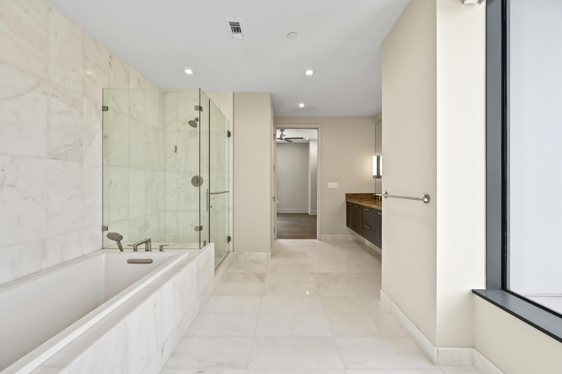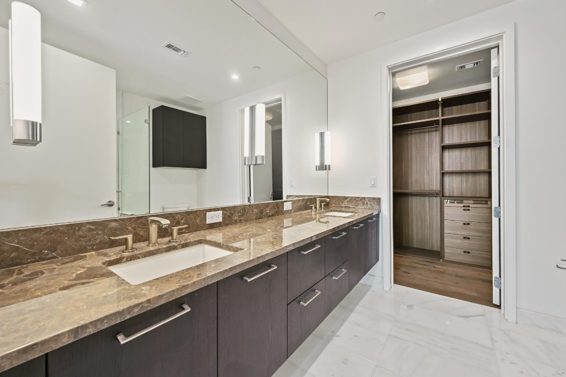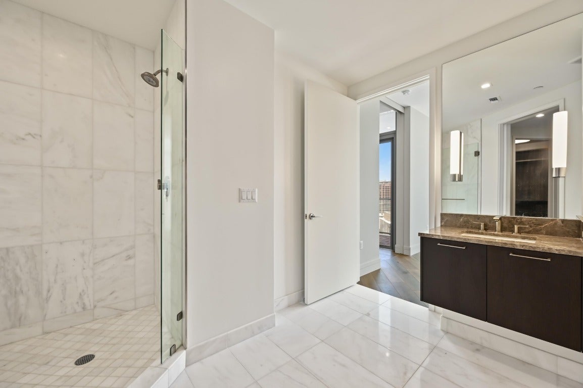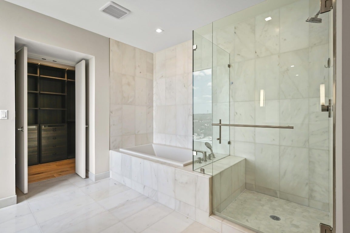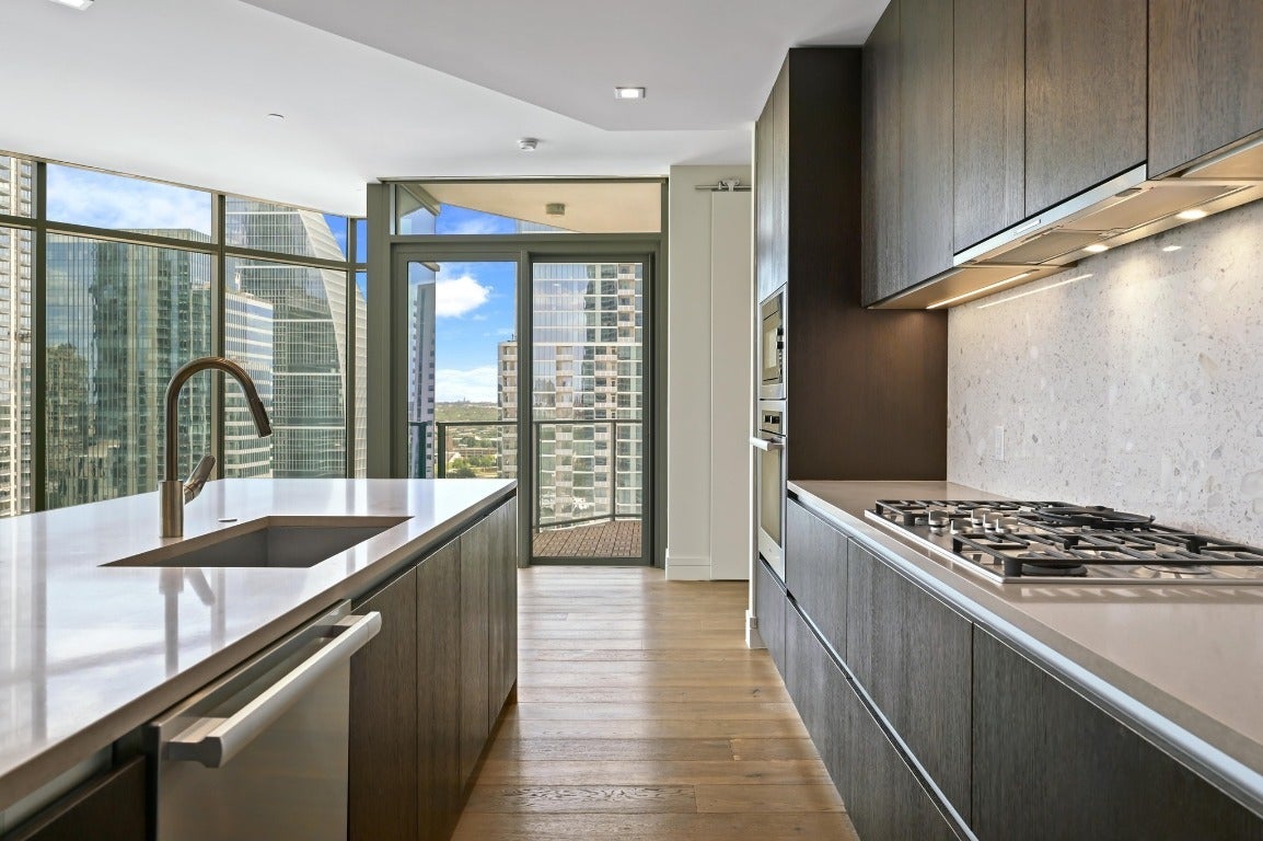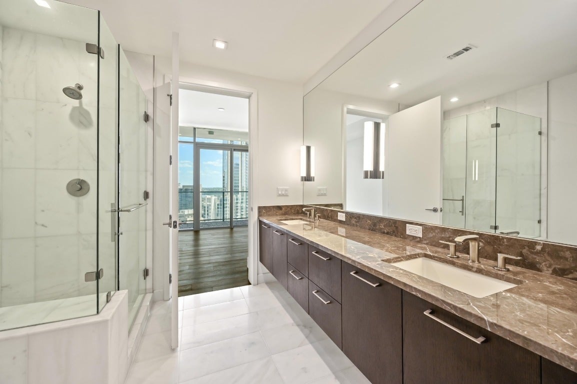 Desirable 3 bedroom residence at the prestigious Fifth & West—offering exceptional scale, privacy, and design pedigree at the best price for this floor plan and SE view orientation. This 3-bedroom + study, 3-bath unit showcases sweeping southeast-facing views of the Austin skyline and Lady Bird Lake through floor-to-ceiling, UV-filtering windows. Designed for both entertaining and everyday living, it features two private terraces, a chef’s kitchen with a 10-ft quartz waterfall island, custom Italian cabinetry, Miele appliances, and a walk-in pantry. The dedicated study and sunlit primary suite include dual walk-in closets and a spa-inspired bath. Wide-plank white oak floors, motorized shades, Hansgrohe and Kohler fixtures, and keyless smart-home technology enhance the refined interior. Includes full-size laundry room, two premium parking spaces, and private storage. Fifth & West residents enjoy resort-style amenities including 24-hour concierge, pool, yoga and fitness studio, guest suites, pet park, and conference room. Designed by an award-winning team, this residence delivers the best of downtown living—panoramic views, thoughtful design, and timeless sophistication.