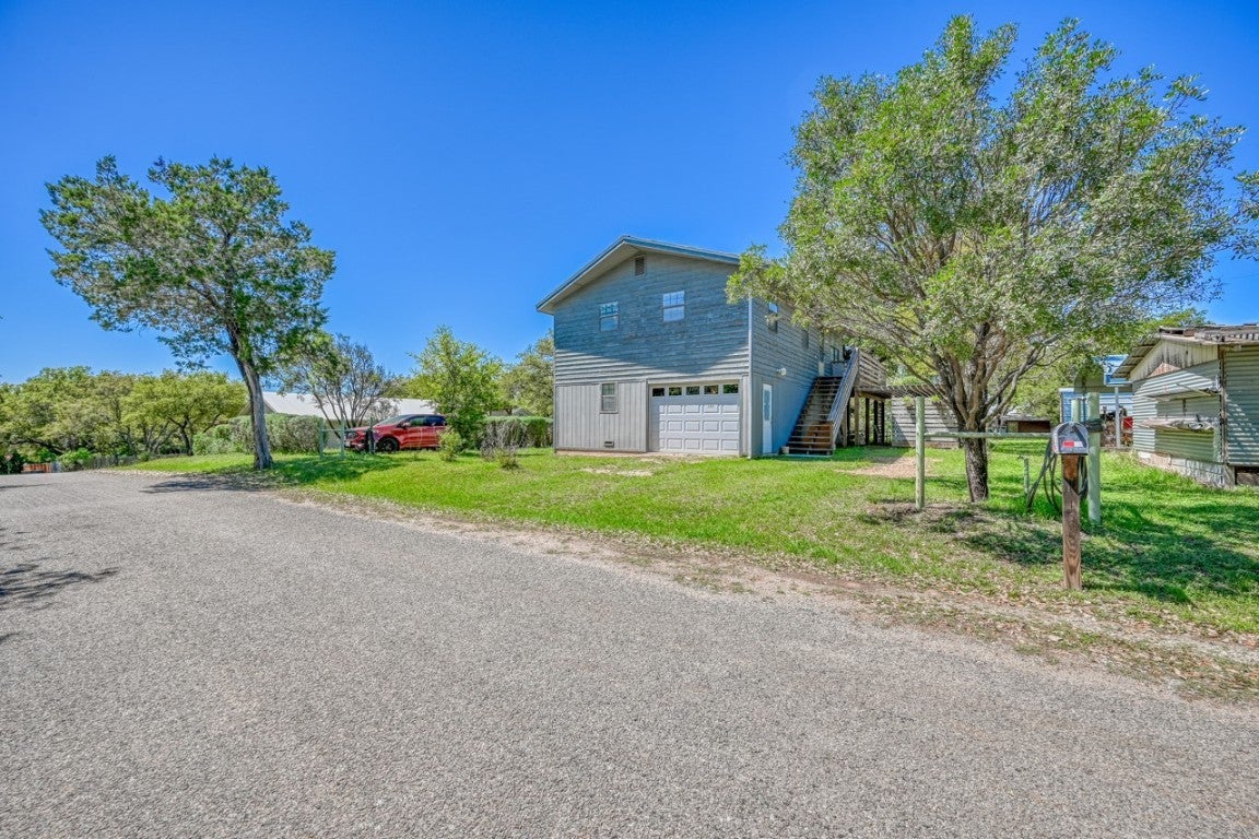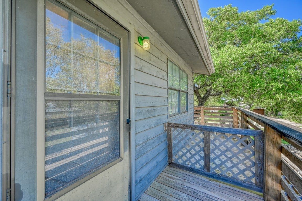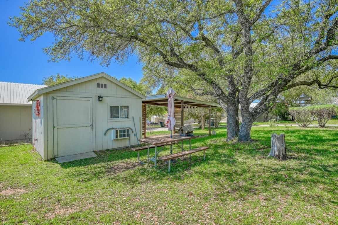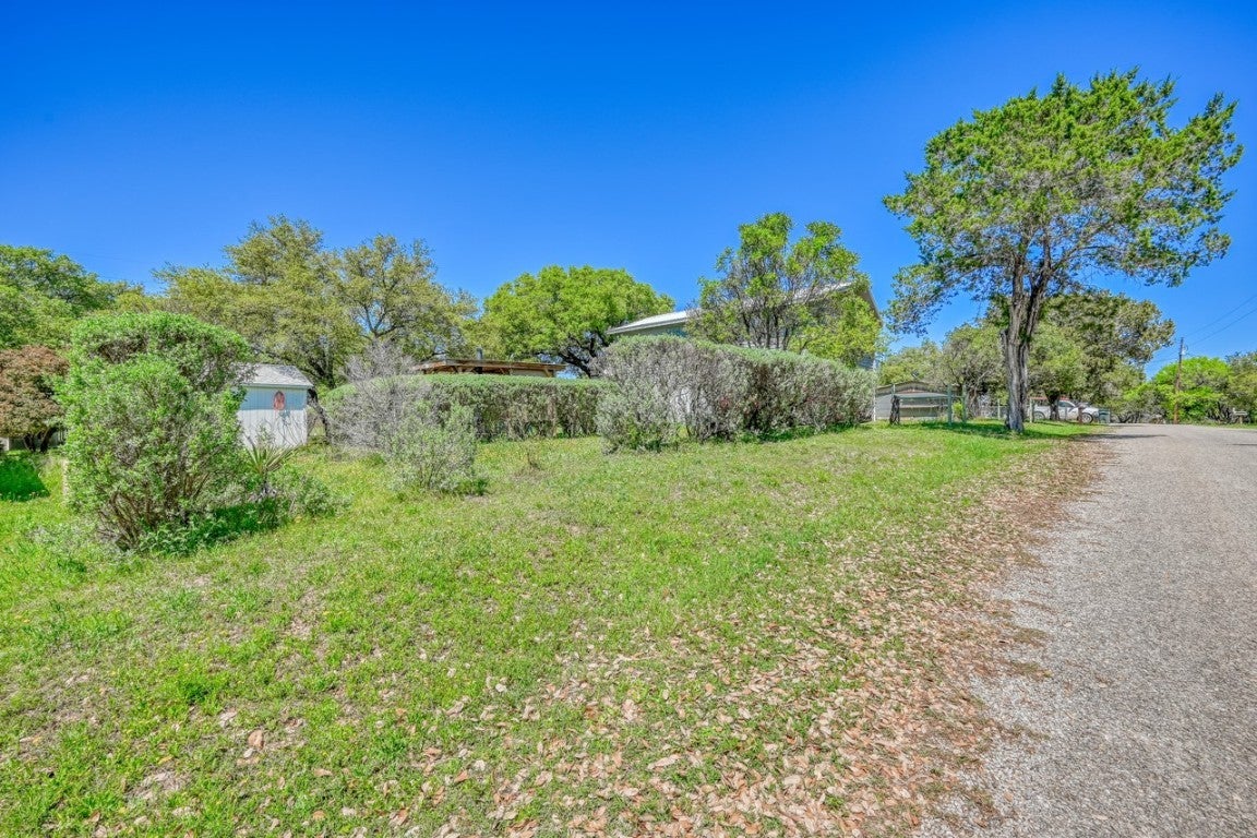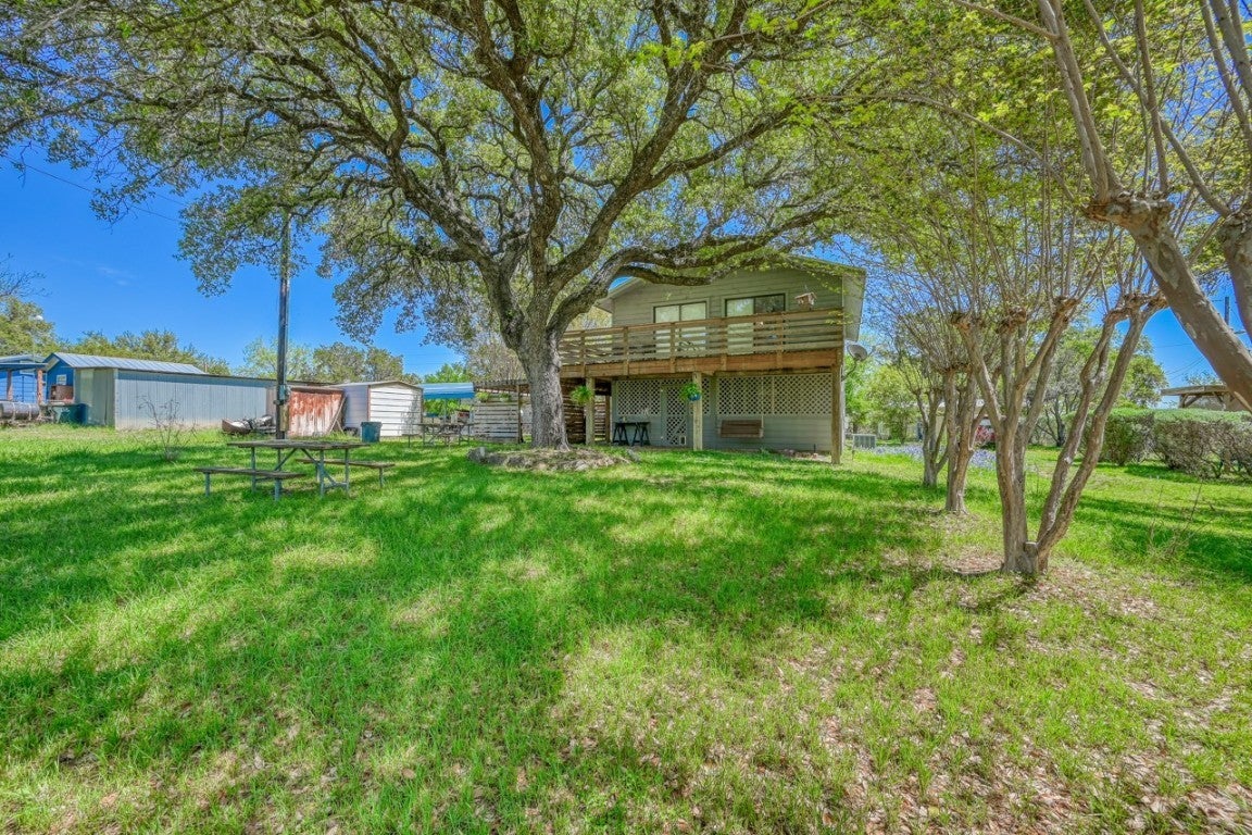 Discover the lake lifestyle with Lake Travis living in this custom home, never on the market before, in the quiet community of Eagle's Bluff, Spicewood, TX. This home may make an excellent multi-generational option. Downstairs boasts an open large area with window/wall ac and electric heater, laundry/kitchenette, full bathroom, and additional room that is referenced as the third bedroom, alongside the one-car garage. Ascend upstairs to find the main living and dining, full kitchen, two bedrooms, and full bathroom. Large balcony extends across the back of the house. Tranquil setting is complemented by a private screened chiminea area for lounging and relaxing. Storage building/workshop is perfect for the hobbyist and attached to the two-car carport. This striking residence is perched on two generously sized lots, presenting a unique opportunity to own a piece of paradise with unparalleled potential for customization and expansion. With its blend of comfort and access to nature's finest, it's poised to be the backdrop for your most cherished moments. Welcome to your Lake Travis sanctuary, where every day feels like a getaway. This property has tons of opportunities and is priced to sell. Check it out now before it is gone!