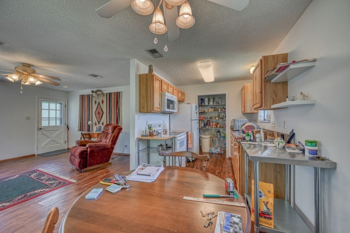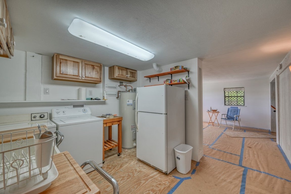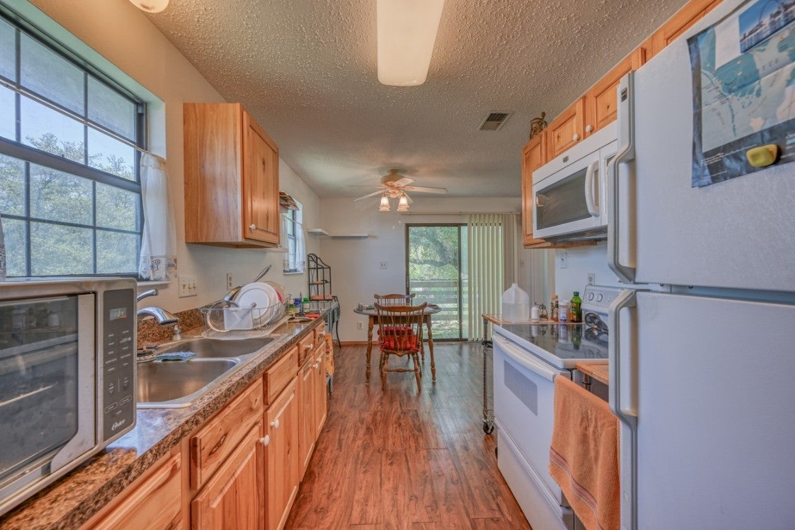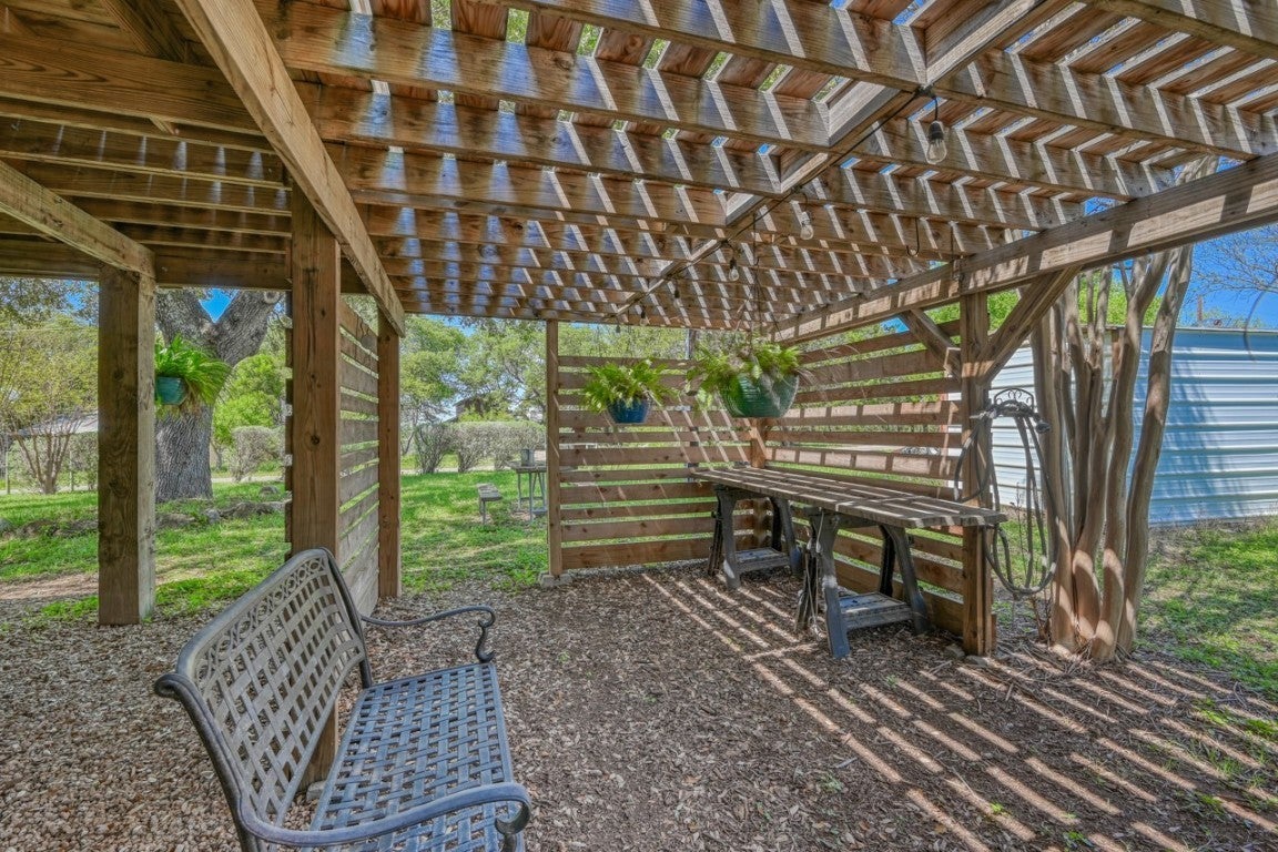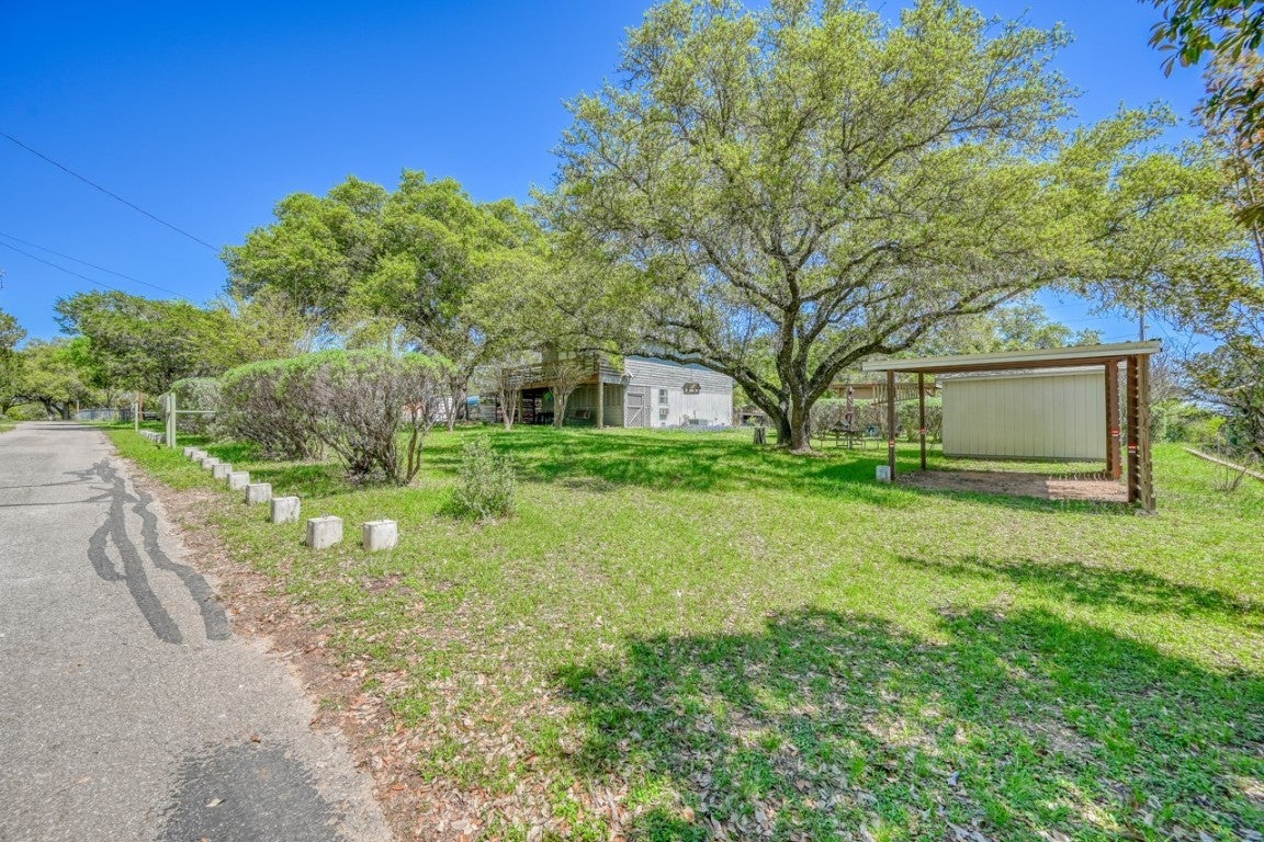 Discover the lake lifestyle with Lake Travis living in this custom home, never on the market before, in the quiet community of Eagle's Bluff, Spicewood, TX. This home may make an excellent multi-generational option. Downstairs boasts an open large area with window/wall ac and electric heater, laundry/kitchenette, full bathroom, and additional room that is referenced as the third bedroom, alongside the one-car garage. Ascend upstairs to find the main living and dining, full kitchen, two bedrooms, and full bathroom. Large balcony extends across the back of the house. Tranquil setting is complemented by a private screened chiminea area for lounging and relaxing. Storage building/workshop is perfect for the hobbyist and attached to the two-car carport. This striking residence is perched on two generously sized lots, presenting a unique opportunity to own a piece of paradise with unparalleled potential for customization and expansion. With its blend of comfort and access to nature's finest, it's poised to be the backdrop for your most cherished moments. Welcome to your Lake Travis sanctuary, where every day feels like a getaway. This property has tons of opportunities and is priced to sell. Check it out now before it is gone!