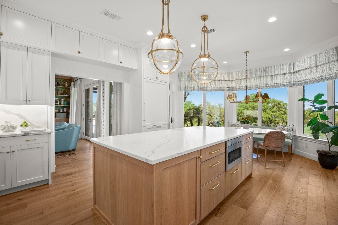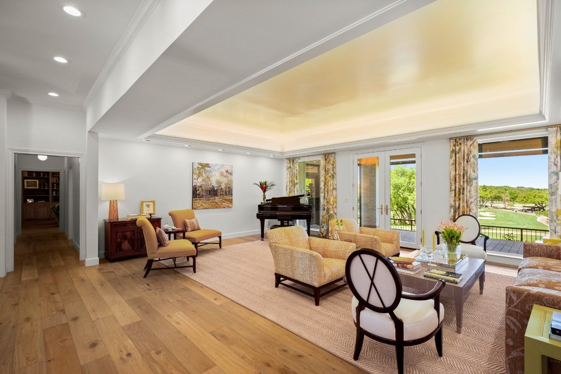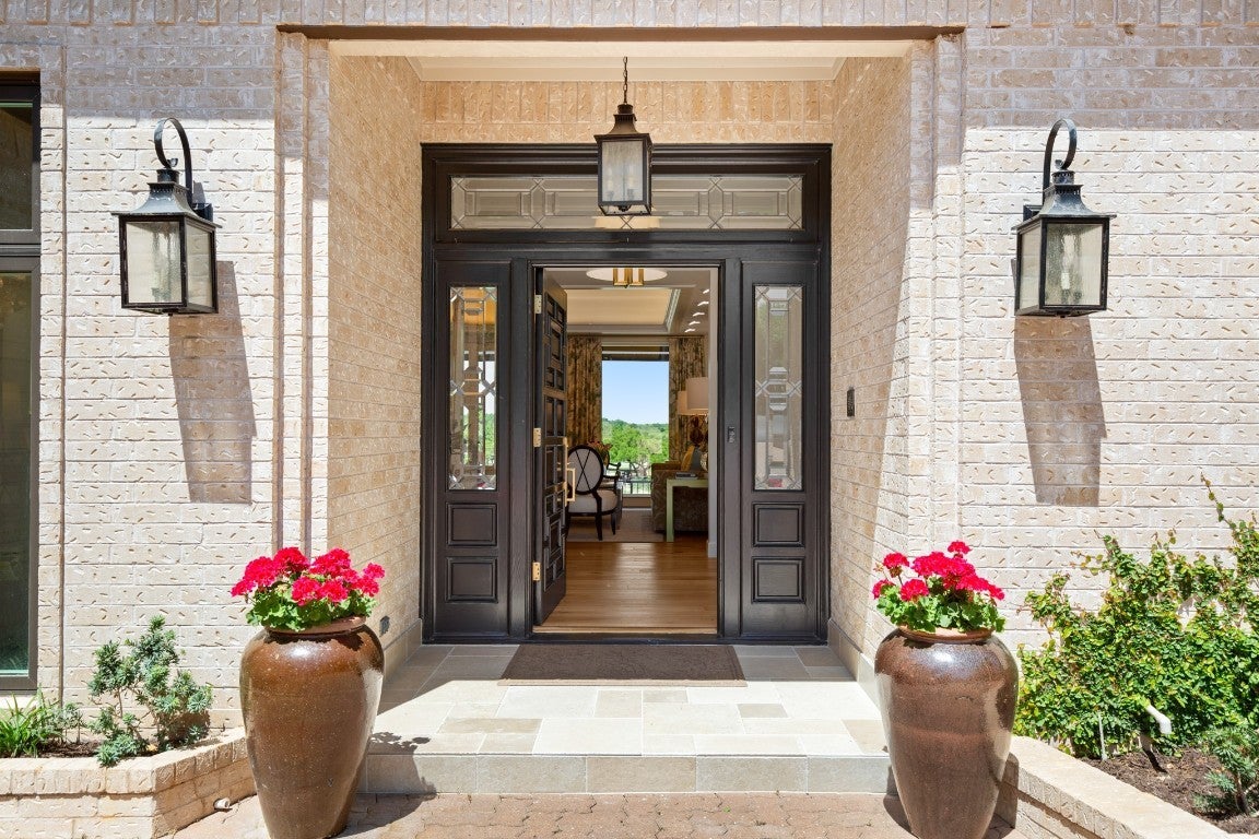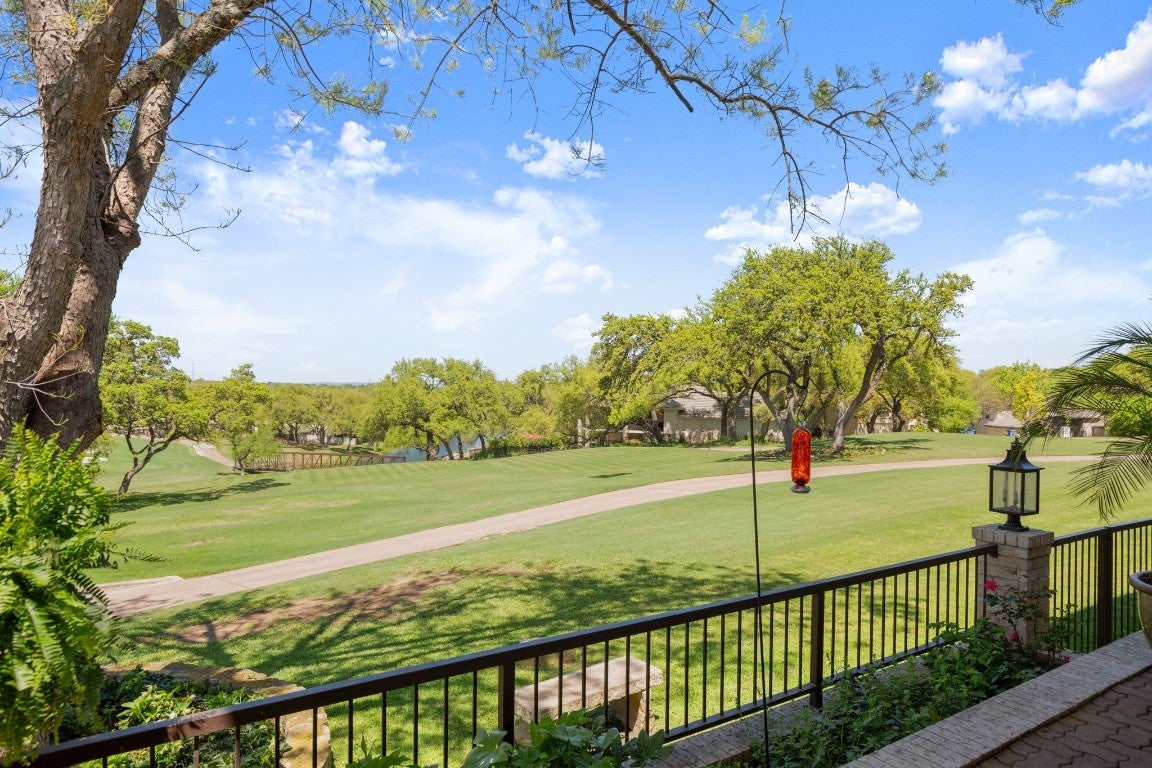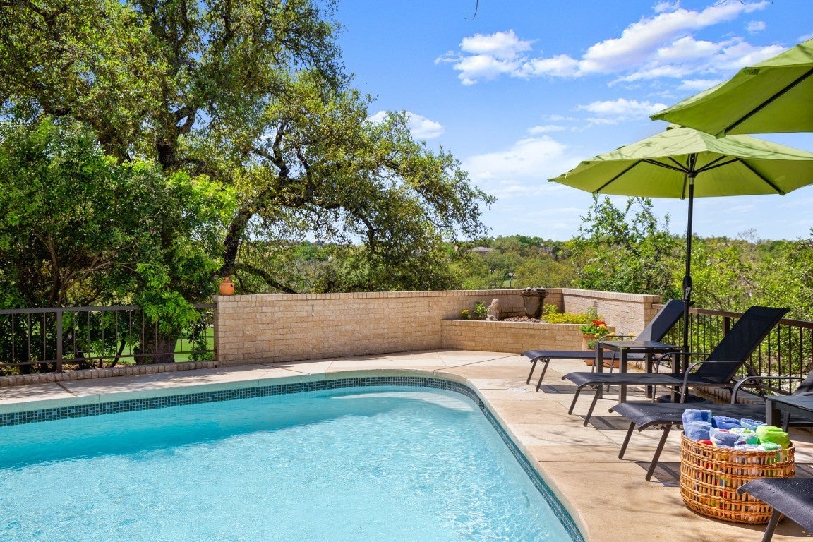 Wake up every morning in your own Palm Beach-inspired golf resort. This picturesque traditional family home has been renovated to perfection and sits on a private lot nestled in a cul-de-sac and on fairways #13 and #14 of The Hills of Lakeway golf course. Flawless interior design touches in every room, this vibrant family home is the ideal property for those seeking stunning views and quick access to the course and community clubhouse. This colorful two-story home features four bedrooms, four full and two half baths. A gourmet kitchen in the center of the home offers panoramic views and a breakfast nook overlooking the pond. The spacious primary bedroom on the first level includes breathtaking views of the course with a private fireplace, lounge area, and large walk-in closet and shower. There are two light-filled living areas downstairs, with a fireplace and formal dining, and an elevator to the second level, where the airy designs and classical details for each space continue. The second primary suite upstairs features a private balcony overlooking endless views of the greens. There are also two additional bedrooms on the second level, including an optional living/game room featuring a wet bar, and a study. Outside, the impressive driveway leads to a spacious two-car and golf cart garage, along with an attached workshop and garden room. The oasis-like pool is surrounded by lush greenery and opulent oak trees that offer additional privacy and natural ambience. Absolutely brimming with old-world glamor and sophistication with a modern twist, this home is sure to transport you to your own personal paradise!