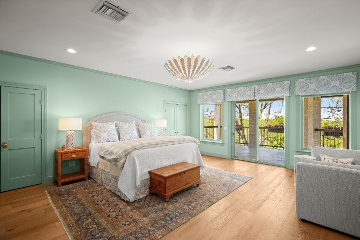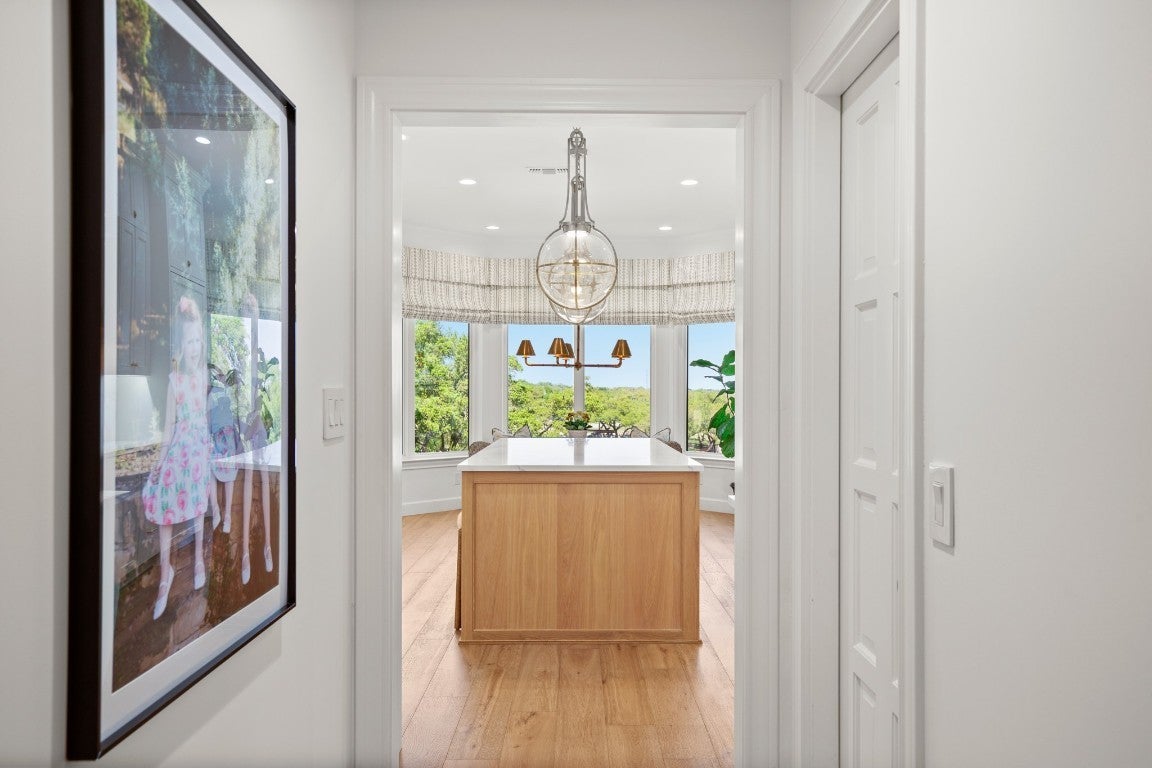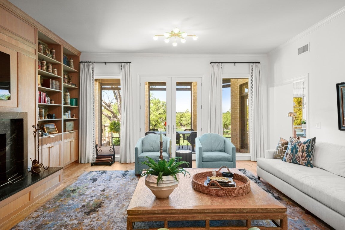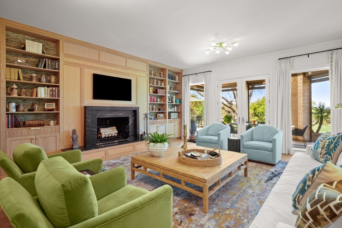 Wake up every morning in your own Palm Beach-inspired golf resort. This picturesque traditional family home has been renovated to perfection and sits on a private lot nestled in a cul-de-sac and on fairways #13 and #14 of The Hills of Lakeway golf course. Flawless interior design touches in every room, this vibrant family home is the ideal property for those seeking stunning views and quick access to the course and community clubhouse. This colorful two-story home features four bedrooms, four full and two half baths. A gourmet kitchen in the center of the home offers panoramic views and a breakfast nook overlooking the pond. The spacious primary bedroom on the first level includes breathtaking views of the course with a private fireplace, lounge area, and large walk-in closet and shower. There are two light-filled living areas downstairs, with a fireplace and formal dining, and an elevator to the second level, where the airy designs and classical details for each space continue. The second primary suite upstairs features a private balcony overlooking endless views of the greens. There are also two additional bedrooms on the second level, including an optional living/game room featuring a wet bar, and a study. Outside, the impressive driveway leads to a spacious two-car and golf cart garage, along with an attached workshop and garden room. The oasis-like pool is surrounded by lush greenery and opulent oak trees that offer additional privacy and natural ambience. Absolutely brimming with old-world glamor and sophistication with a modern twist, this home is sure to transport you to your own personal paradise!