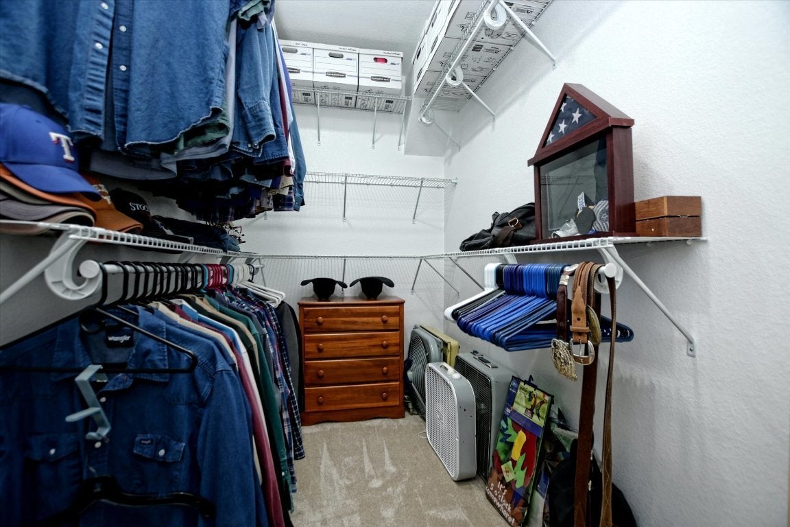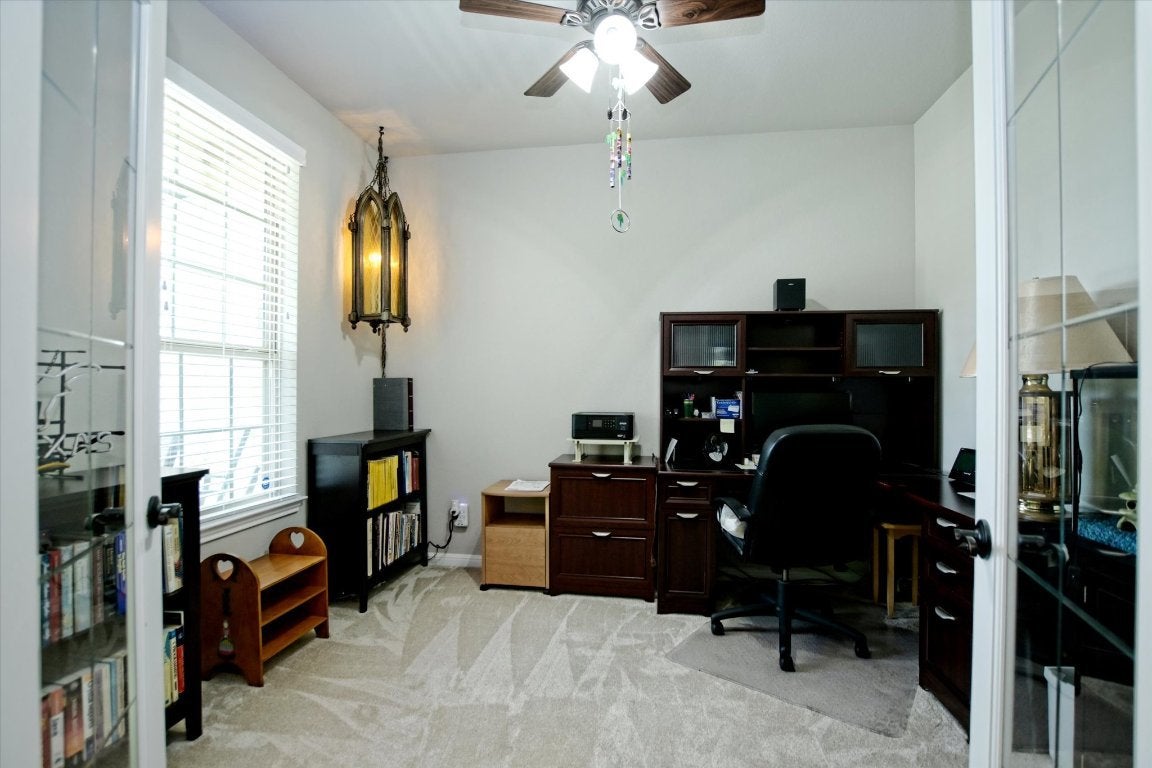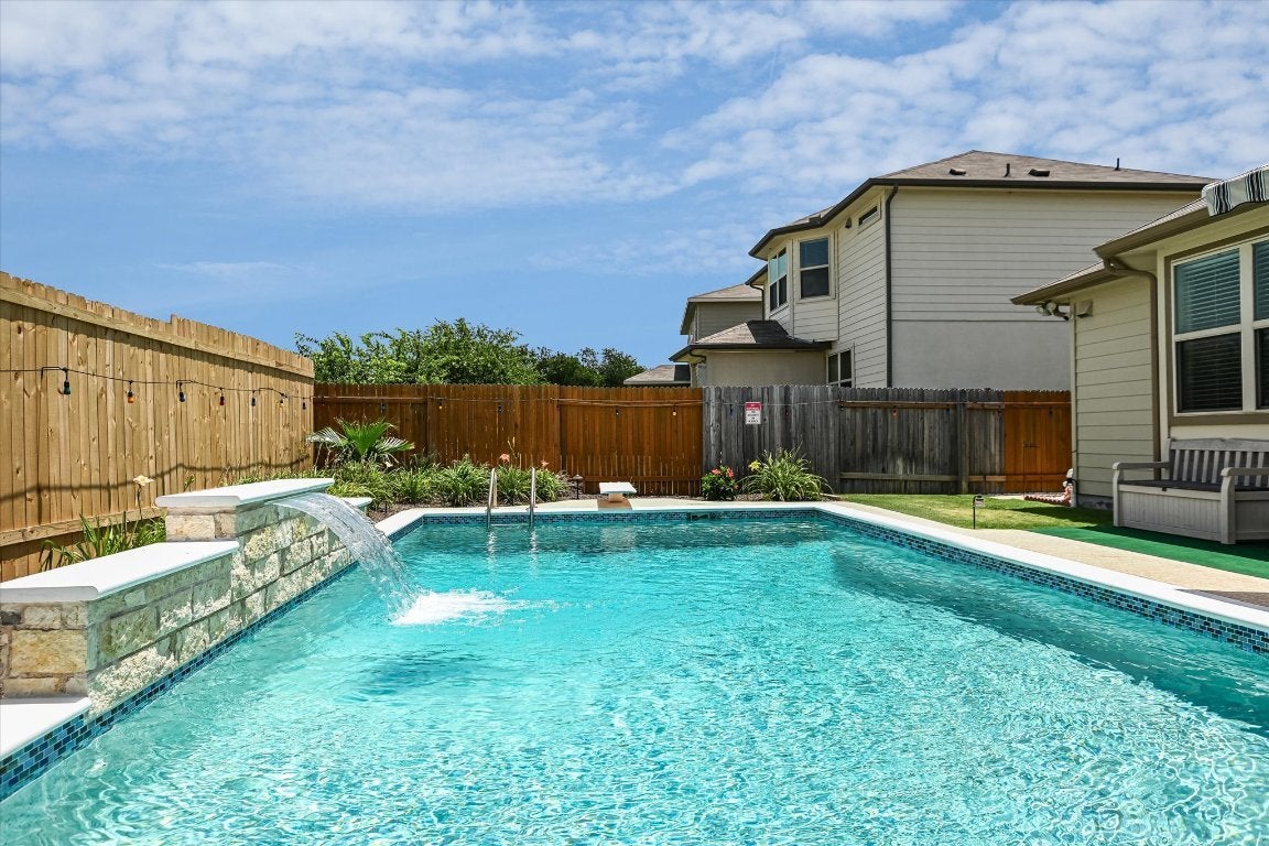 Customized home! Built by the current owner who has retired and is moving back to Virginia. This mother-in-law floorplan was thoughtfully designed to lead you to the back yard. As you enter through the Texas Star Glass front door, on the left is a dedicated office with beveled glass French doors. Moving into the heart of the home, the kitchen opens into the dining and living area (10' ceilings) with windows overlooking the BEAUTIFUL 16' X 34', 3' to 8' pool with waterfall and diving board. A 13' X 7' retractable awning shades the oversized patio. Back inside, the kitchen has granite counters, a glass tile backsplash, under and over the counter lighting and gleaming black appliances. Bay windows over look the pool from the spacious primary bedroom. Other upgrades: water softener (March 2025), security system with 4 cameras, premium garage door opener (belt run with a security camera - operated from an app on your phone, foam insulation, landscape lighting, flood lights, 8 foot fence, new carpet and tile 2024 and fresh paint, exterior and interior.