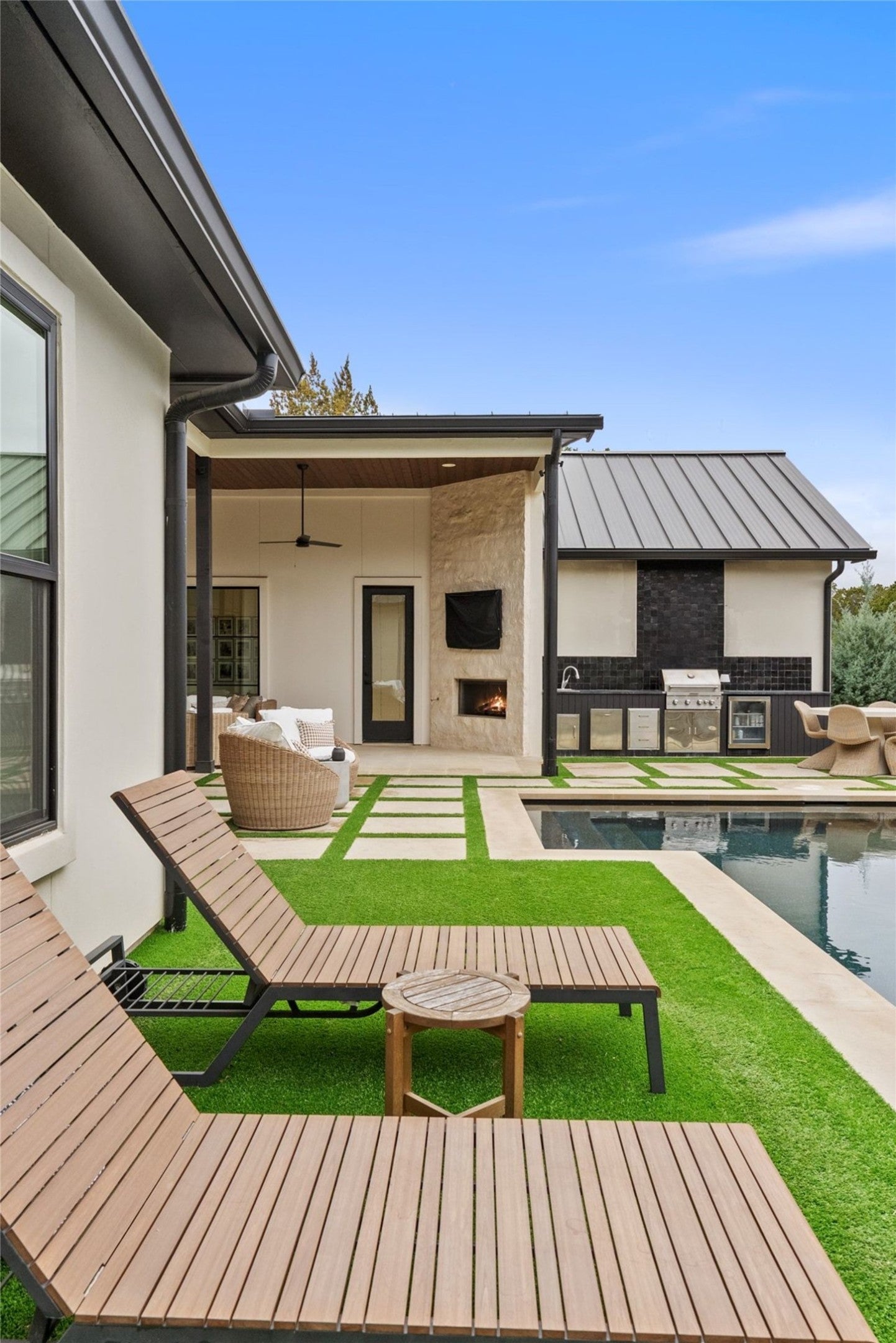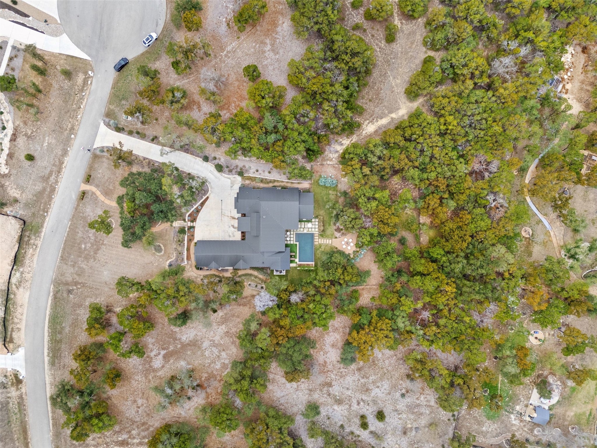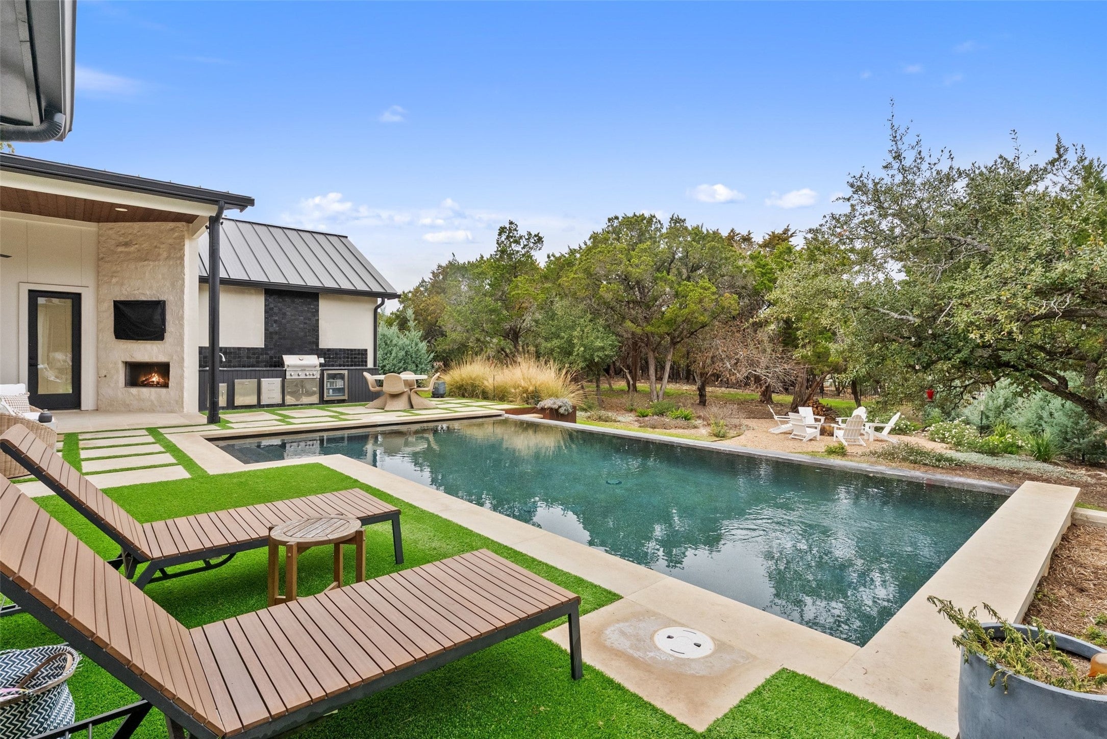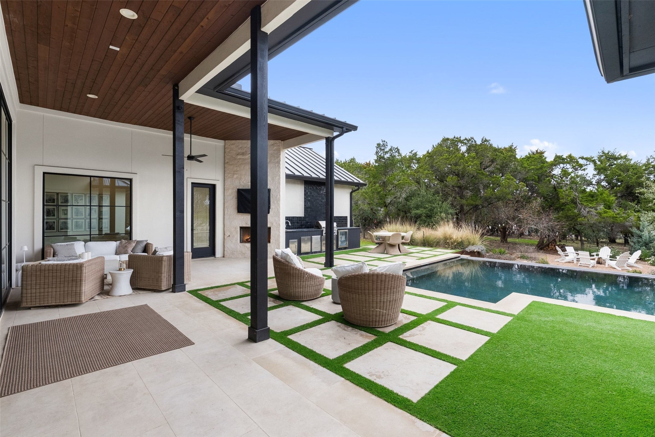 Welcome to a refined retreat in the coveted La Ventana community of Driftwood, where thoughtful architecture, elevated finishes, and natural beauty come together on 1.58 private, tree-filled acres. A long, winding driveway framed by landscaping sets a serene, nature-forward tone and offers exceptional privacy. Inside, natural light fills the open concept living, dining, and kitchen spaces, anchored by a dramatic custom steel and glass full wall window system with an integrated sliding door that creates a seamless indoor outdoor connection. European white oak flooring runs throughout, complemented by custom chandeliers, a statement fireplace with floating shelves, and effortless flow designed for living and entertaining. The chef’s kitchen is a true centerpiece with a quartz-clad island, leathered granite countertops, and Thermador appliances. A dedicated planning room, along with a coffee and beverage bar features quartz counters, built-in storage, and a beverage refrigerator. Supporting spaces include a mudroom with custom lockers, a finished utility room with quartz counters and sink, and a private home office with built-ins located adjacent to a full bath—ideal for guests or work-from-home flexibility. The primary suite is a peaceful retreat with direct outdoor access. Outside, the fully fenced backyard features manicured zoysia lawn, native landscaping, irrigation, and ambient lighting. A covered patio with fireplace and fully equipped outdoor kitchen complete with soapstone counters, zellige tile, built-in grill, and beverage fridge sets the stage for year-round entertaining. Recent upgrades include updated lighting, fresh interior paint, whole house water filtration and softening, dual tankless water heaters, instant hot water, 220V garage wiring, and a rain catchment system supplying the pool. La Ventana residents enjoy miles of trails, equestrian paths, and a grand community lodge with pools, fitness, tennis, and pickleball, just a short drive to Austin.