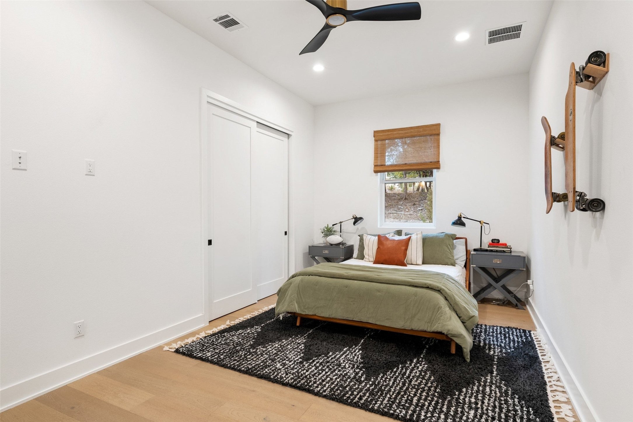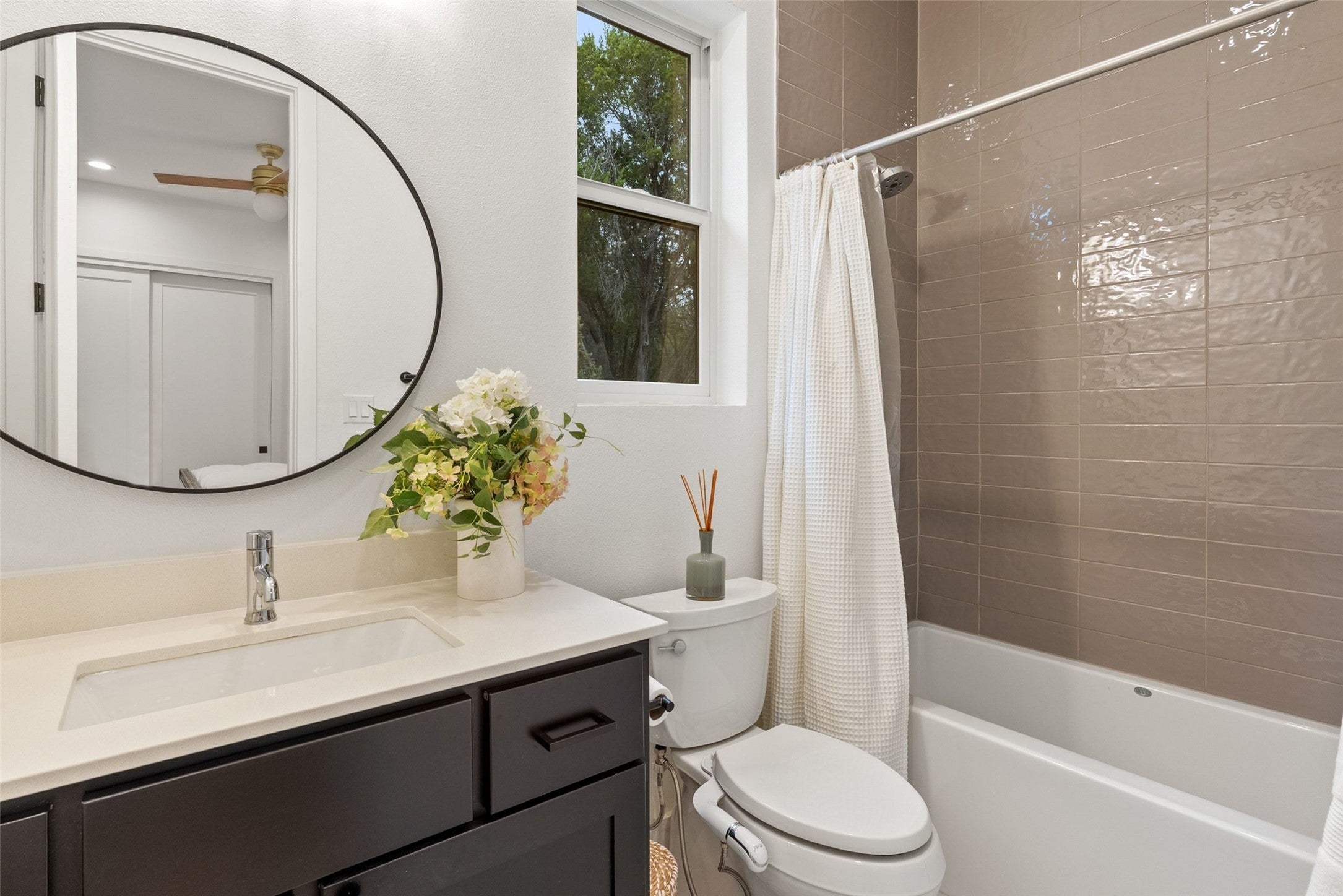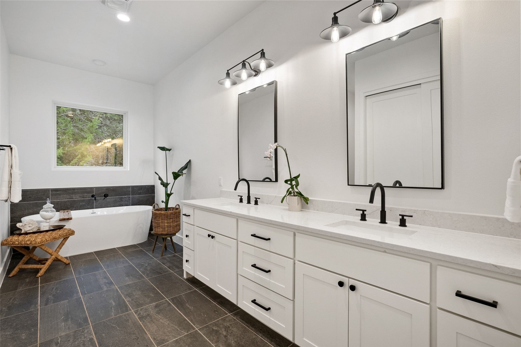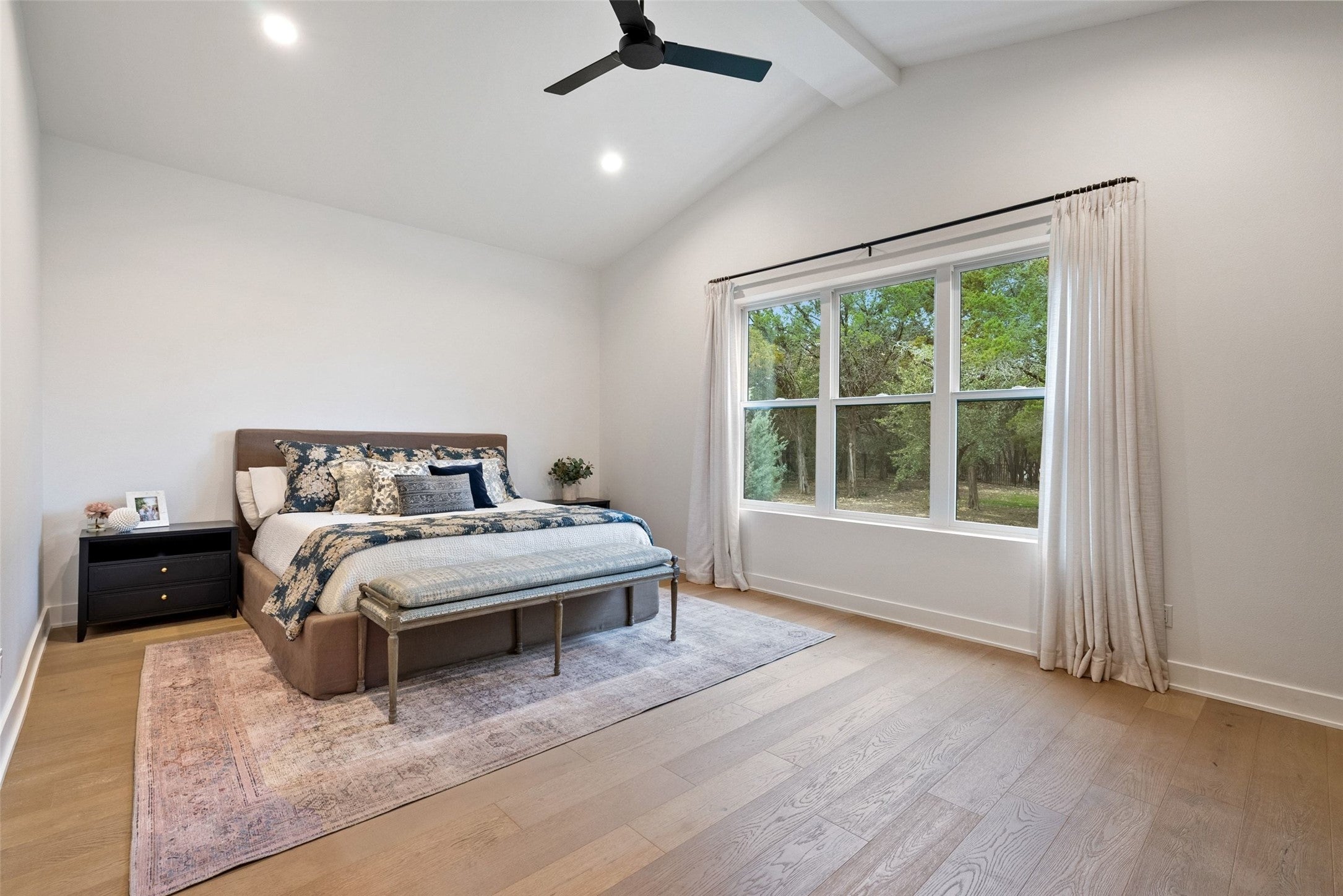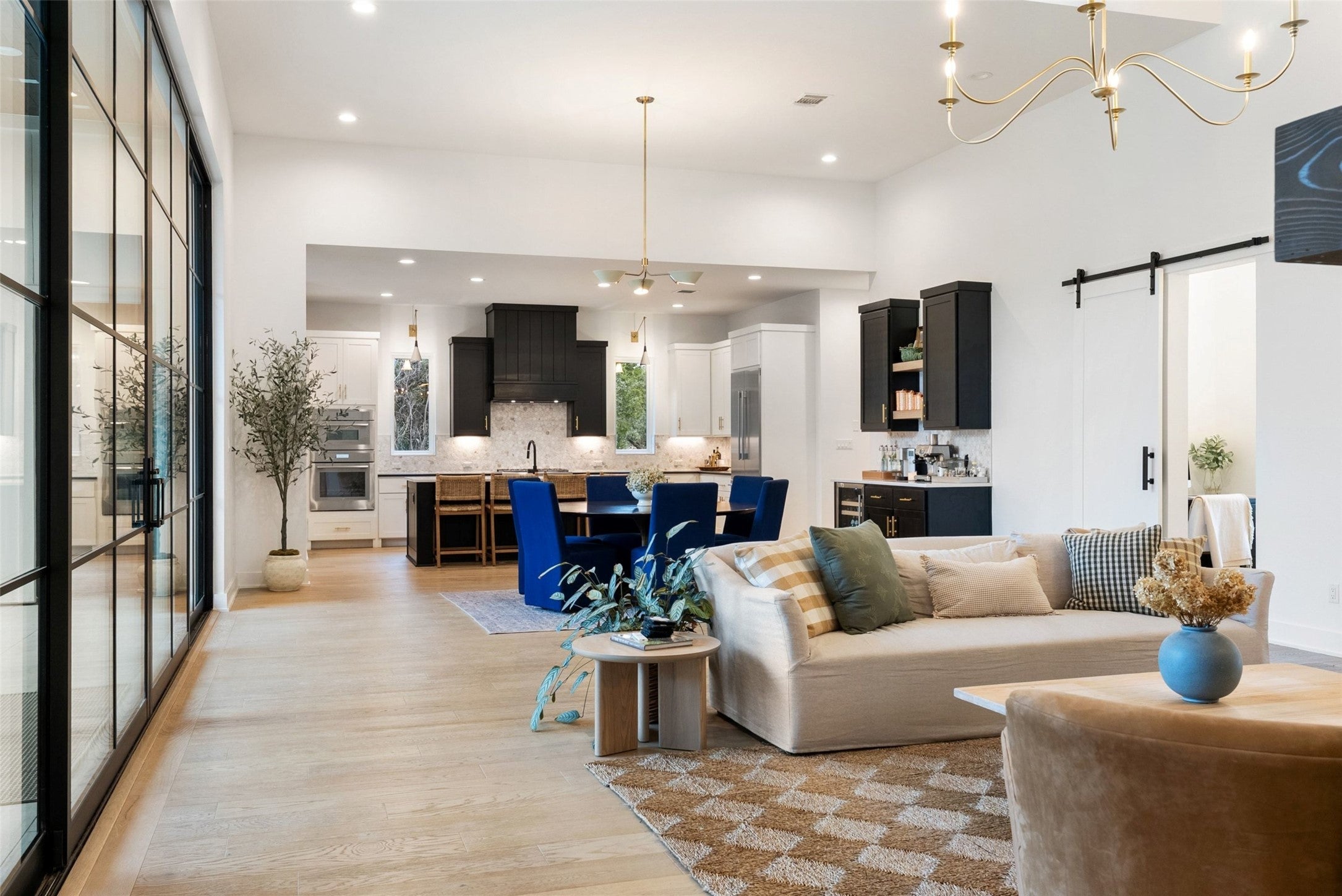 Welcome to a refined retreat in the coveted La Ventana community of Driftwood, where thoughtful architecture, elevated finishes, and natural beauty come together on 1.58 private, tree-filled acres. A long, winding driveway framed by landscaping sets a serene, nature-forward tone and offers exceptional privacy. Inside, natural light fills the open concept living, dining, and kitchen spaces, anchored by a dramatic custom steel and glass full wall window system with an integrated sliding door that creates a seamless indoor outdoor connection. European white oak flooring runs throughout, complemented by custom chandeliers, a statement fireplace with floating shelves, and effortless flow designed for living and entertaining. The chef’s kitchen is a true centerpiece with a quartz-clad island, leathered granite countertops, and Thermador appliances. A dedicated planning room, along with a coffee and beverage bar features quartz counters, built-in storage, and a beverage refrigerator. Supporting spaces include a mudroom with custom lockers, a finished utility room with quartz counters and sink, and a private home office with built-ins located adjacent to a full bath—ideal for guests or work-from-home flexibility. The primary suite is a peaceful retreat with direct outdoor access. Outside, the fully fenced backyard features manicured zoysia lawn, native landscaping, irrigation, and ambient lighting. A covered patio with fireplace and fully equipped outdoor kitchen complete with soapstone counters, zellige tile, built-in grill, and beverage fridge sets the stage for year-round entertaining. Recent upgrades include updated lighting, fresh interior paint, whole house water filtration and softening, dual tankless water heaters, instant hot water, 220V garage wiring, and a rain catchment system supplying the pool. La Ventana residents enjoy miles of trails, equestrian paths, and a grand community lodge with pools, fitness, tennis, and pickleball, just a short drive to Austin.