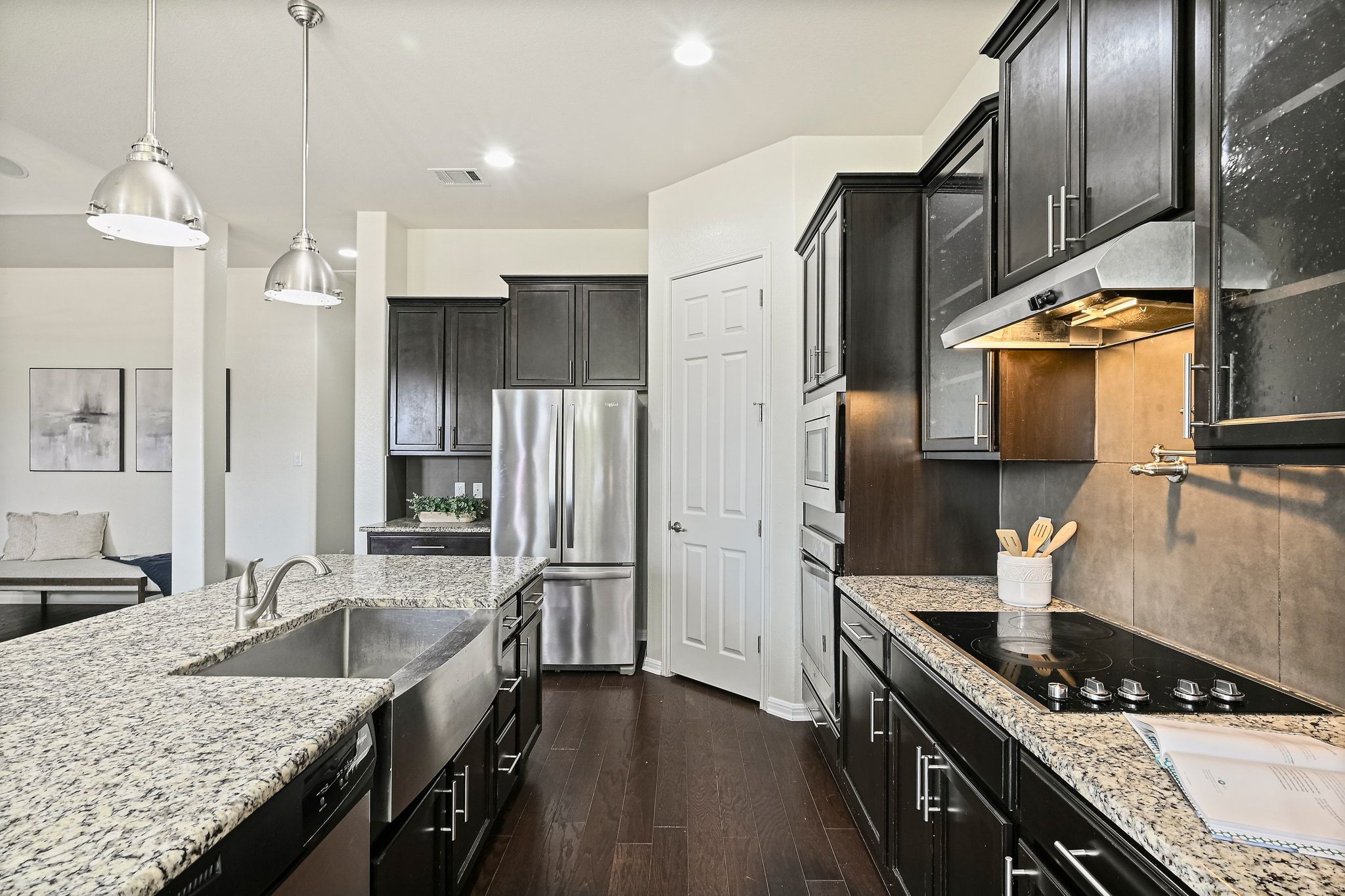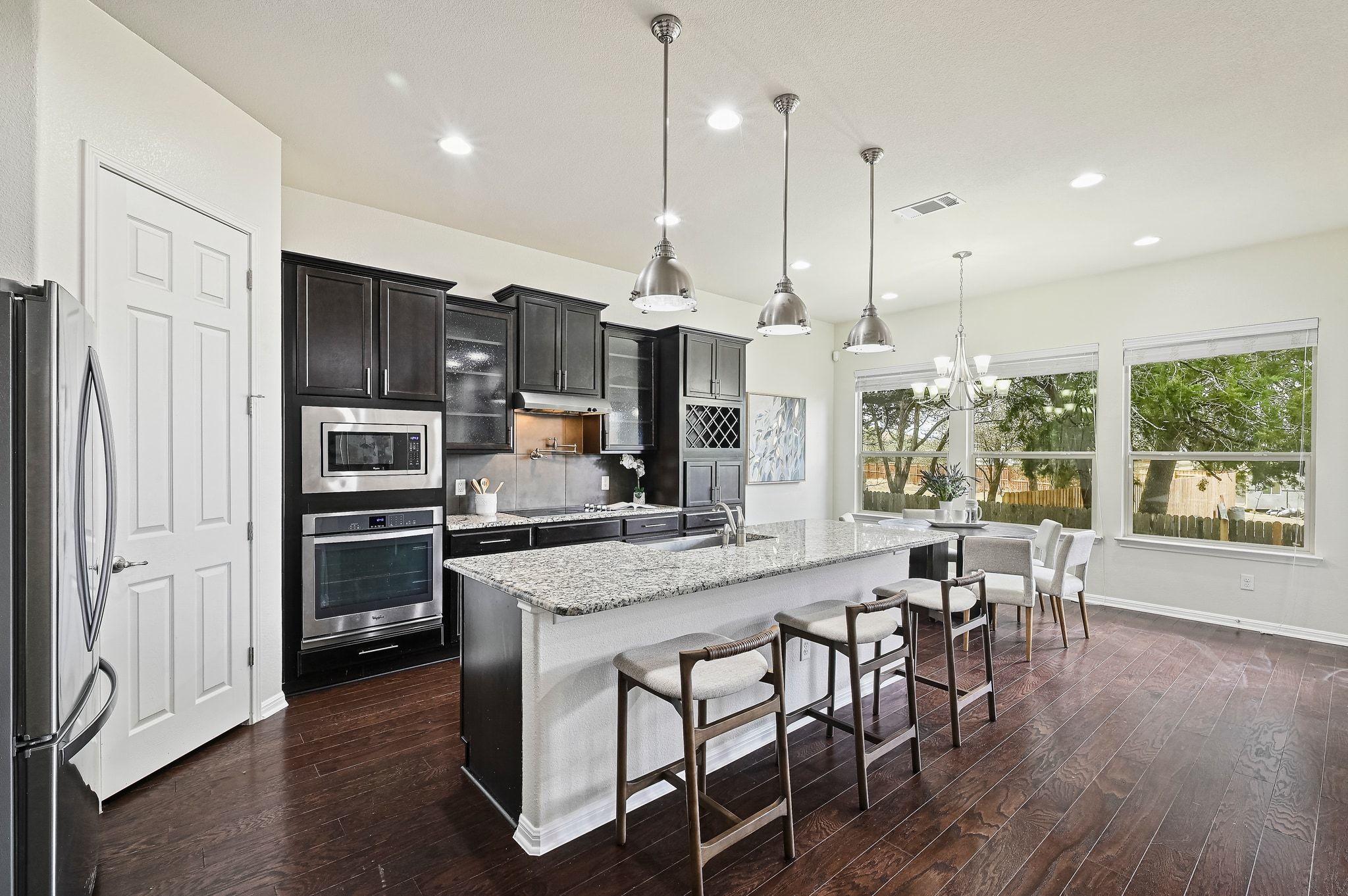 Thoughtfully positioned with no direct backyard neighbor, this spacious single-story, east-facing home features 4 bedrooms, 3 full baths, a dedicated home office, and a desirable open-concept main area with a fresh, warm, and neutral paint color (01/2026) enhanced by abundant natural light. The heart of the home offers a gourmet kitchen adorned with granite counters, rich espresso cabinetry, an island for entertaining, and SS appliances including a built-in oven, microwave, and farm sink. Beautiful glass-front cabinet accents and a plethora of built-in wine storage enhance the high-end design. Built-in speakers in the living room create an environment that beckons for entertaining. The fortunate new owners will love the primary retreat, wrapped in windows on two walls and complete with an ensuite bathroom featuring separate vanities, a soaking tub, a walk-in shower, and a large walk-in closet. One secondary bedroom offers an en-suite bathroom making it perfect for guests or a mother-in law suite. It offers an ideal, secluded location from the other bedrooms. Intentional, functional, and high-end features throughout the home include 8-foot doors, 10-foot ceilings, epoxy garage floors in the 3-car garage, and a sizable floored attic for storage. Enjoy the feeling of a rural setting in your backyard with a covered patio overlooking the open space behind the home. Prepare for evenings unwinding, grilling, and entertaining guests. This friendly Reserve at Brushy Creek community grants you access to a community pool and park, access to nearby greenbelts, Brushy Creek trails, sports park and Brushy Creek Lake Park. You'll be ideally located just minutes from major thoroughfares and endless shopping and dining options. Zoned to Leander schools and within a stones throw from the Apple campus, this home ensures convenient accessibility! Schedule a showing today and experience the beauty, functionality, and convenience that awaits in your dream Cedar Park home!