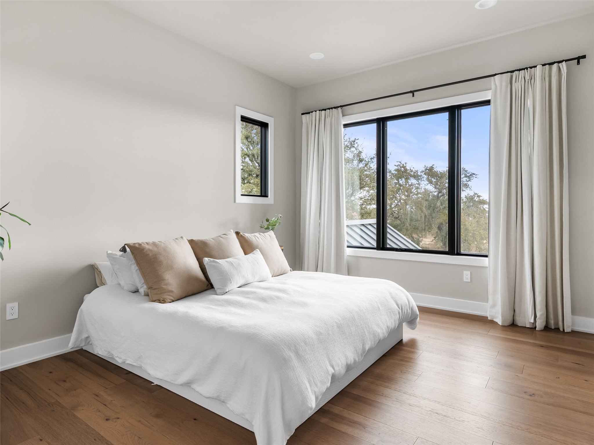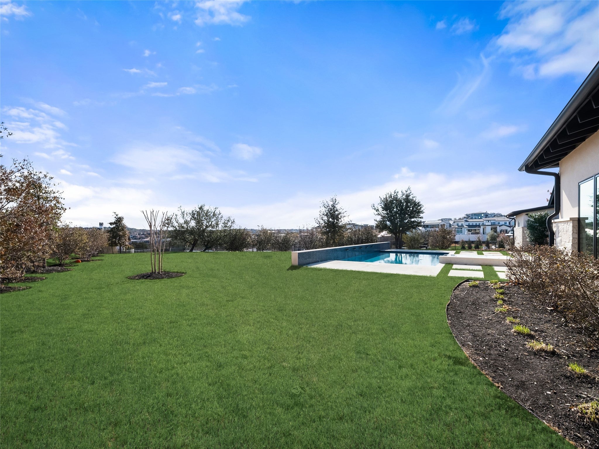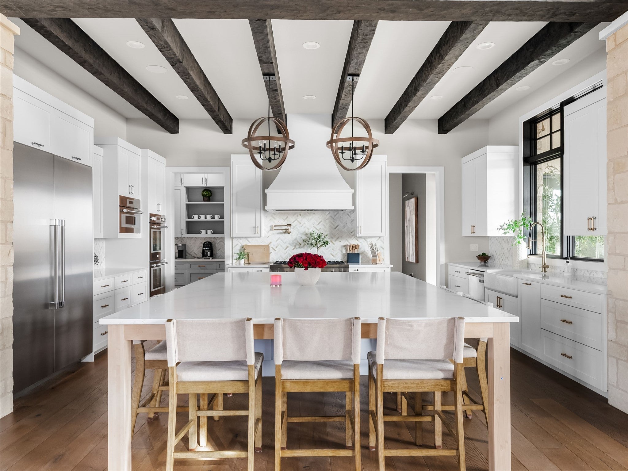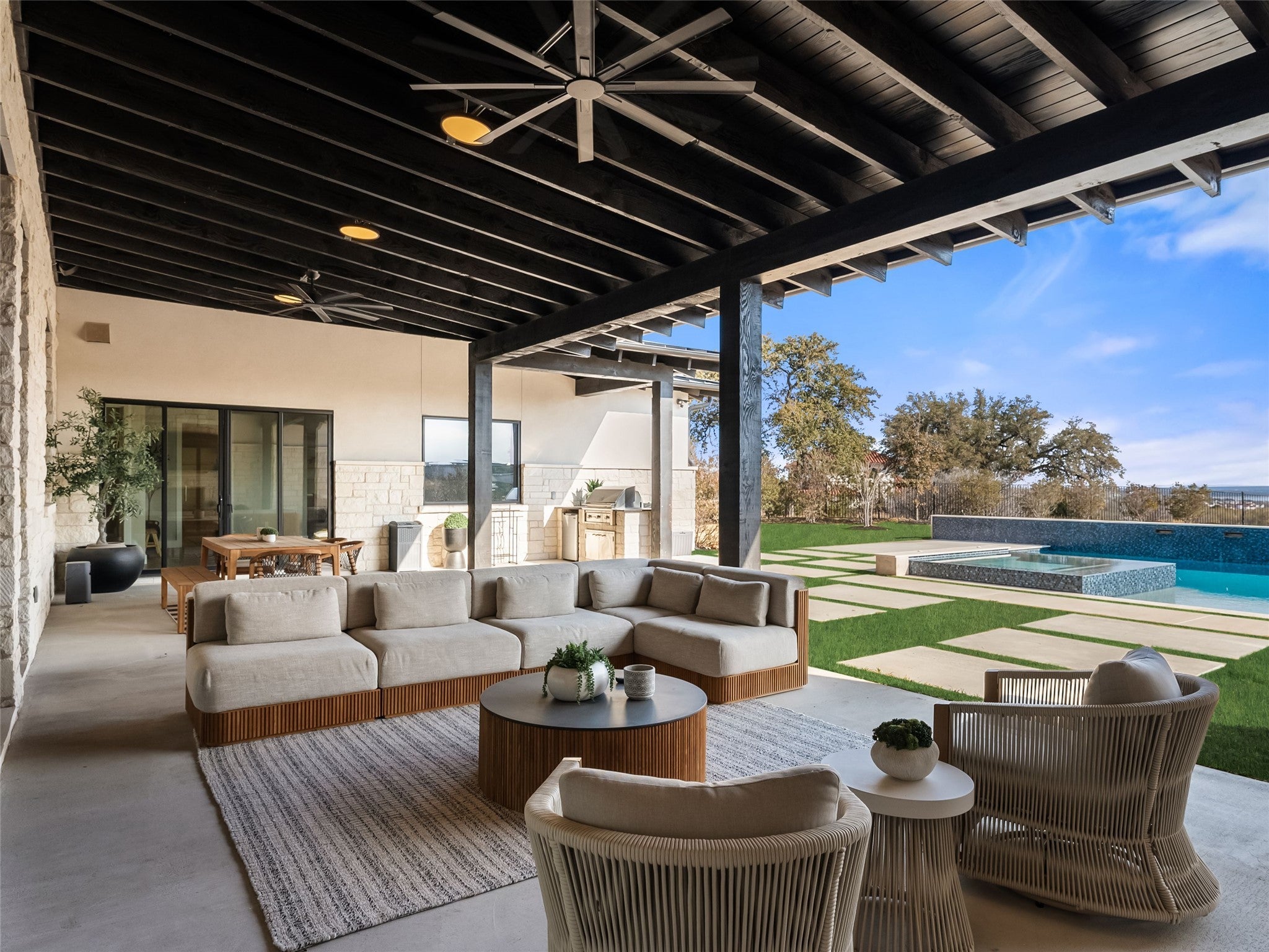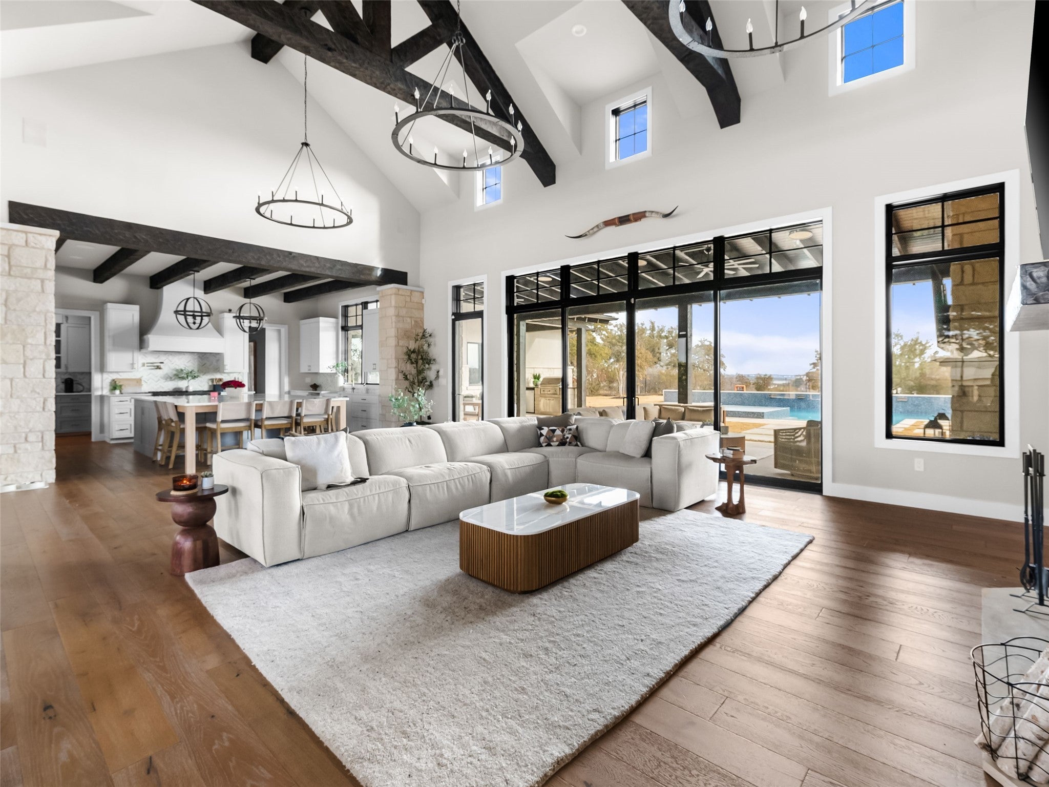 Set within The Peninsula, a gated enclave of Rough Hollow, The Bliss is a custom 2021 residence that balances refined design with effortless livability. Positioned on just under an acre in one of Lakeway’s most desirable communities, this 5-bedroom, 5,600+ square foot home was thoughtfully designed for both elevated entertaining and everyday living. Soaring ceilings with exposed wood trusses anchor the main living space, while a dramatic floor-to-ceiling stone fireplace creates a striking focal point. French oak floors, custom tile work, and expansive walls of windows fill the interiors with natural light, creating a clean and timeless aesthetic. The kitchen is both beautiful and functional, featuring Thermador stainless steel appliances, double ovens, quartz surfaces, and a generous eat-in island designed for gathering. A butler’s pantry enhances flow and makes entertaining seamless. Privately positioned on the main level, the primary suite serves as a true retreat, with large windows and a spa-inspired bath complete with a soaking tub, oversized walk-in shower, dual vanities, and spacious closets. Also on the main level are two dedicated office spaces, a guest suite, and an additional living area, offering exceptional flexibility. Upstairs, secondary bedrooms feature en-suite baths alongside an expansive additional living space. Outdoors, a Millennium pool anchors the private backyard, complemented by covered outdoor living and a fireplace, creating a peaceful setting for year-round enjoyment. Residents enjoy Rough Hollow’s resort-caliber amenities, including a marina on Lake Travis, pools, fitness facilities, trails, and parks—offering a lifestyle that is both elevated and effortless.