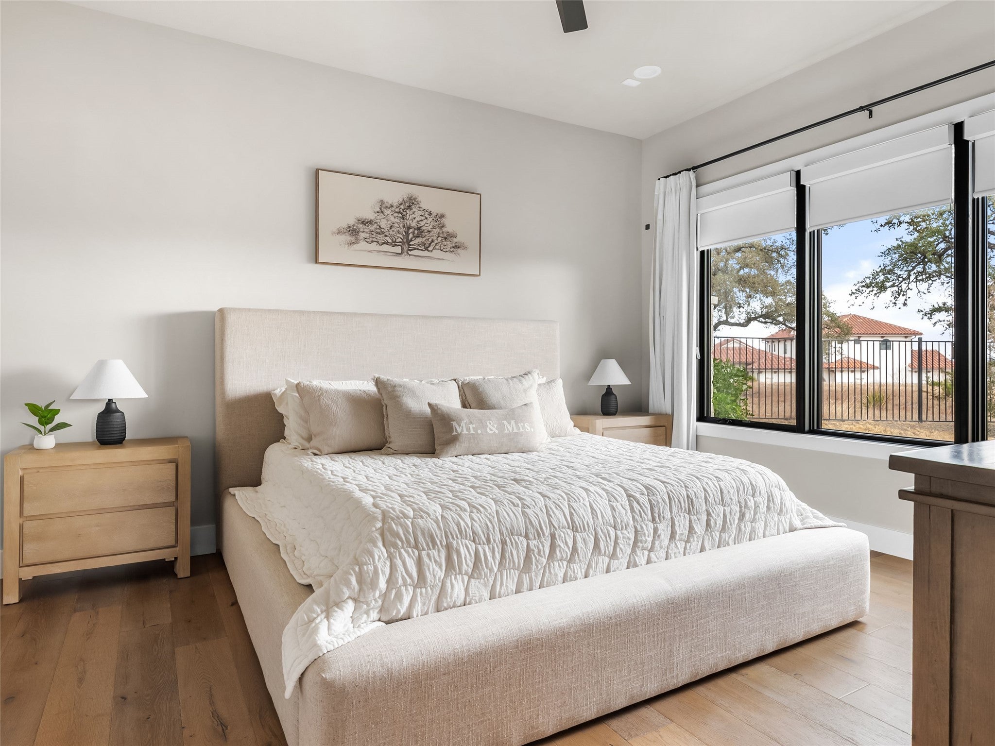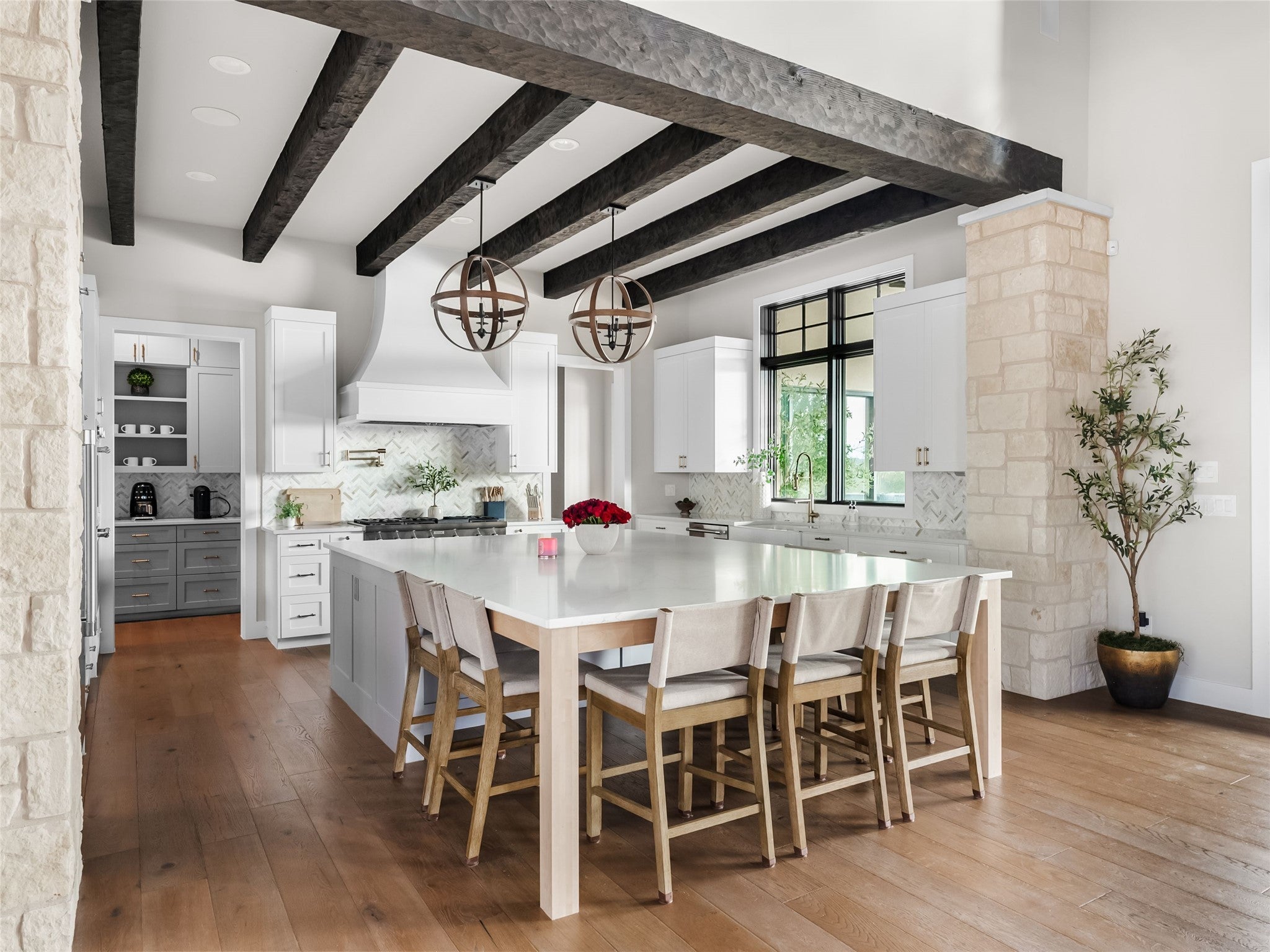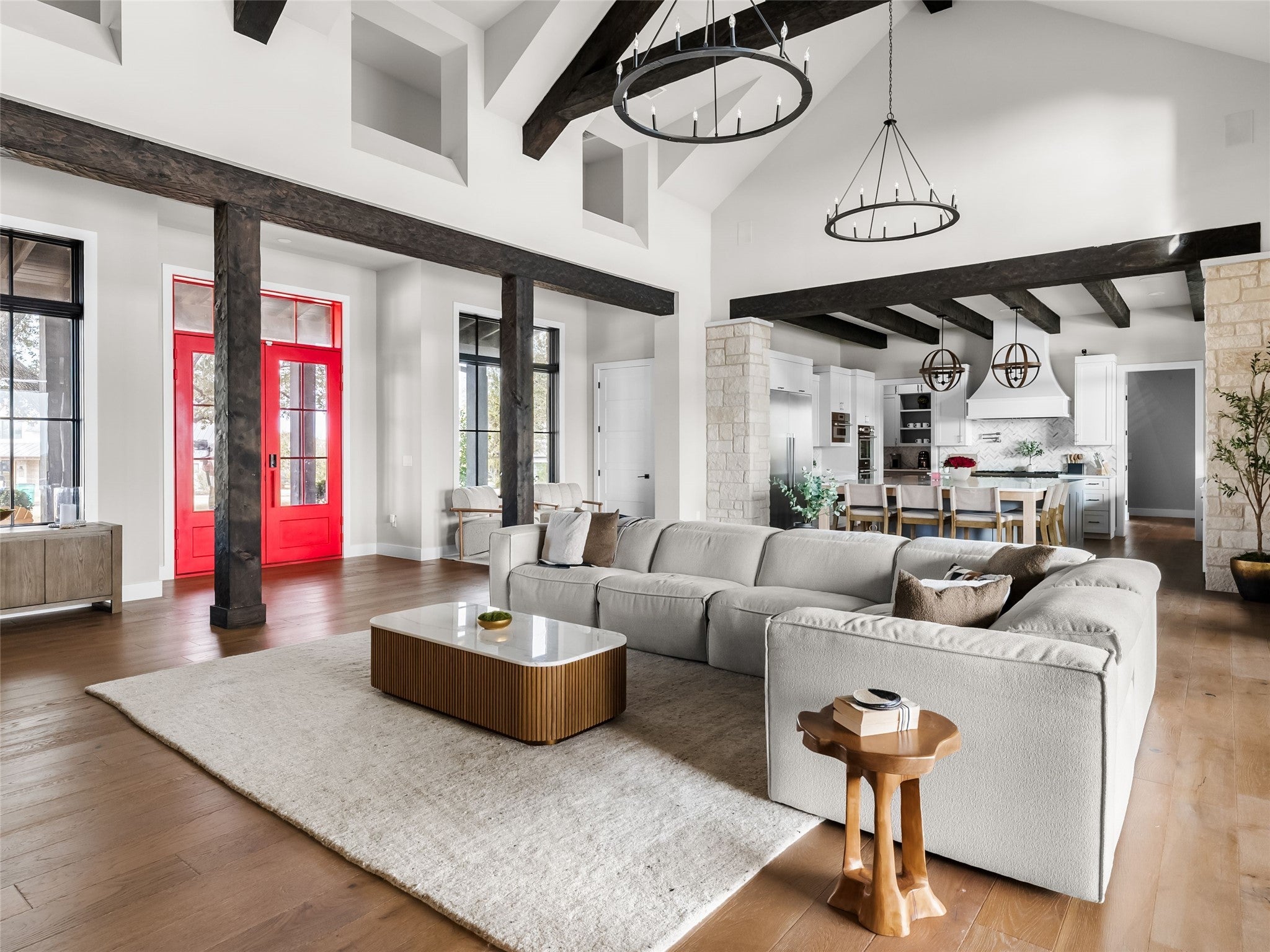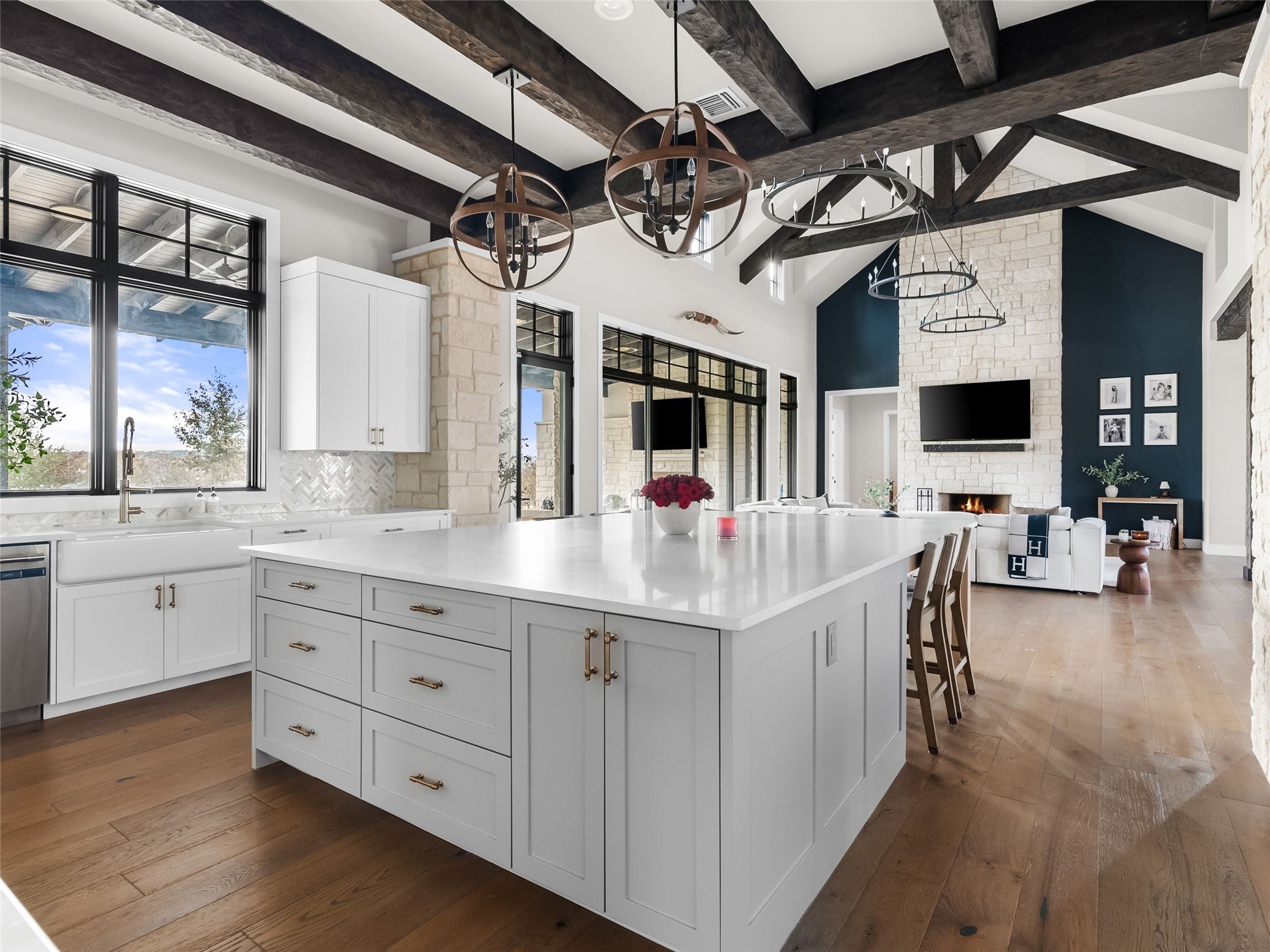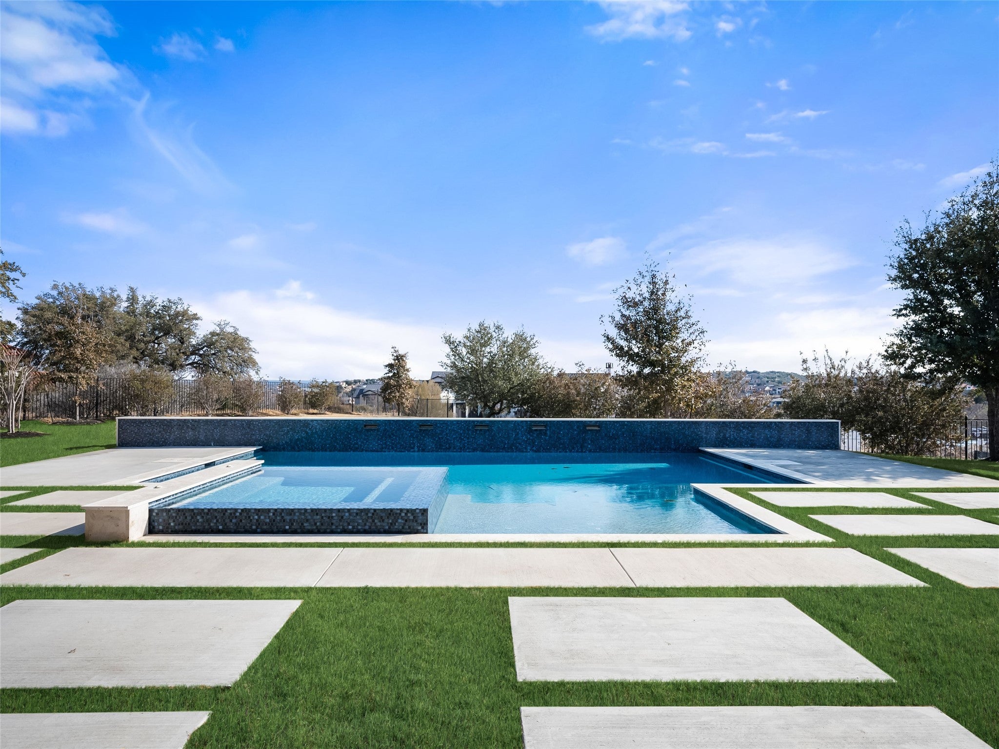 Set within The Peninsula, a gated enclave of Rough Hollow, The Bliss is a custom 2021 residence that balances refined design with effortless livability. Positioned on just under an acre in one of Lakeway’s most desirable communities, this 5-bedroom, 5,600+ square foot home was thoughtfully designed for both elevated entertaining and everyday living. Soaring ceilings with exposed wood trusses anchor the main living space, while a dramatic floor-to-ceiling stone fireplace creates a striking focal point. French oak floors, custom tile work, and expansive walls of windows fill the interiors with natural light, creating a clean and timeless aesthetic. The kitchen is both beautiful and functional, featuring Thermador stainless steel appliances, double ovens, quartz surfaces, and a generous eat-in island designed for gathering. A butler’s pantry enhances flow and makes entertaining seamless. Privately positioned on the main level, the primary suite serves as a true retreat, with large windows and a spa-inspired bath complete with a soaking tub, oversized walk-in shower, dual vanities, and spacious closets. Also on the main level are two dedicated office spaces, a guest suite, and an additional living area, offering exceptional flexibility. Upstairs, secondary bedrooms feature en-suite baths alongside an expansive additional living space. Outdoors, a Millennium pool anchors the private backyard, complemented by covered outdoor living and a fireplace, creating a peaceful setting for year-round enjoyment. Residents enjoy Rough Hollow’s resort-caliber amenities, including a marina on Lake Travis, pools, fitness facilities, trails, and parks—offering a lifestyle that is both elevated and effortless.