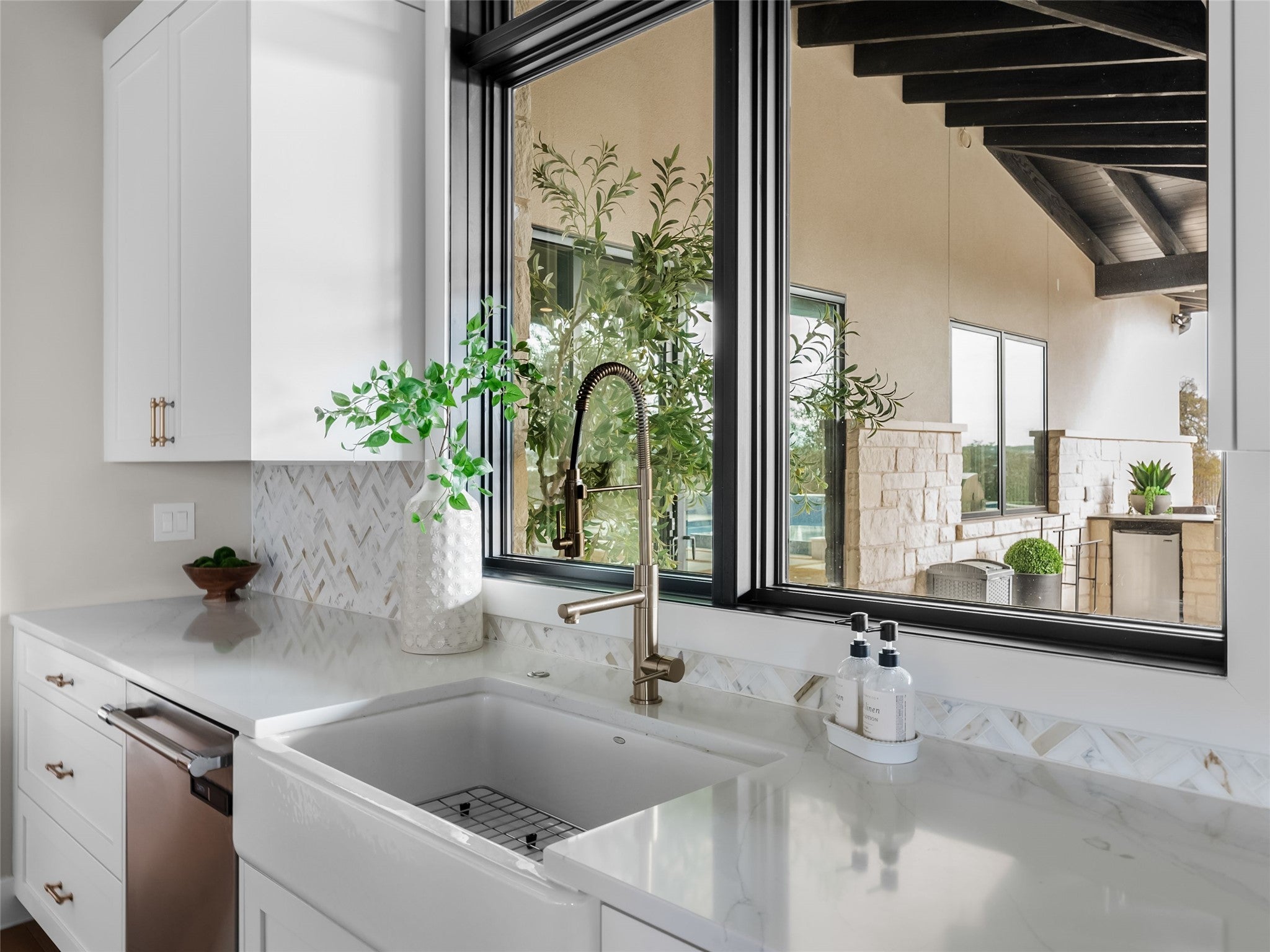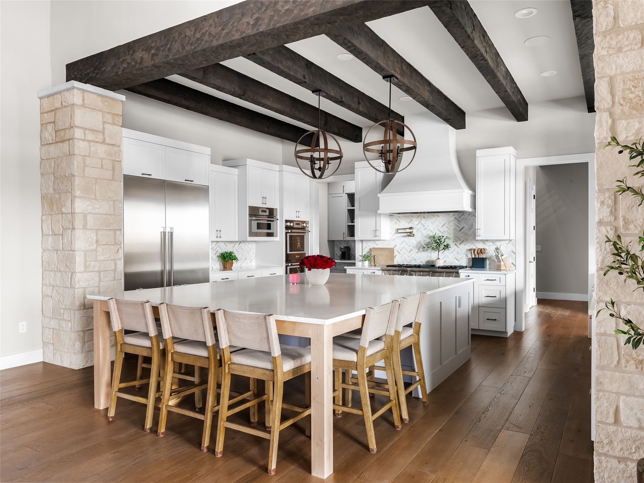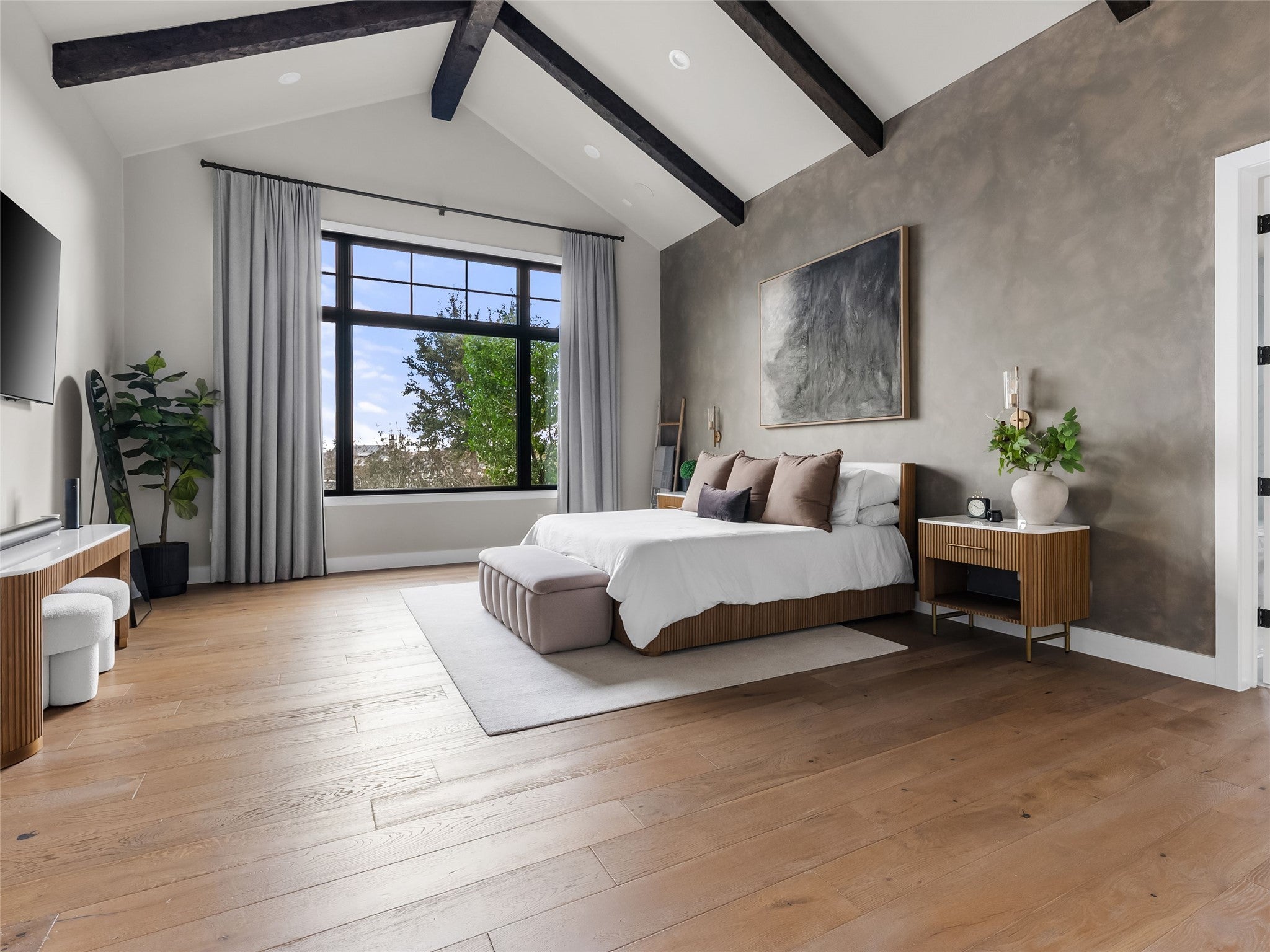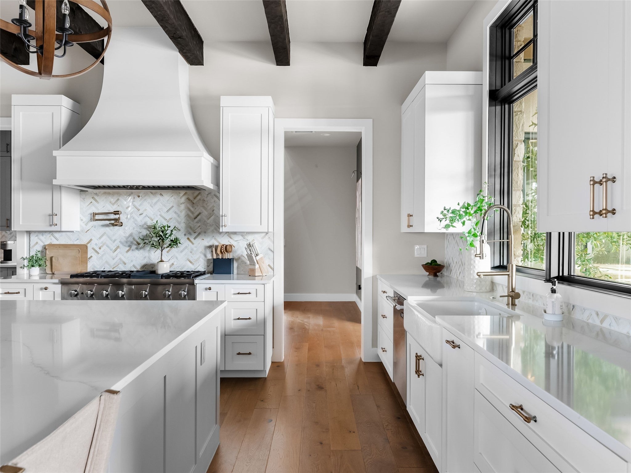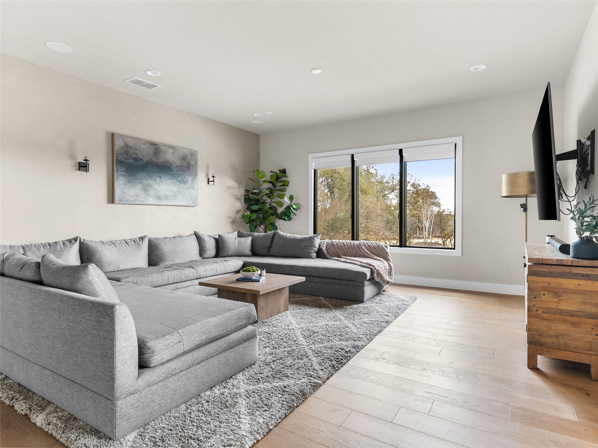 Set within The Peninsula, a gated enclave of Rough Hollow, The Bliss is a custom 2021 residence that balances refined design with effortless livability. Positioned on just under an acre in one of Lakeway’s most desirable communities, this 5-bedroom, 5,600+ square foot home was thoughtfully designed for both elevated entertaining and everyday living. Soaring ceilings with exposed wood trusses anchor the main living space, while a dramatic floor-to-ceiling stone fireplace creates a striking focal point. French oak floors, custom tile work, and expansive walls of windows fill the interiors with natural light, creating a clean and timeless aesthetic. The kitchen is both beautiful and functional, featuring Thermador stainless steel appliances, double ovens, quartz surfaces, and a generous eat-in island designed for gathering. A butler’s pantry enhances flow and makes entertaining seamless. Privately positioned on the main level, the primary suite serves as a true retreat, with large windows and a spa-inspired bath complete with a soaking tub, oversized walk-in shower, dual vanities, and spacious closets. Also on the main level are two dedicated office spaces, a guest suite, and an additional living area, offering exceptional flexibility. Upstairs, secondary bedrooms feature en-suite baths alongside an expansive additional living space. Outdoors, a Millennium pool anchors the private backyard, complemented by covered outdoor living and a fireplace, creating a peaceful setting for year-round enjoyment. Residents enjoy Rough Hollow’s resort-caliber amenities, including a marina on Lake Travis, pools, fitness facilities, trails, and parks—offering a lifestyle that is both elevated and effortless.