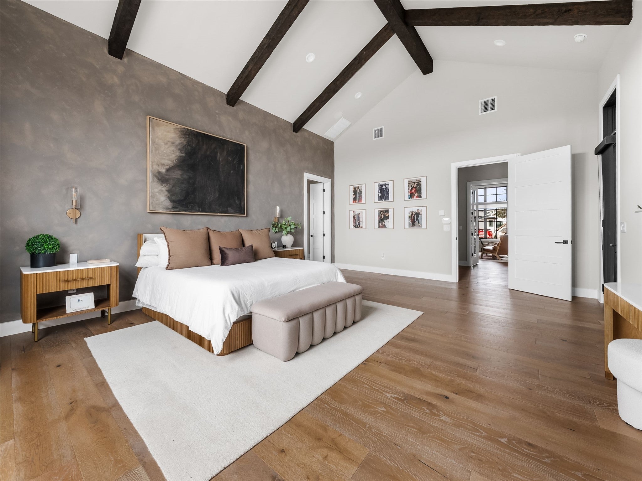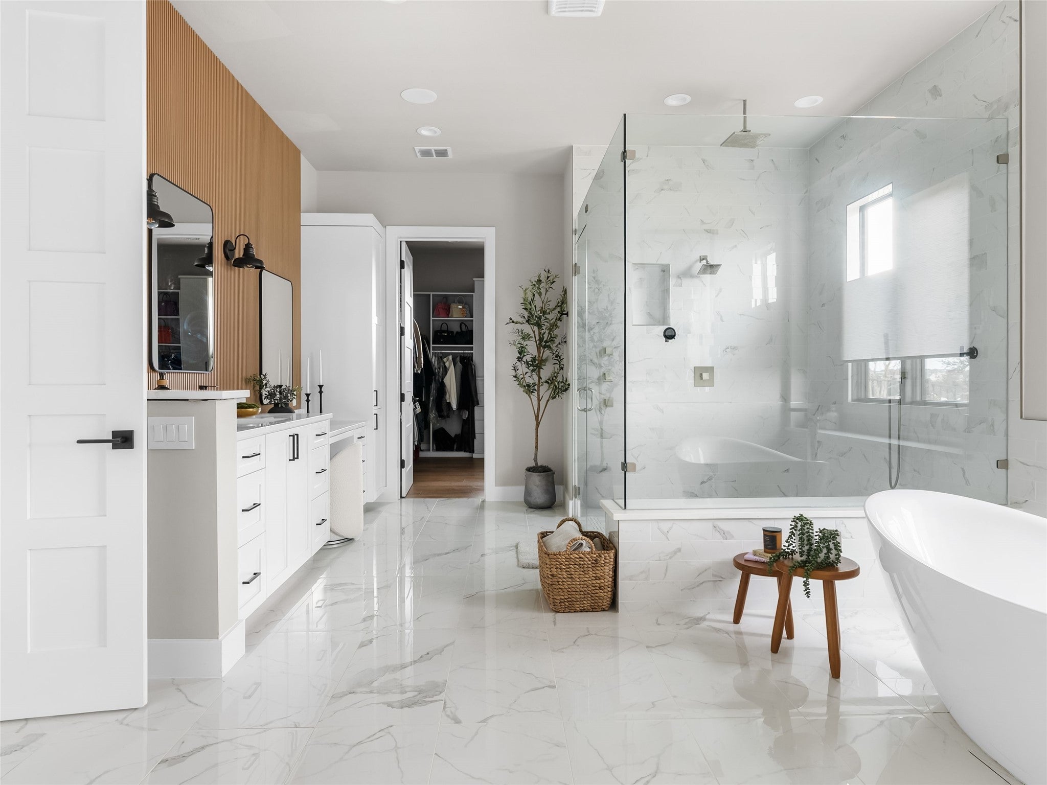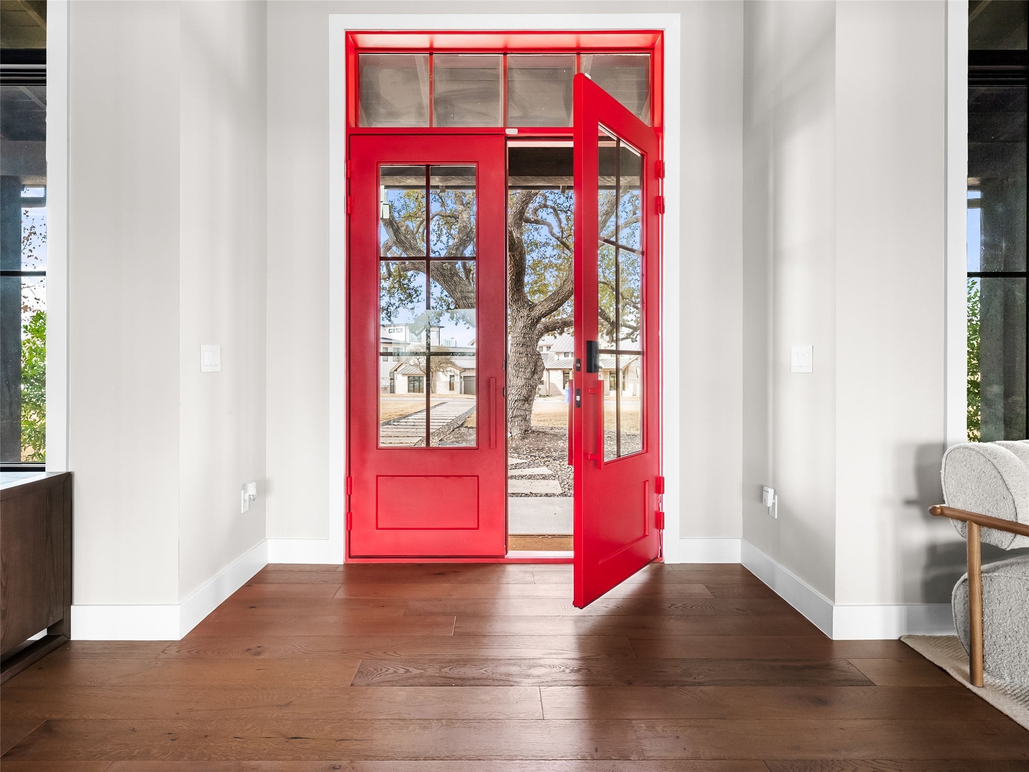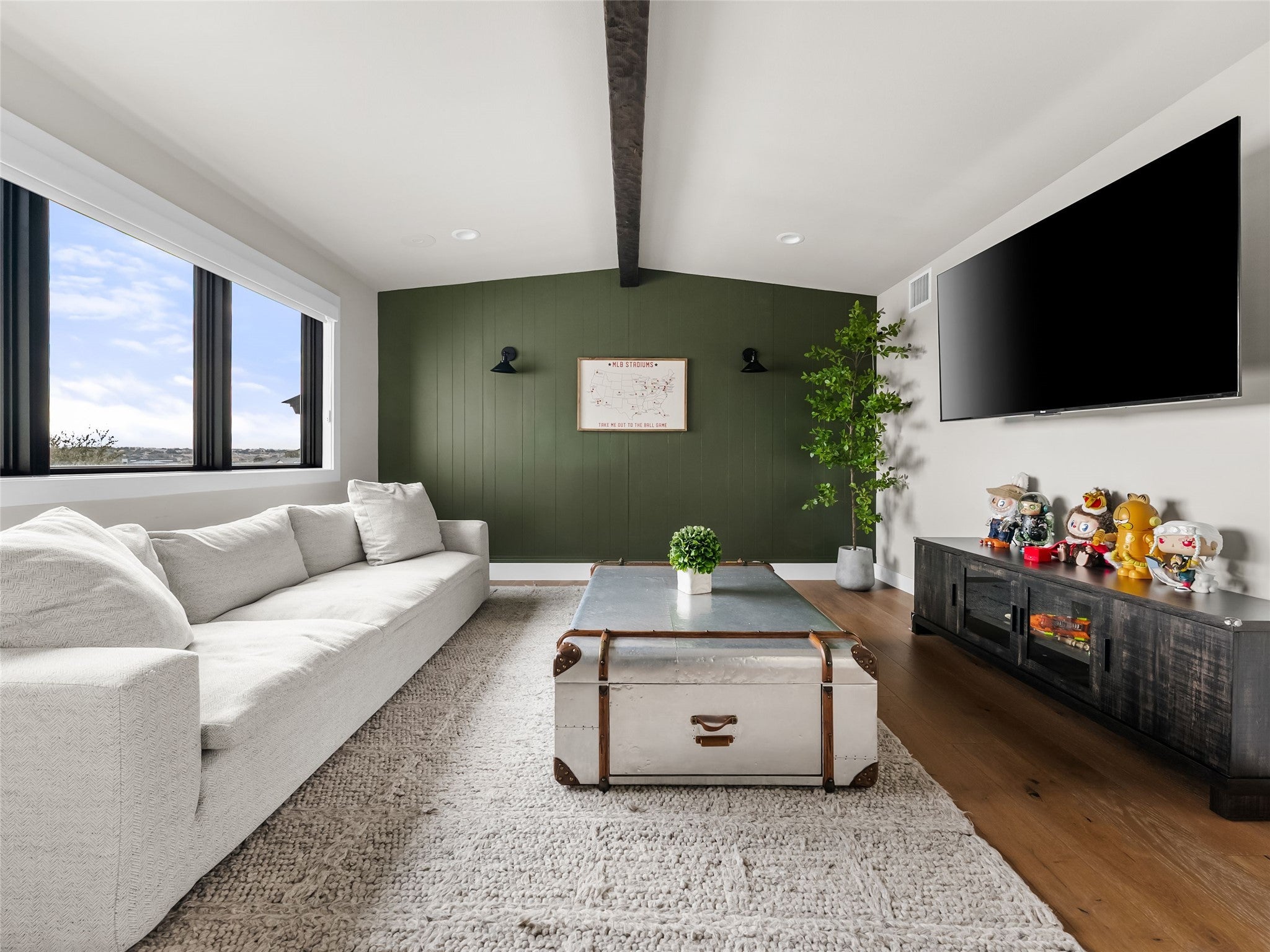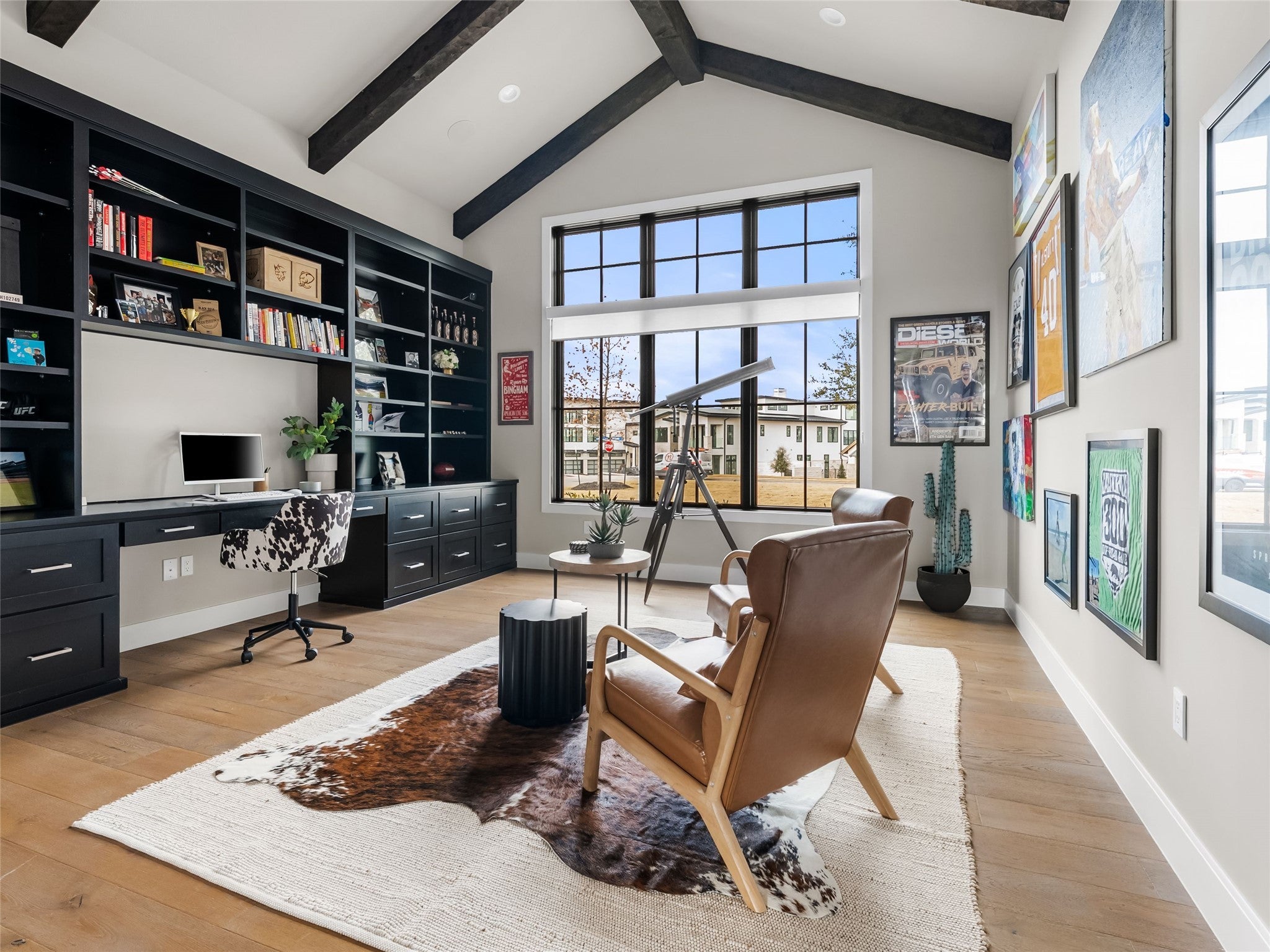 Set within The Peninsula, a gated enclave of Rough Hollow, The Bliss is a custom 2021 residence that balances refined design with effortless livability. Positioned on just under an acre in one of Lakeway’s most desirable communities, this 5-bedroom, 5,600+ square foot home was thoughtfully designed for both elevated entertaining and everyday living. Soaring ceilings with exposed wood trusses anchor the main living space, while a dramatic floor-to-ceiling stone fireplace creates a striking focal point. French oak floors, custom tile work, and expansive walls of windows fill the interiors with natural light, creating a clean and timeless aesthetic. The kitchen is both beautiful and functional, featuring Thermador stainless steel appliances, double ovens, quartz surfaces, and a generous eat-in island designed for gathering. A butler’s pantry enhances flow and makes entertaining seamless. Privately positioned on the main level, the primary suite serves as a true retreat, with large windows and a spa-inspired bath complete with a soaking tub, oversized walk-in shower, dual vanities, and spacious closets. Also on the main level are two dedicated office spaces, a guest suite, and an additional living area, offering exceptional flexibility. Upstairs, secondary bedrooms feature en-suite baths alongside an expansive additional living space. Outdoors, a Millennium pool anchors the private backyard, complemented by covered outdoor living and a fireplace, creating a peaceful setting for year-round enjoyment. Residents enjoy Rough Hollow’s resort-caliber amenities, including a marina on Lake Travis, pools, fitness facilities, trails, and parks—offering a lifestyle that is both elevated and effortless.