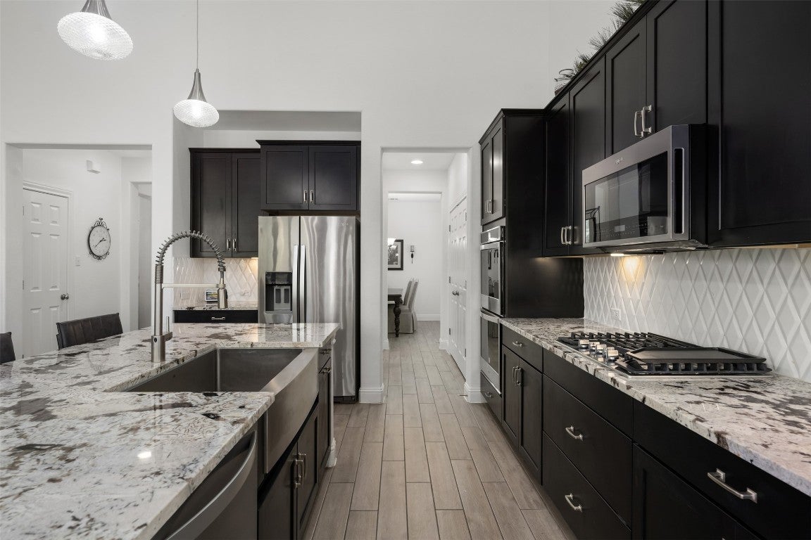 This Ashton Woods home is chalked full of upgrades, and includes fresh paint on the interior. Vaulted ceiling at kitchen and family room, with 42" cabinets, upgraded granite counters, backsplash, and built-in appliances to include 2 ovens. Wood-tile flooring on first floor. Home includes a study and formal dining. Master bedroom with bay window, master bath with garden tub and separate shower, and huge walk-in closet. Upstairs you'll find a large game room, 3 bedrooms, 2 baths (1 is en suite).