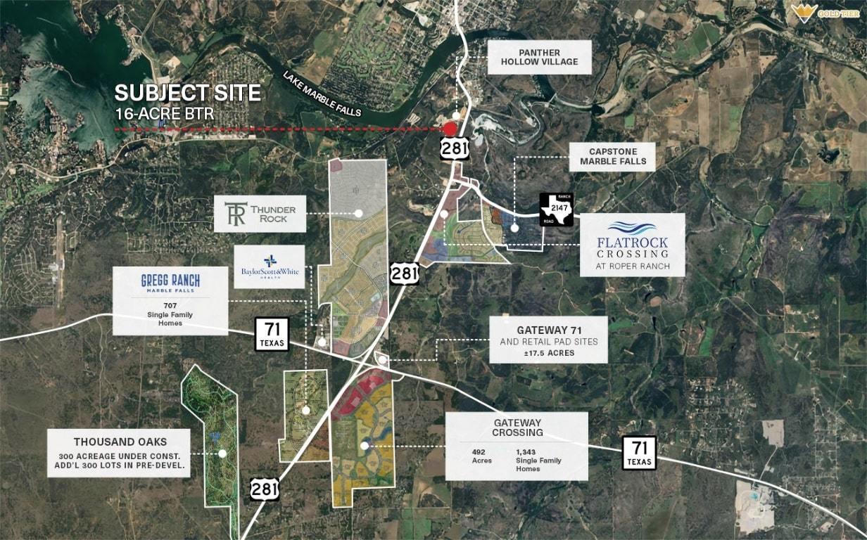 Gold Tier Real Estate presents a shovel-ready, fully entitled build-to-rent (BTR) development opportunity in the heart of Marble Falls, TX. Spanning 16 acres and zoned for 176 units, this site offers a rare chance to develop in one of Central Texas’ most dynamic submarkets, adjacent to the thriving Panther Hollow corridor. The adjacent 18 acre multi-family (MF) site is also available, allowing for a total of 500 units of any residential type between the two sites. Offered at $2,980,000 ($16,932/unit) plus pro rata site infrastructure costs, the property includes vested LUEs, a recorded plat, and a development agreement with the City of Marble Falls. Public improvements are underway, with roads, detention, and utilities scheduled for delivery by the seller. The buyer will participate in cost sharing for these improvements. Strategically positioned off US Highway 281 and adjacent to major growth nodes like Flatrock Crossing, Roper Ranch, and Thunder Rock, Roper West is surrounded by planned or under-construction housing units and significant commercial expansion, including the upcoming Shops at Flatrock Crossing retail destination (Academy, TJ Maxx, Michaels, Boot Barn, Bath & Body Works). **Broker does not warrant the accuracy of any information. Buyers are responsible for independent analysis and research on the property.**