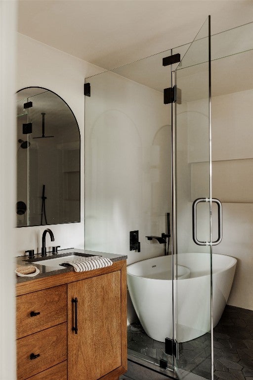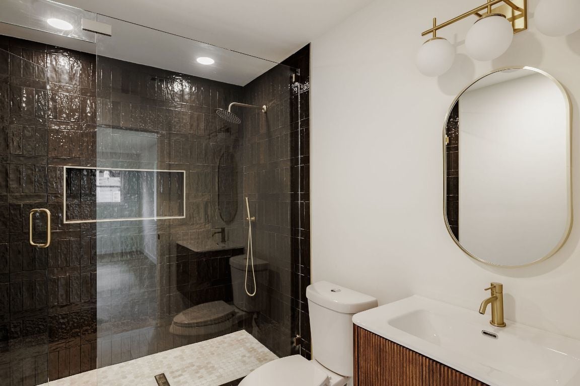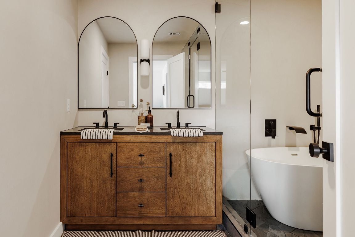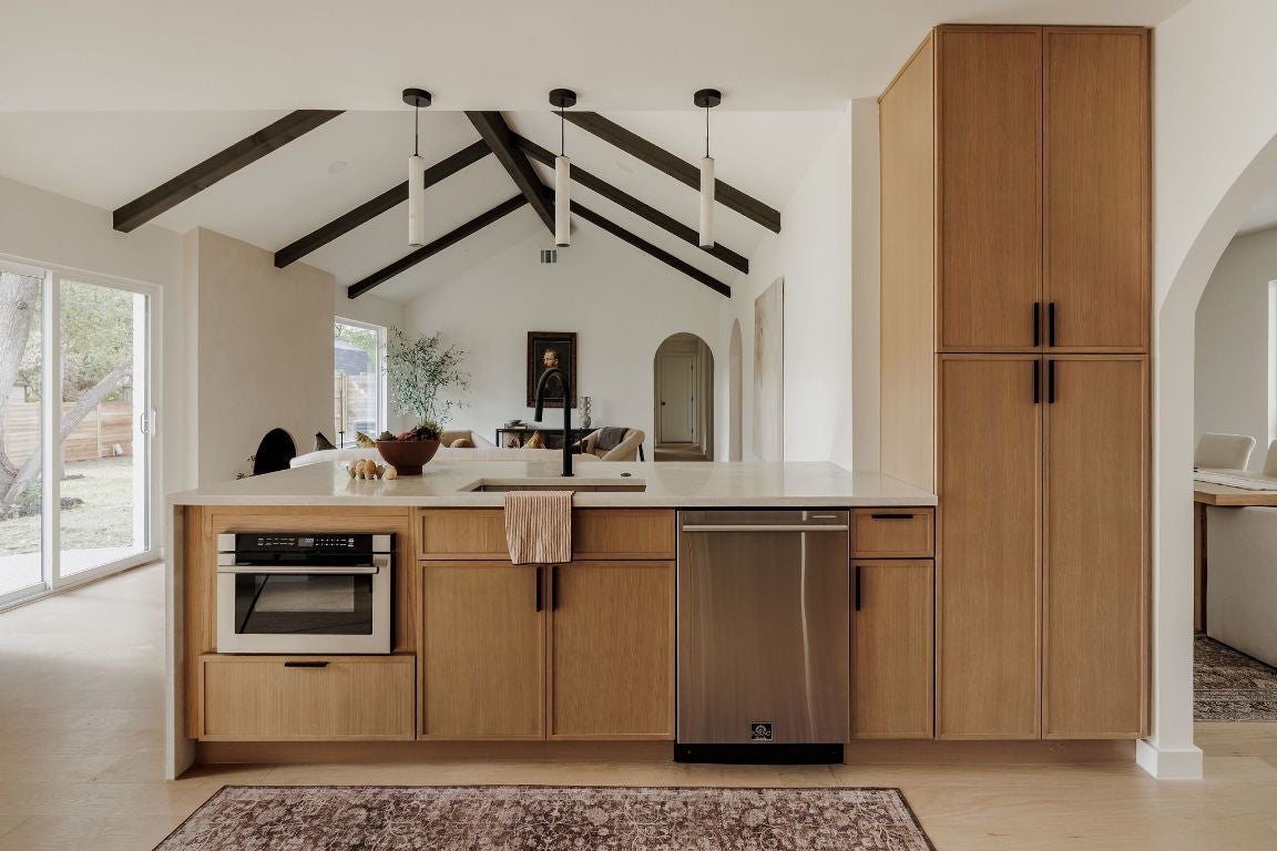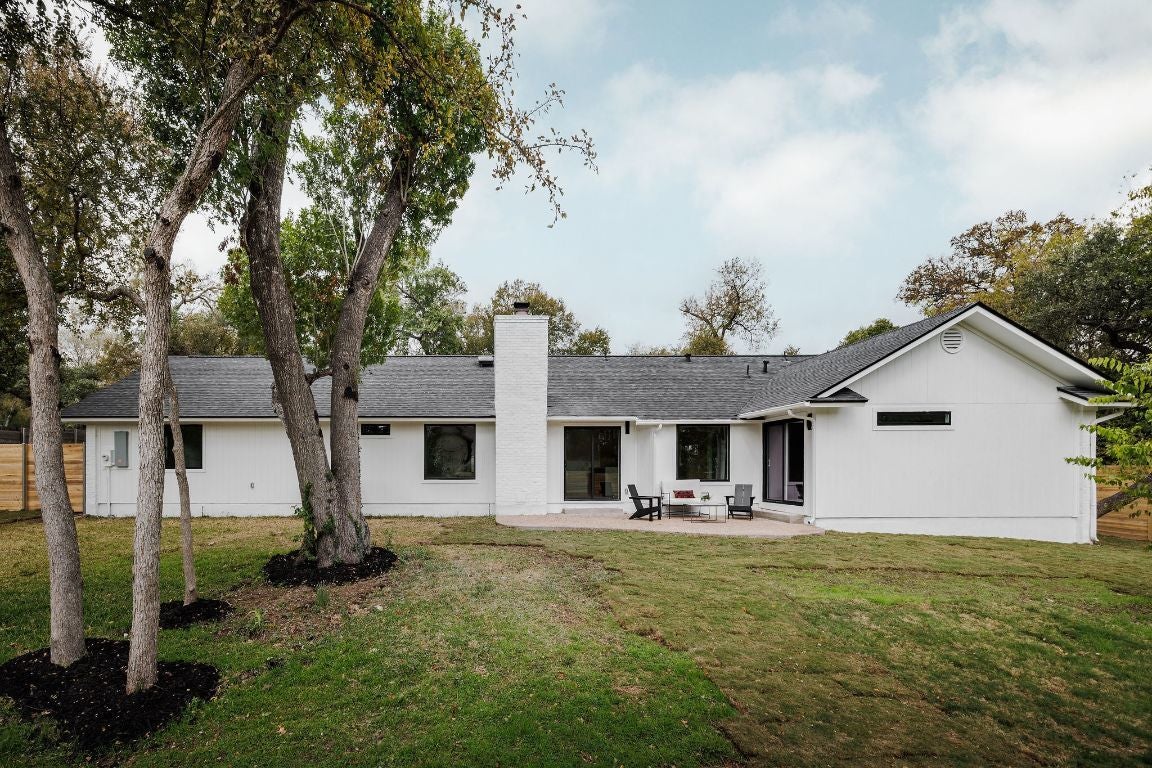 Breathtaking Mid Century Restoration in the highly coveted Castlewood Forest neighborhood! :: Stunning sleek modern exterior design w/ beautiful tree setting. :: A Warm, earthy kitchen design features new oak cabinets, Taj Mahal quartz countertops w/ waterfall backsplash, an oversized breakfast bar and FORNO appliance suite with 36" Stove. :: Living room boasts a vaulted ceiling w/ original wood beams plus stunning stucco arched fireplace. :: 2 Primary Bedrooms w/ a Private Spacious Main Bedroom plus bathroom ensuite featuring dual vanity, Soak Tub and Spa-like walk-in Shower :: Engineered hardwood floors flow throughout this spacious and open floor plan w/ an abundance of natural light. :: Entry foyer plus adjoining dining room and/or second living area features built-in oak cabinets, 2 pantries, white oak floating shelves & a wine refrigerator. :: System upgrades include new HVAC system, full electrical upgrade, black/white Elevate Windows, water heater, 30/yr architectural roof, irrigation, sod and wood fence. :: Close to beautiful parks including the Stephenson Nature Preserve, Armadillo Den, HEB and highly rated Cowan Elementary School.