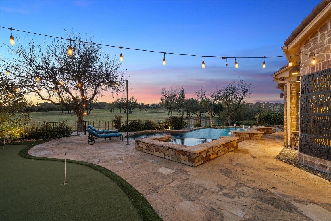 **Welcome to 4008 Sugarloaf Dr – A Luxurious Retreat in The Heights of Falconhead** Nestled in the coveted gated section of Falconhead, this spectacular home seamlessly blends luxury, functionality, and breathtaking views. Spanning 5,148 square feet, this stunning residence backs to the prestigious Falconhead golf course, offering manicured views and a one-of-a-kind outdoor living experience. Designed with entertainment in mind, the backyard oasis features a multi-level pool, spa, outdoor fireplace, grilling area, and a putting green—perfect for hosting family and friends or simply enjoying peaceful evenings in a serene setting. Inside, this home boasts 5 spacious bedrooms, including 2 on the main floor, and 4 beautifully appointed bathrooms. The primary ensuite retreat offers a rainhead shower with frameless glass, an oversized soaking tub, and elegant finishes, creating the perfect spa-like experience. The chef's kitchen is a culinary masterpiece, equipped with top-of-the-line stainless steel appliances, a gas stove, double ovens, and a built-in fridge. Whether enjoying casual meals at the breakfast bar or in the charming breakfast nook, the gorgeous views enhance every moment. The open design allows for effortless entertaining and easy interaction with guests. The main floor also includes a dedicated study with a private exterior entrance—ideal for a home office and guest suite offering added privacy. Upstairs, you'll find a spacious game room with built-in desk and media room with wet bar, providing even more versatile space for relaxation and entertainment. Additional practical features of the home include a dedicated laundry room with ample storage and a sink, as well as an attached three-car garage, ensuring convenience and comfort. 4008 Sugarloaf Dr offers an exceptional lifestyle, combining luxury, style, and an unbeatable location. Don’t miss the opportunity to make this one-of-a-kind property your forever home.