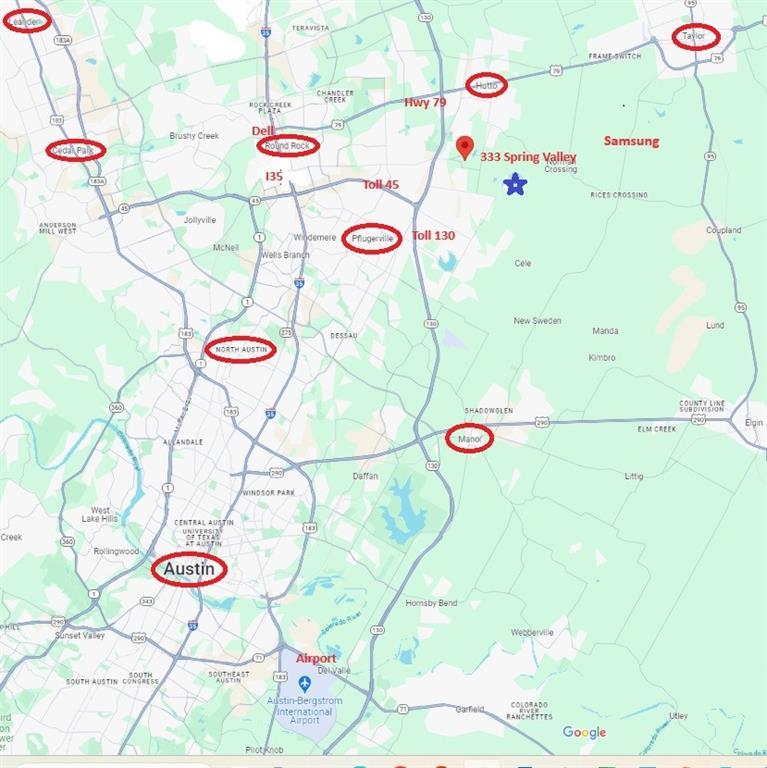 FOR SALE: 5.72 acres off CR 138 Lane, near the new Southeast Loop around Hutto. This property could be subdivided into two lots. Buyers can build another home on the 2nd tract. A guest home / detached garage / workshop are also allowed. For animal lovers, two non-household ANIMALS are also permitted. There is a home on the property that needs alot of work, or a tear down. 333 Spring Valley is a short distance from major highways (Toll 130, Southeastern Loop around Hutto, Hwy 79, I35). ~Ten minutes to HEB Plus, Costco, Stonehill Shopping Center, Restaurants, Entertainment. ~Thirty minutes to Samsung, Tesla, Austin Airport, Dell, Apple, Domain. This property is outside of the city limits (NO CITY TAXES), in Hutto's ETJ and no current zoning. So many possibilities with this truly unique property! Information deemed reliable, not guaranteed. Buyer / Buyer Agent should verify all information. Priced $126k below tax appraisal. Great investment!