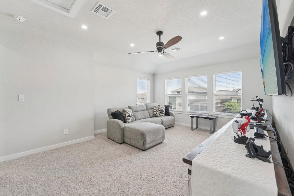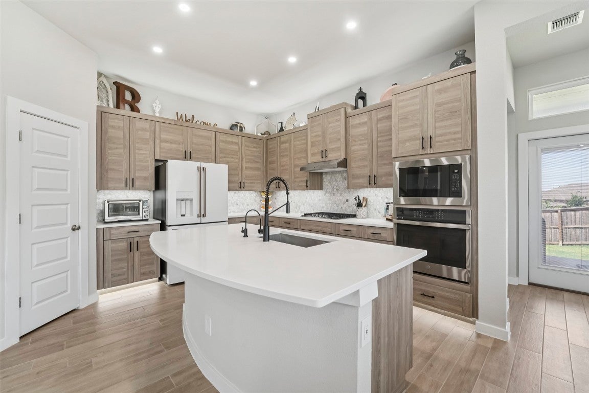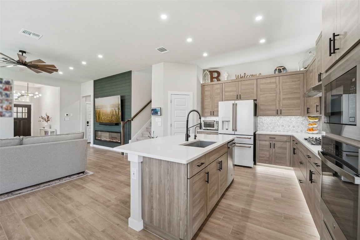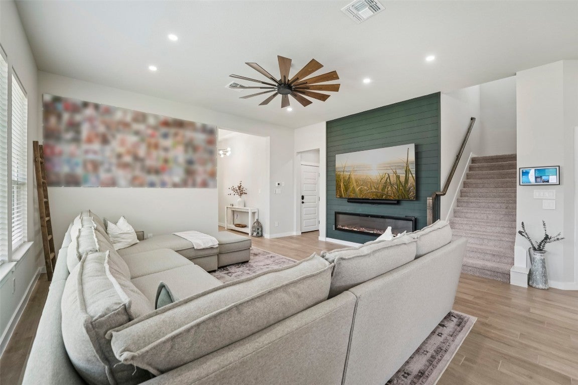 Modern comfort meets everyday functionality in this 2022-built Bryson beauty. Located on a spacious corner lot, this 4-bed, 2.5-bath home features an open layout with high ceilings, upgraded lighting, and a cozy electric fireplace in the living room. The kitchen is built to impress with aesthetic cabinets, a large island, gas cooktop, smart oven, and stylish finishes throughout. Upstairs, you'll find flexible living space, generously sized bedrooms with walk-in closets, and a private primary suite with a spa-like walk-in shower. Enjoy the perks of a three-car garage, fenced backyard, and newly added electrical features throughout. Situated in Leander’s sought-after Bryson community, with neighborhood events, trails, and more just outside your door, this home is ready for its next owner.