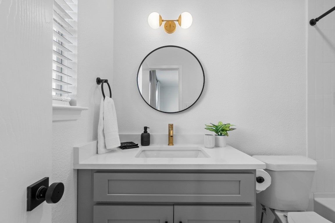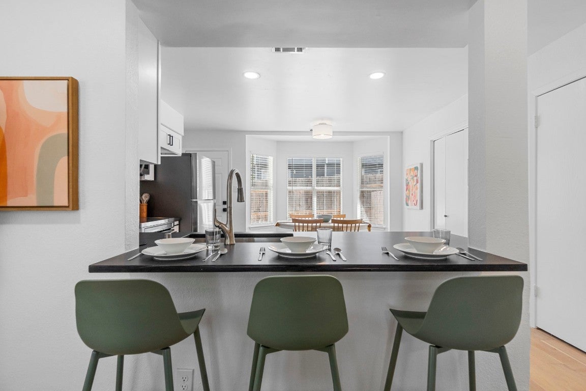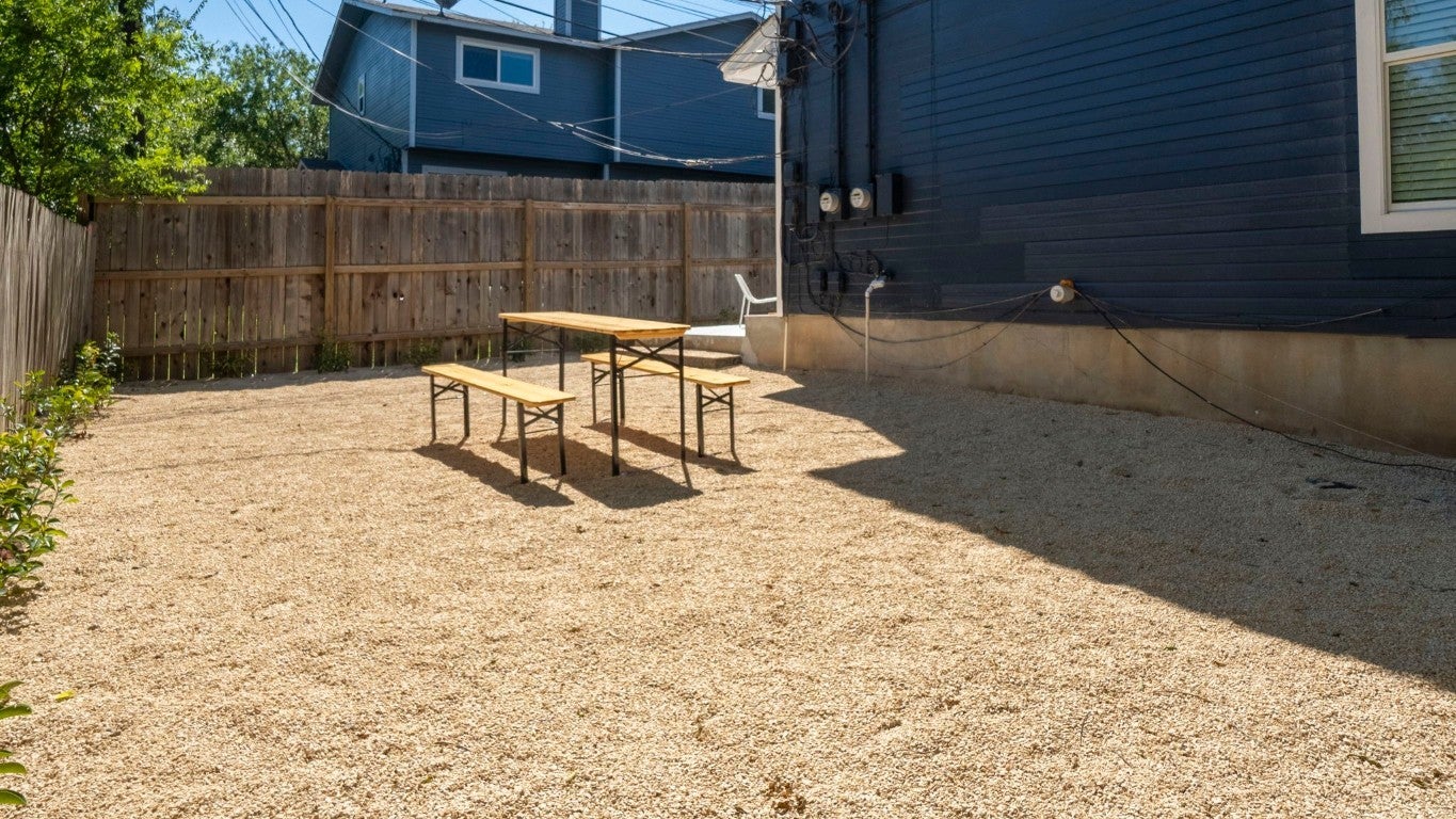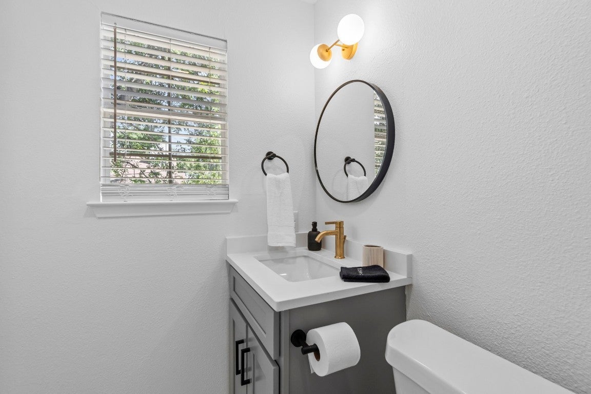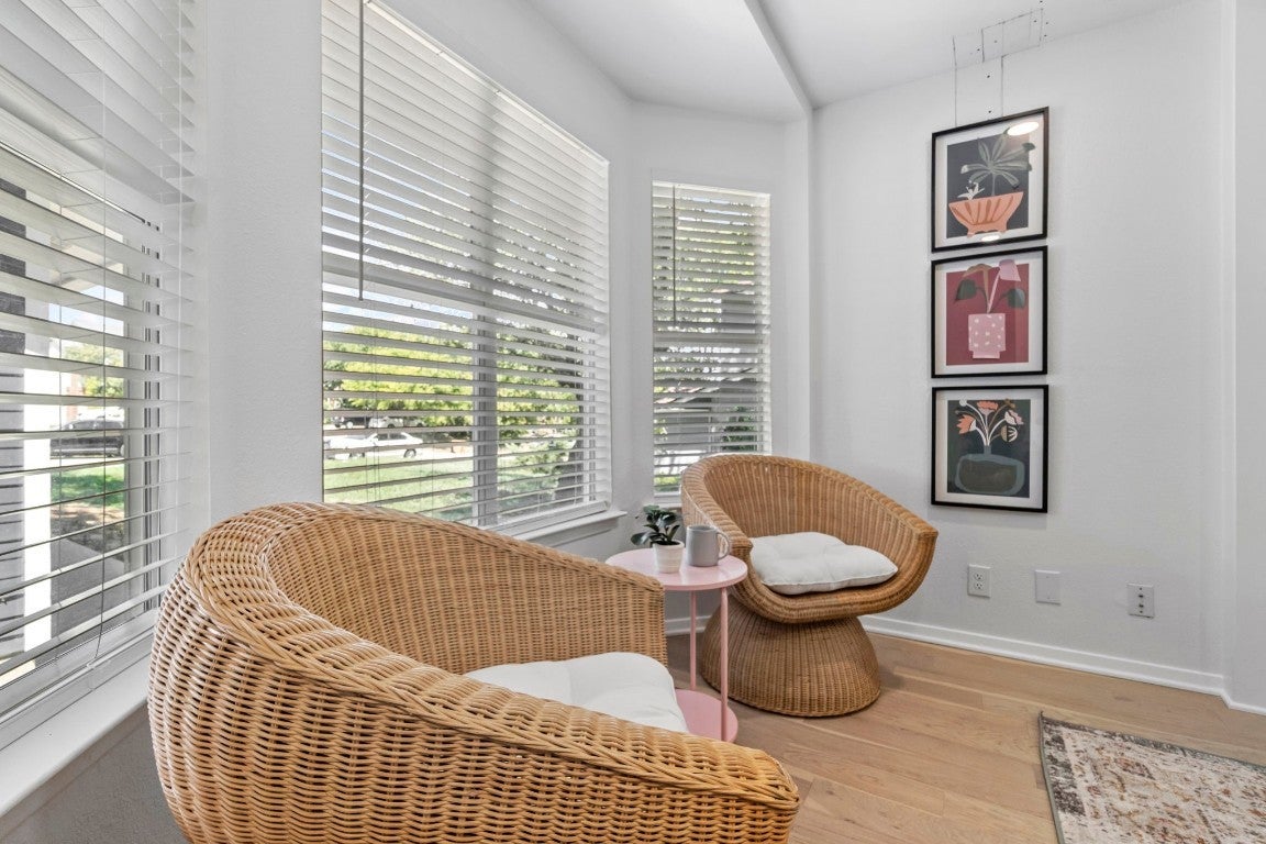Fully Furnished Monthly Rental Available All Utilities and Lawn Maintenance for $300/Month Additional Light filled completely updated home with natural white oak hardwood floors downstairs throughout the living and kitchen area. Sit back in the thoughtfully designed living area and watch the 50" TV. Enjoy your complimentary Keurig coffee in the well appointed kitchen which features quartz countertops and stainless steel appliances accented by white shaker style cabinets along with all kitchen essentials. Half bath conveniently located downstairs along with full size washer/dryer. Head upstairs where you will find two comfortably curated bedrooms both including ensuite full bathrooms with bath tubs, large closets, and blackout curtains. Bedroom 1 includes a memory foam king bed and 43" TV while bedroom 2 includes a memory foam queen bed and desk perfect for your workstation on the go. Both bathrooms have been updated with clean lines created with white subway tile surrounds and opal hexagon floors accented by grey shaker style cabinets with white quartz countertops. The matte black and gold fixtures finish out the bathrooms perfectly. Outside you will find a photo worthy patio with custom tile work perfect for enjoying your morning coffee or having a nightcap with friends. The yard has been completely xeriscaped and includes a double hammock, cornhole, and bar height picnic table.