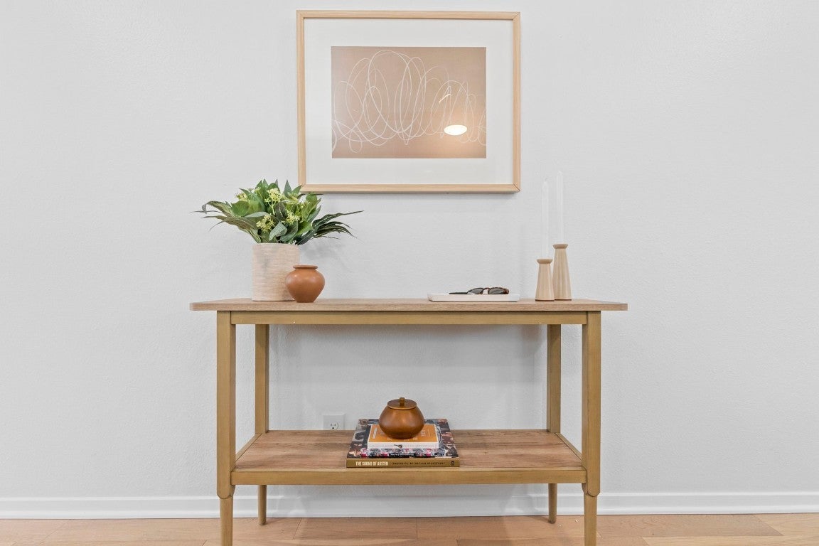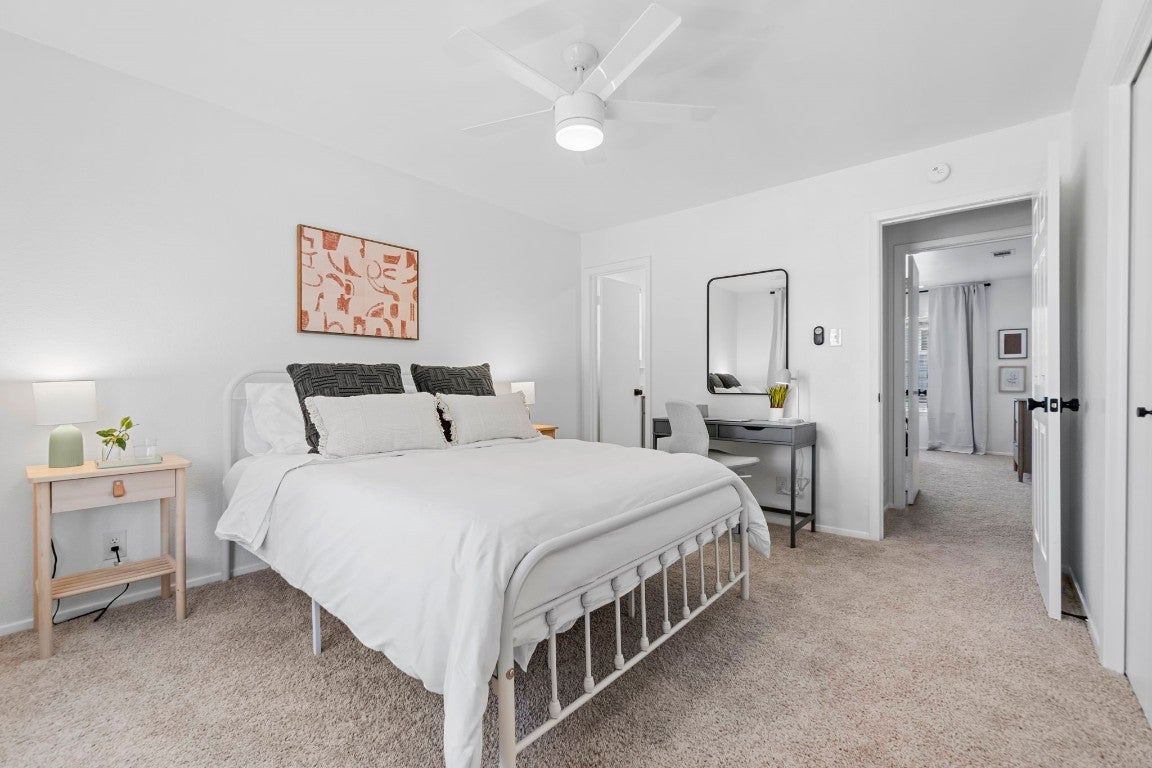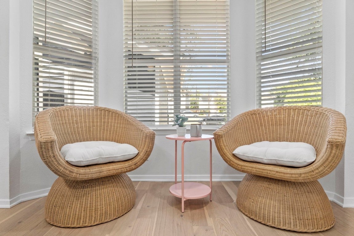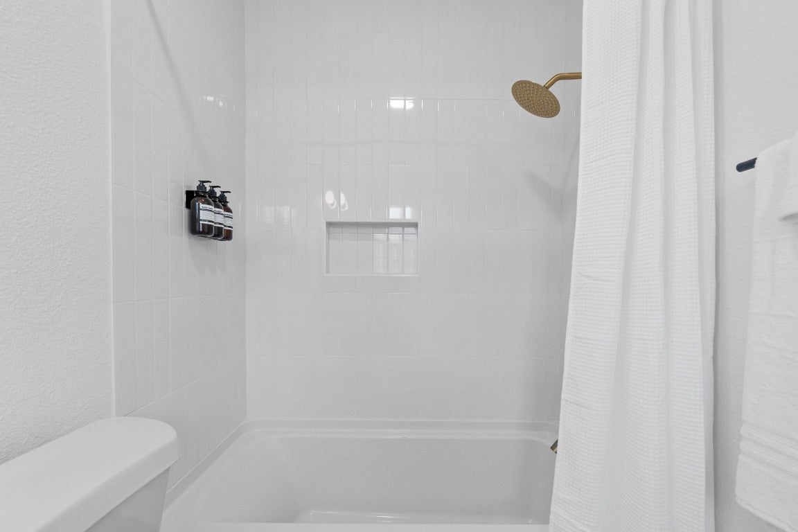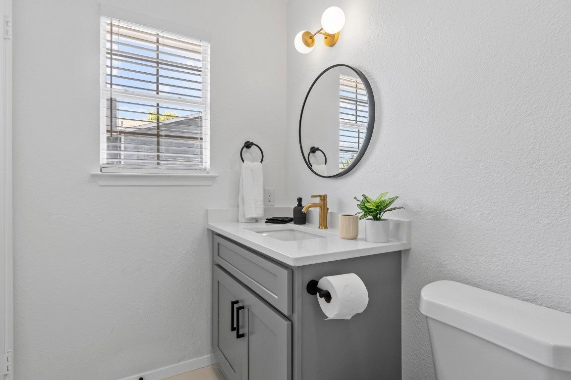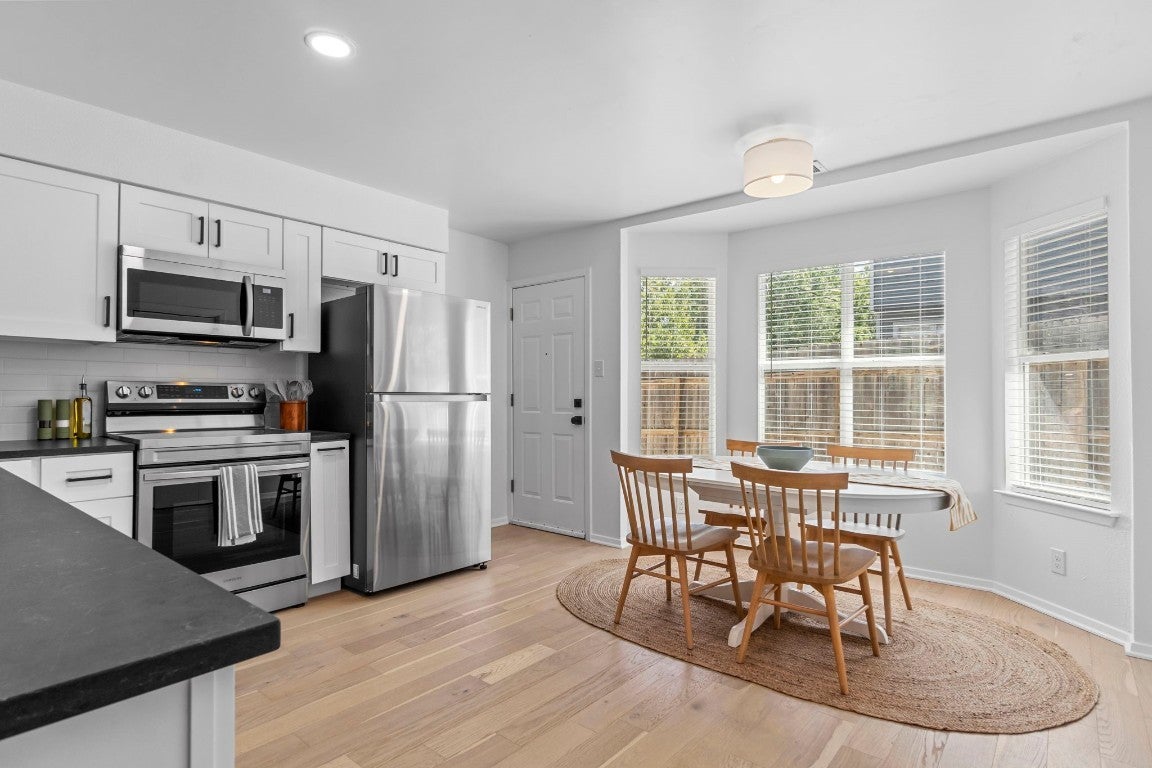 Fully Furnished Monthly Rental Available All Utilities and Lawn Maintenance for $300/Month Additional Light filled completely updated home with natural white oak hardwood floors downstairs throughout the living and kitchen area. Sit back in the thoughtfully designed living area and watch the 50" TV. Enjoy your complimentary Keurig coffee in the well appointed kitchen which features quartz countertops and stainless steel appliances accented by white shaker style cabinets along with all kitchen essentials. Half bath conveniently located downstairs along with full size washer/dryer. Head upstairs where you will find two comfortably curated bedrooms both including ensuite full bathrooms with bath tubs, large closets, and blackout curtains. Bedroom 1 includes a memory foam king bed and 43" TV while bedroom 2 includes a memory foam queen bed and desk perfect for your workstation on the go. Both bathrooms have been updated with clean lines created with white subway tile surrounds and opal hexagon floors accented by grey shaker style cabinets with white quartz countertops. The matte black and gold fixtures finish out the bathrooms perfectly. Outside you will find a photo worthy patio with custom tile work perfect for enjoying your morning coffee or having a nightcap with friends. The yard has been completely xeriscaped and includes a double hammock, cornhole, and bar height picnic table.