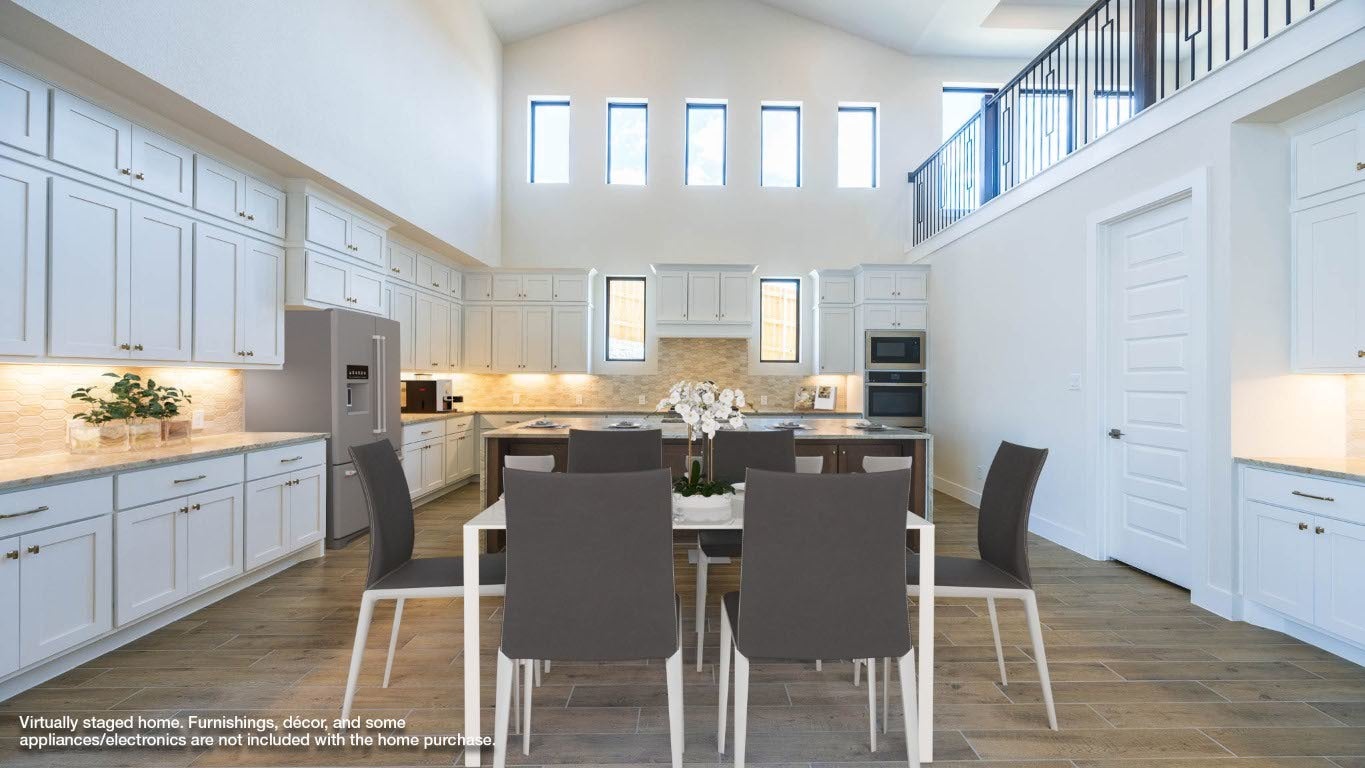 READY FOR MOVE-IN! The grand entryway unfolds to reveal a sweeping curved staircase. French doors open into a home office, while across the hall, the formal dining room awaits. Step into the two-story family room, which offers a warming wood mantel fireplace and a wall of windows. The morning area seamlessly connects the living space to the kitchen, which boasts an island with built-in seating, ample counterspace, 5-burner gas cooktop, a walk-in pantry, and a butler's pantry, with easy access to the utility room. The primary suite features a wall of windows and French doors that open into the primary bathroom. This retreat includes dual vanities, a freestanding tub, a separate glass-enclosed shower, and two walk-in closets. A private guest suite off the morning area provides comfort. Upstairs, discover a game room with expansive windows and an adjoining media room for entertainment. Secondary bedrooms with walk-in closets and a Hollywood bathroom, along with an additional guest suite, complete the second floor. Step outside to the two-story extended covered backyard patio. A mudroom is just off the three-car garage.