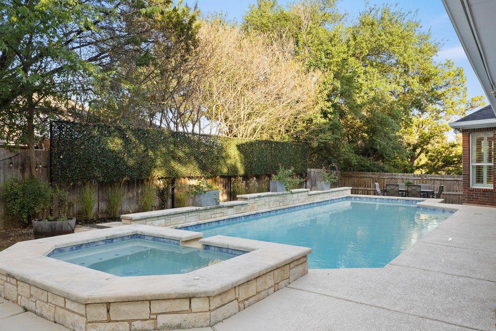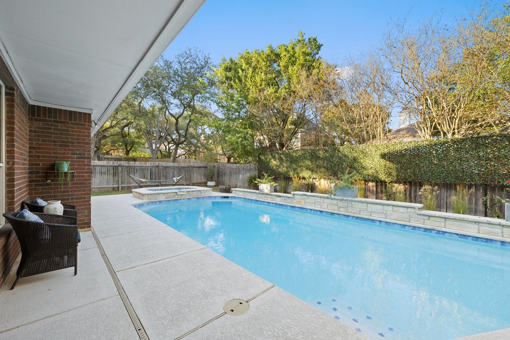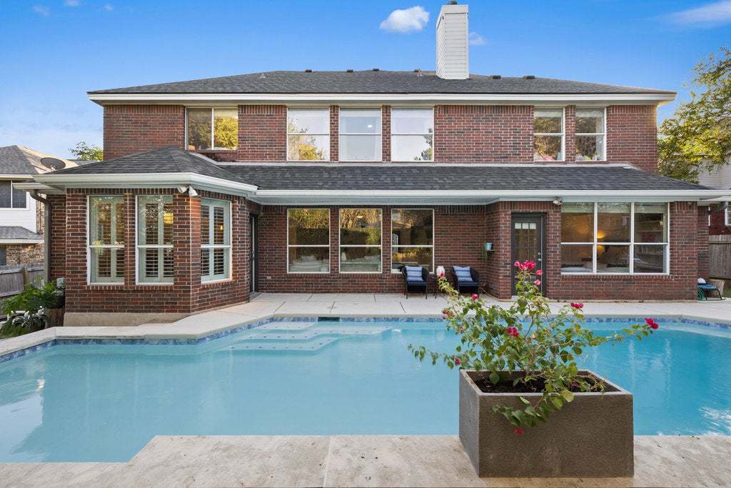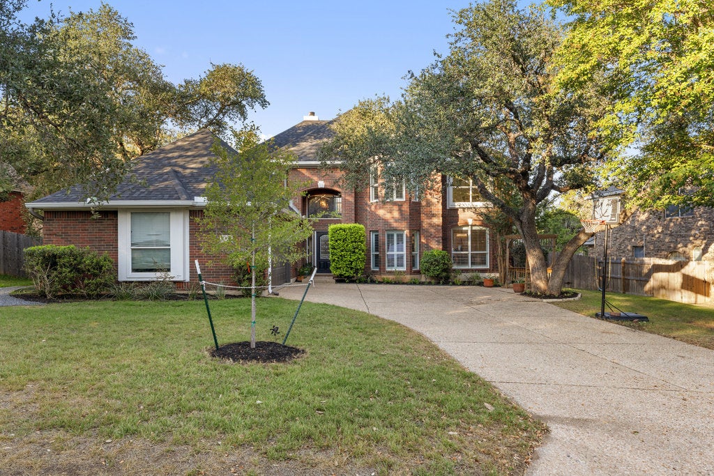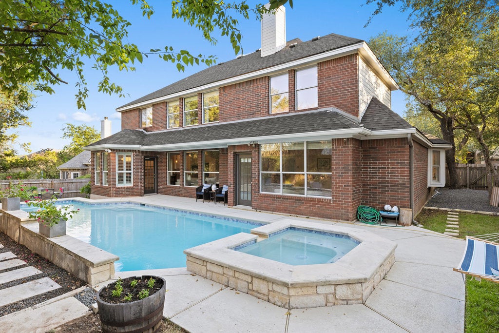 In the coveted Park at Spicewood Springs, this residence immediately sets itself apart. Manicured landscaping and a welcoming front entry hint at the refinement within. Inside, the home opens to formal gathering spaces that highlight craftsmanship and detail. Wood-shuttered windows filter natural light, while a designer chandelier adds warmth and sophistication to the dining room. The layout flows seamlessly into the updated kitchen, thoughtfully designed for those who love to cook and entertain. Granite countertops, a center island with seating, and a stylish backsplash define the space, while a breakfast nook framed by bay windows captures views of the backyard and pool. The main living room is filled with natural light, anchored by custom built-ins and a cozy fireplace, creating a welcoming rhythm that ties the main level together. Privately positioned at the back of the home, the primary suite offers a quiet haven. Spacious enough for a sitting area and with direct access to the backyard, it’s the perfect spot for morning coffee or evening unwinding. The updated ensuite bath feels like a retreat, featuring a soaking tub, walk-in shower with rainfall head, oversized vanities, walls of mirrors, and finishes that were chosen with care. Upstairs, 4 more bedrooms and 3 full bathrooms give everyone space to spread out. The game room adds a casual hangout spot, homework hub or movie night destination. Every bedroom has generous closets and natural light, and there’s even a hidden playroom. Out back, the sense of privacy is undeniable! The recently refinished patio is ready for dinners outdoors, while the newly resurfaced pool and spa shimmer against a backdrop of mature foliage.The large front yard offers another area to play and ride bikes, while a new roof and fresh xeriscape perfect the exterior. The best part? The location-blocks from the park and greenbelt, minutes from HEB, and zoned to Laurel Mountain Elementary, Canyon Vista Middle, and Westwood High.