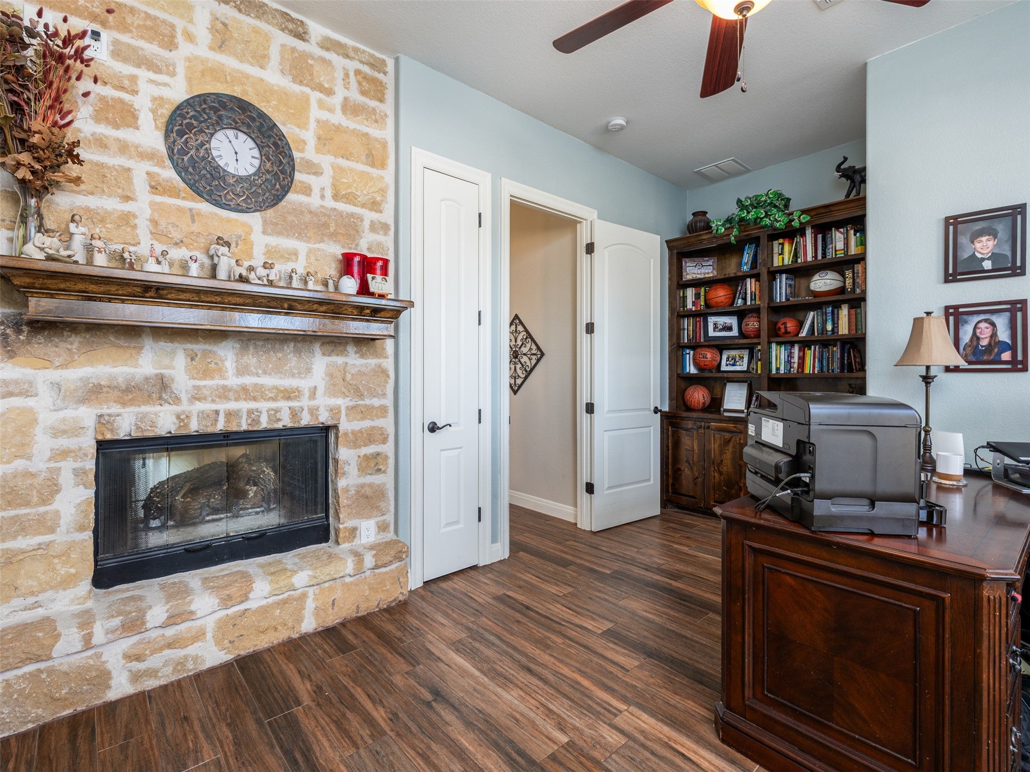 NEW IMPROVED PRICE! Beautiful Hill Country Residence is Driftwood's La Ventana gated community. This spacious home features the primary bedroom, along with two secondary bedrooms, downstairs and a dedicated office with two-sided fireplace on the other side of the living room. Eat-in kitchen opens to the living room and a formal dining room that is optimal for entertaining. Upstairs features a second living space/game room and bedroom with full en suite bathroom. Elevated sliding doors open from the living room out to an expansive covered patio with an outdoor kitchen and fireplace, saltwater pool and spa and firepit. Outdoor shed provides extra storage for lawn, pool and outdoor equipment. Home uses a 40,000 gallon water collection system as it's main water source and the community well system can be used instead if so desired. Additional features include Energy-star windows, tankless water heater, propane heating and cooking, heated tile floors in some rooms, recent carpet and pot filler at cooktop.