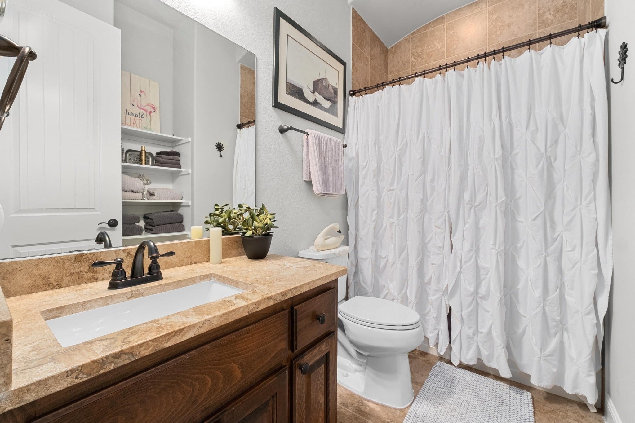 Nestled on a sprawling 1+ acre corner lot, this stunning 4-bedroom, 4 full bath, 1 half bath estate offers 3,736 square feet of thoughtfully designed living space and exceptional indoor-outdoor living. From the moment you arrive, the beautiful stone exterior, manicured landscaping, and inviting curb appeal set the tone for what’s inside. Step through the front door into an open-concept layout featuring soaring ceilings, expansive windows, and warm stone flooring throughout the main living areas. The spacious living room flows seamlessly into a chef’s kitchen complete with granite countertops, a large center island, stainless steel appliances, custom cabinetry, and ample prep space—perfect for entertaining. A formal dining area and additional living space provide flexibility for gatherings or quiet evenings at home. The dedicated office with custom built-ins and coffered ceiling creates an ideal work-from-home environment. The private primary suite is a true retreat, offering generous space and a luxurious en-suite bath with dual vanities, soaking tub, walk-in shower, and an oversized walk-in closet with custom built-ins. Each secondary bedroom features its own bath access, ensuring comfort and privacy for family or guests. Step outside to your personal backyard oasis. The covered patio includes an outdoor kitchen and fireplace, overlooking a resort-style pool and spa with water features. Multiple seating areas and open green space make this property ideal for entertaining, relaxing, or enjoying the peaceful surroundings. With its spacious layout, premium finishes, and incredible outdoor living, this home perfectly blends elegance, comfort, and functionality—all on an expansive corner lot offering privacy and room to breathe.