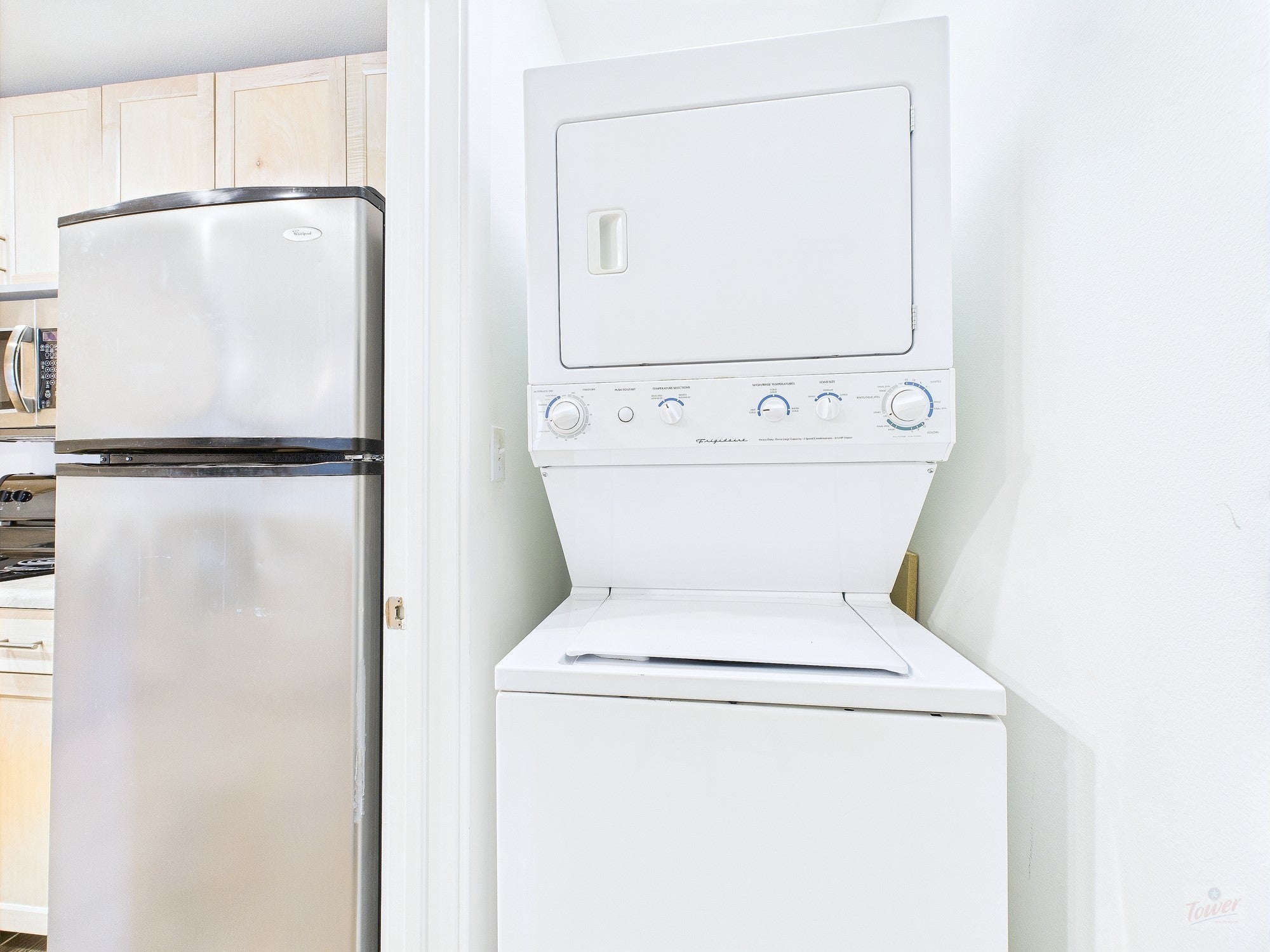 Dishwasher, Free-Standing Range, Disposal, Microwave, Refrigerator, Electric Range, Stainless Steel Appliance(s), Washer/Dryer Stacked