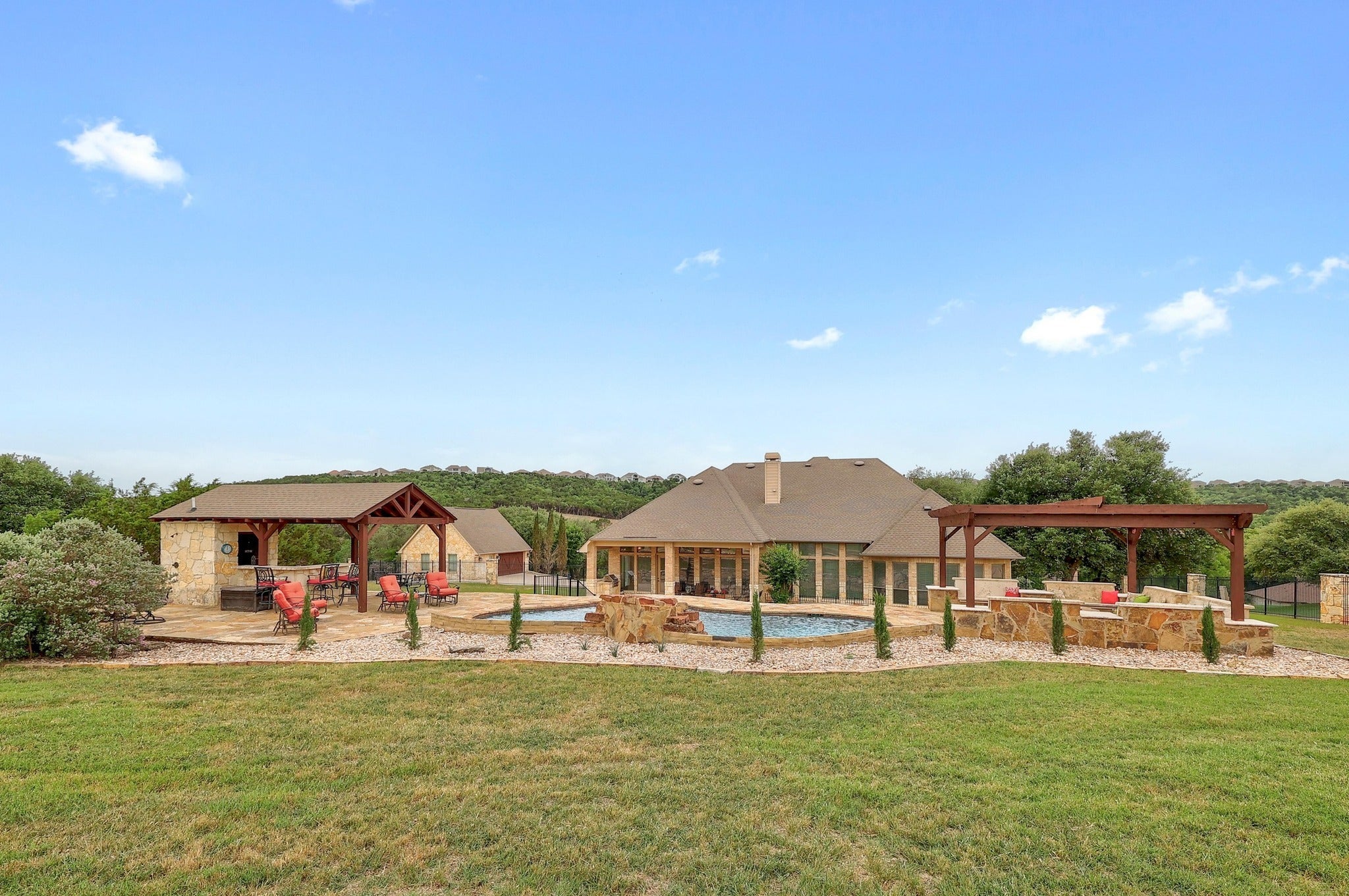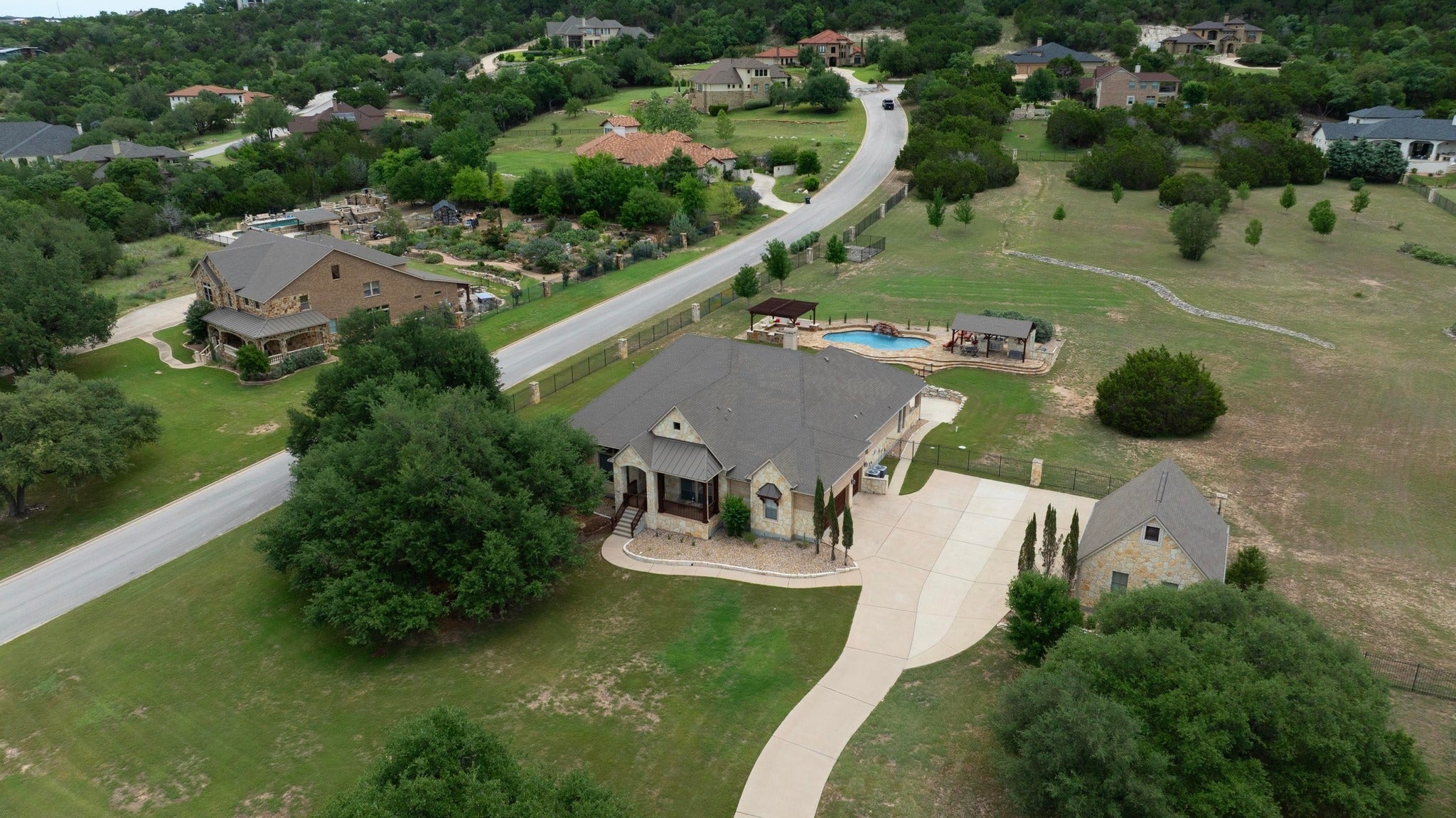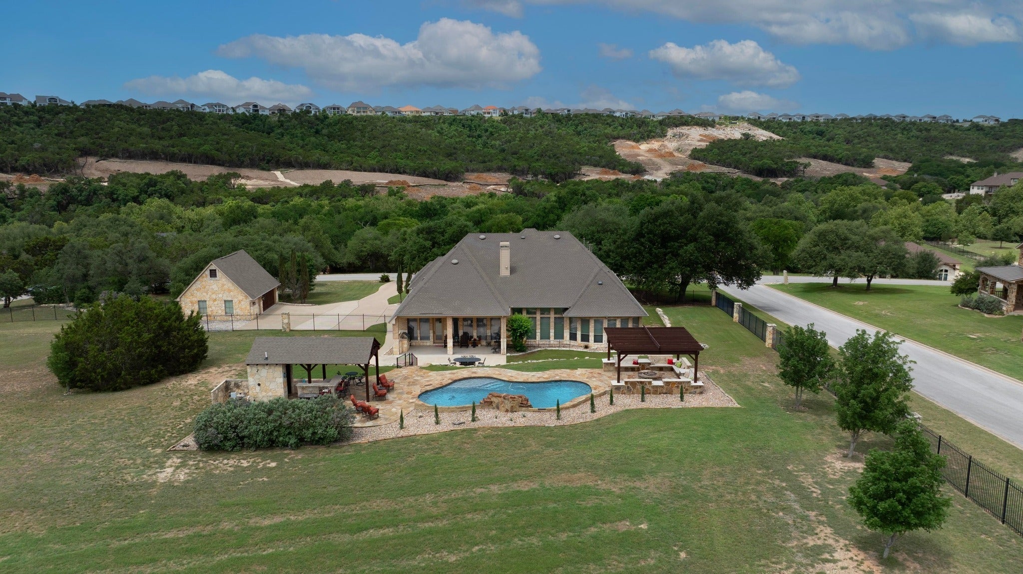 This breathtaking and spacious residence is ideally located on 4.42 beautiful acres within a beautiful Hill Country gated community. Step into the grand foyer, where towering ceilings create an inviting atmosphere that makes you feel right at home. You'll be welcomed by a spacious office adorned with French doors, while the foyer guides you toward the breathtaking formal dining room featuring elegant wood floors. The first living area awaits, offering versatility as a formal living area or game room. As you round the corner, you'll be welcomed by a spacious great room featuring 12-foot ceilings, a stunning gas fireplace, and an abundance of natural light streaming in from the floor-to-ceiling wall of windows. The spacious great room and kitchen blend seamlessly, creating an ideal environment for entertaining or maintaining connections while cooking. The primary suite boasts over 800 square feet of space, offering stunning views of the backyard. Additionally, there is a guest suite complete with its own private ensuite. Experience the outdoor paradise featuring a covered rear patio equipped with a built-in gas grill, a stunning pool adorned with a fountain, and a cabana that includes a wet bar, bath, and outdoor shower. Enjoy the spacious entertainment area under a large pergola, complete with stone benches and a gas firepit. The entire back of the property is secured by a 6' wrought iron fence, enhanced by custom white stone pillars that beautifully complement the home’s design. The property boasts stunning landscaping, adorned with numerous oak trees and 18 maple trees that burst into vibrant colors each Fall. Furthermore, there is an additional two-car garage equipped with a storage loft, perfect for stowing away your off-season belongings. For equestrian enthusiasts, the Homeowners Association (HOA) permits property owners to keep a horse on the estate, thanks to the ample size of the property. New roof, gutters and vents replace November 20025.
