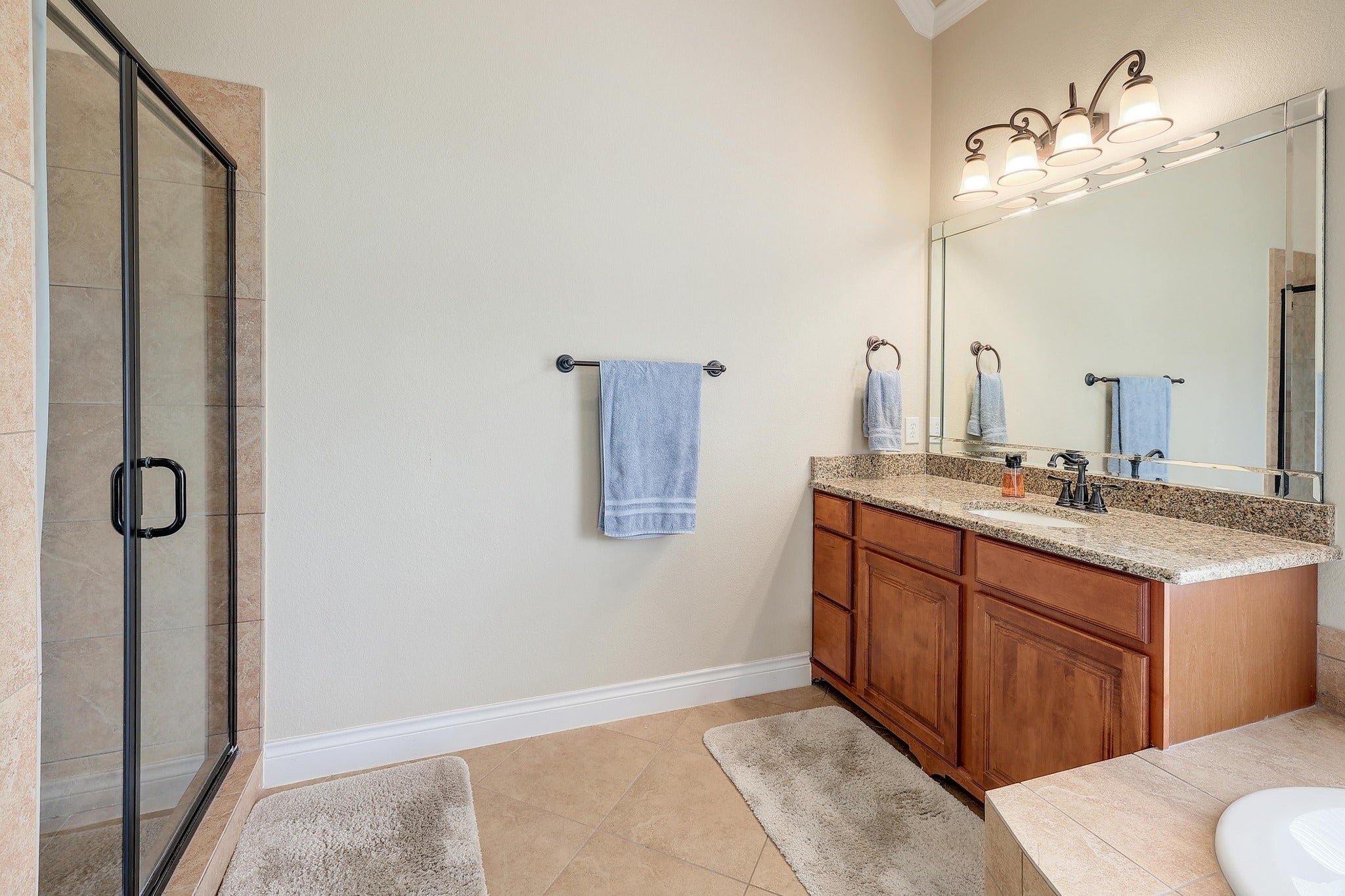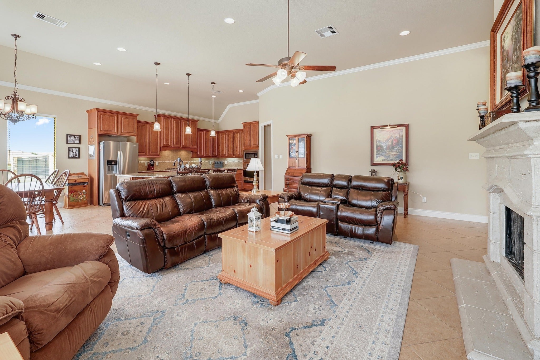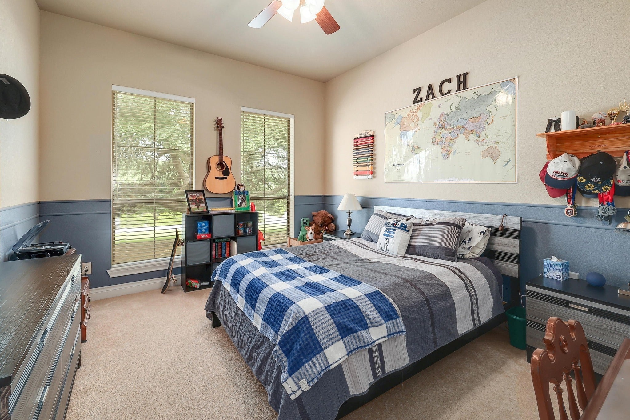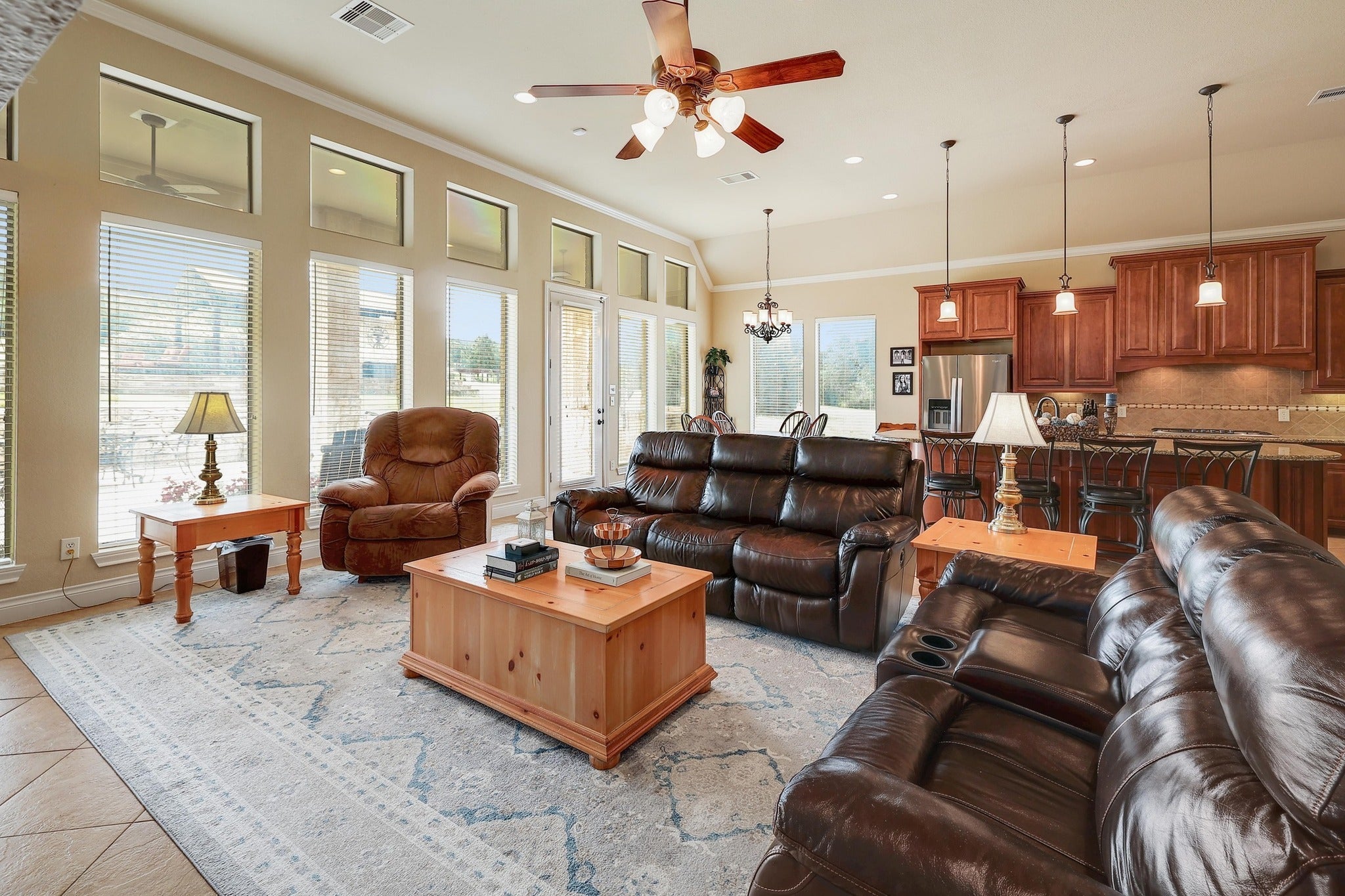 This breathtaking and spacious residence is ideally located on 4.42 beautiful acres within a beautiful Hill Country gated community. Step into the grand foyer, where towering ceilings create an inviting atmosphere that makes you feel right at home. You'll be welcomed by a spacious office adorned with French doors, while the foyer guides you toward the breathtaking formal dining room featuring elegant wood floors. The first living area awaits, offering versatility as a formal living area or game room. As you round the corner, you'll be welcomed by a spacious great room featuring 12-foot ceilings, a stunning gas fireplace, and an abundance of natural light streaming in from the floor-to-ceiling wall of windows. The spacious great room and kitchen blend seamlessly, creating an ideal environment for entertaining or maintaining connections while cooking. The primary suite boasts over 800 square feet of space, offering stunning views of the backyard. Additionally, there is a guest suite complete with its own private ensuite. Experience the outdoor paradise featuring a covered rear patio equipped with a built-in gas grill, a stunning pool adorned with a fountain, and a cabana that includes a wet bar, bath, and outdoor shower. Enjoy the spacious entertainment area under a large pergola, complete with stone benches and a gas firepit. The entire back of the property is secured by a 6' wrought iron fence, enhanced by custom white stone pillars that beautifully complement the home’s design. The property boasts stunning landscaping, adorned with numerous oak trees and 18 maple trees that burst into vibrant colors each Fall. Furthermore, there is an additional two-car garage equipped with a storage loft, perfect for stowing away your off-season belongings. For equestrian enthusiasts, the Homeowners Association (HOA) permits property owners to keep a horse on the estate, thanks to the ample size of the property. New roof, gutters and vents replace November 20025.