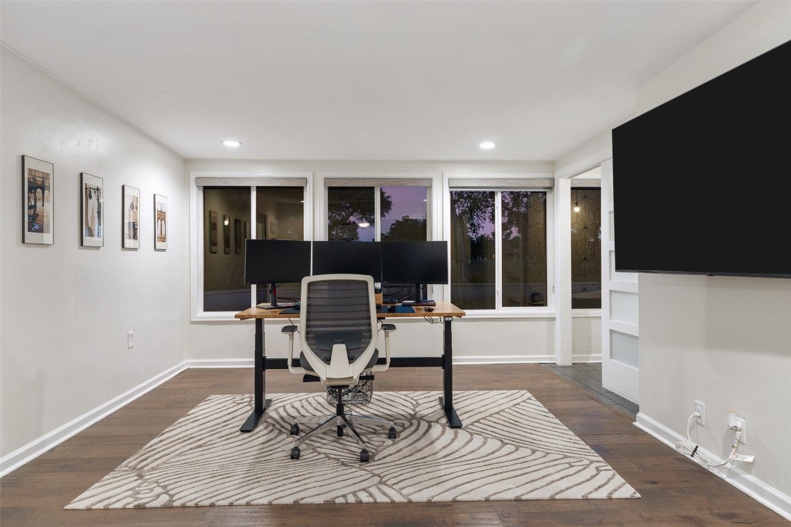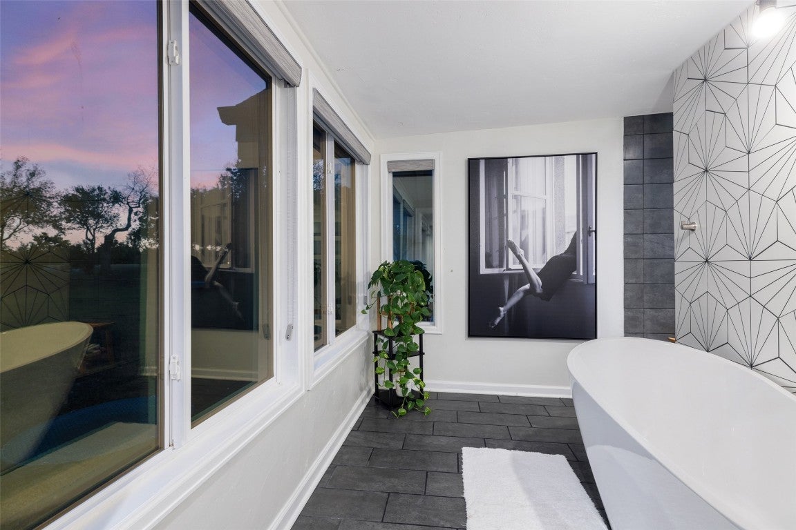 As the sun dips behind the Texas hills and golden light spills across the fairways, you’ll feel the quiet magic of coming home to 915 Biscayne—a beautifully updated single-level retreat in the heart of old Lakeway, where architectural elegance meets everyday ease. Thoughtfully reimagined, this home offers an inspired blend of natural textures, modern upgrades, and effortless indoor-outdoor living on a serene, golf course lot. Inside, soaring cathedral ceilings crown the expansive living, kitchen, and dining areas, creating a sense of volume and openness beneath a canopy of natural light. Epoxy-coated concrete floors lend an industrial-modern polish to the main living spaces, while wood floors in all bedrooms offer warmth without a stitch of carpet in sight. The kitchen is both sculptural and functional, with quartz countertops, rich cabinetry, and stainless appliances all designed to gather around. Floor-to-ceiling windows bring in treetop and fairway views, blurring the line between interior calm and exterior beauty. The primary suite is a private sanctuary with a spa-like ensuite bath, soaking tub with views, dual vanities, and a walk-in closet. Two additional bedrooms plus a versatile fourth—ideal as a home office or gym—offer flexible space for rest, work, or play. Both bathrooms have been tastefully renovated, with clean lines and timeless finishes. Step outside and imagine the possibilities: the backyard opens directly to the golf course and offers ample room for a future pool or outdoor living area, framed by mature oaks and gently sloping greens. A finished two-car garage, solar panels, and full MUD utilities (no septic) add both comfort and long-term efficiency. Located within acclaimed Lake Travis ISD, and close to Lakeway’s parks, trails, and community amenities, this home is perfectly positioned for both tranquility and connection. Come see what it feels like to live where soaring architecture meets grounded, graceful living. Photos digitally enhanced.